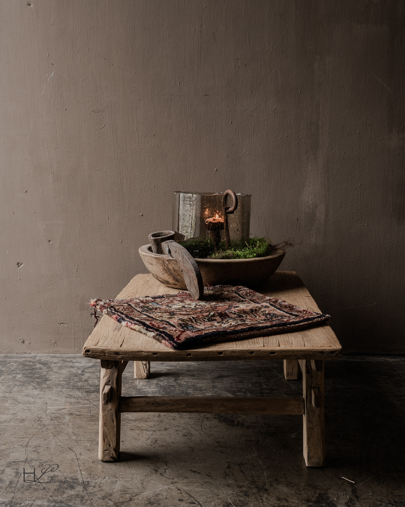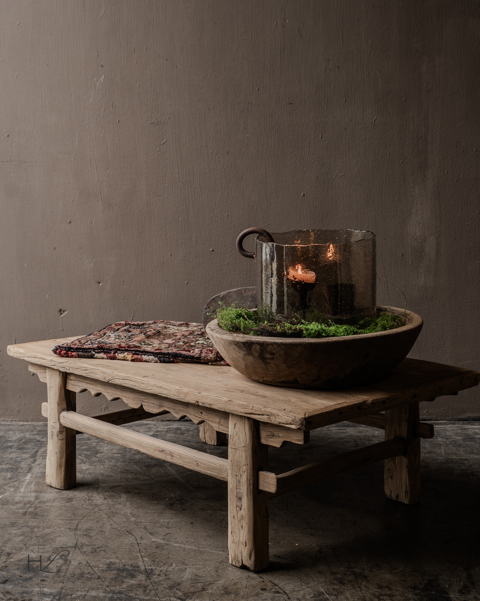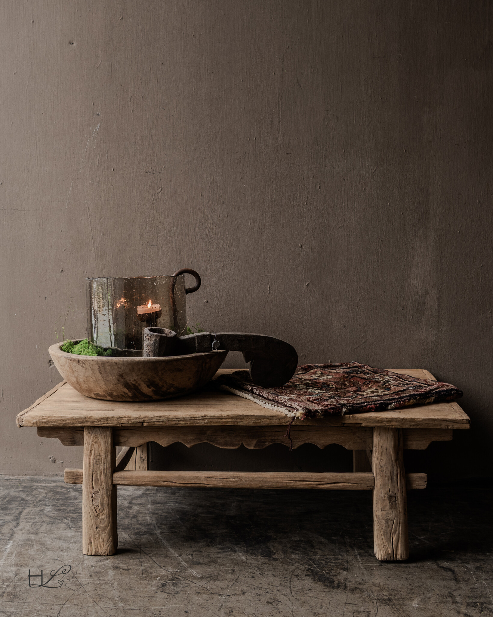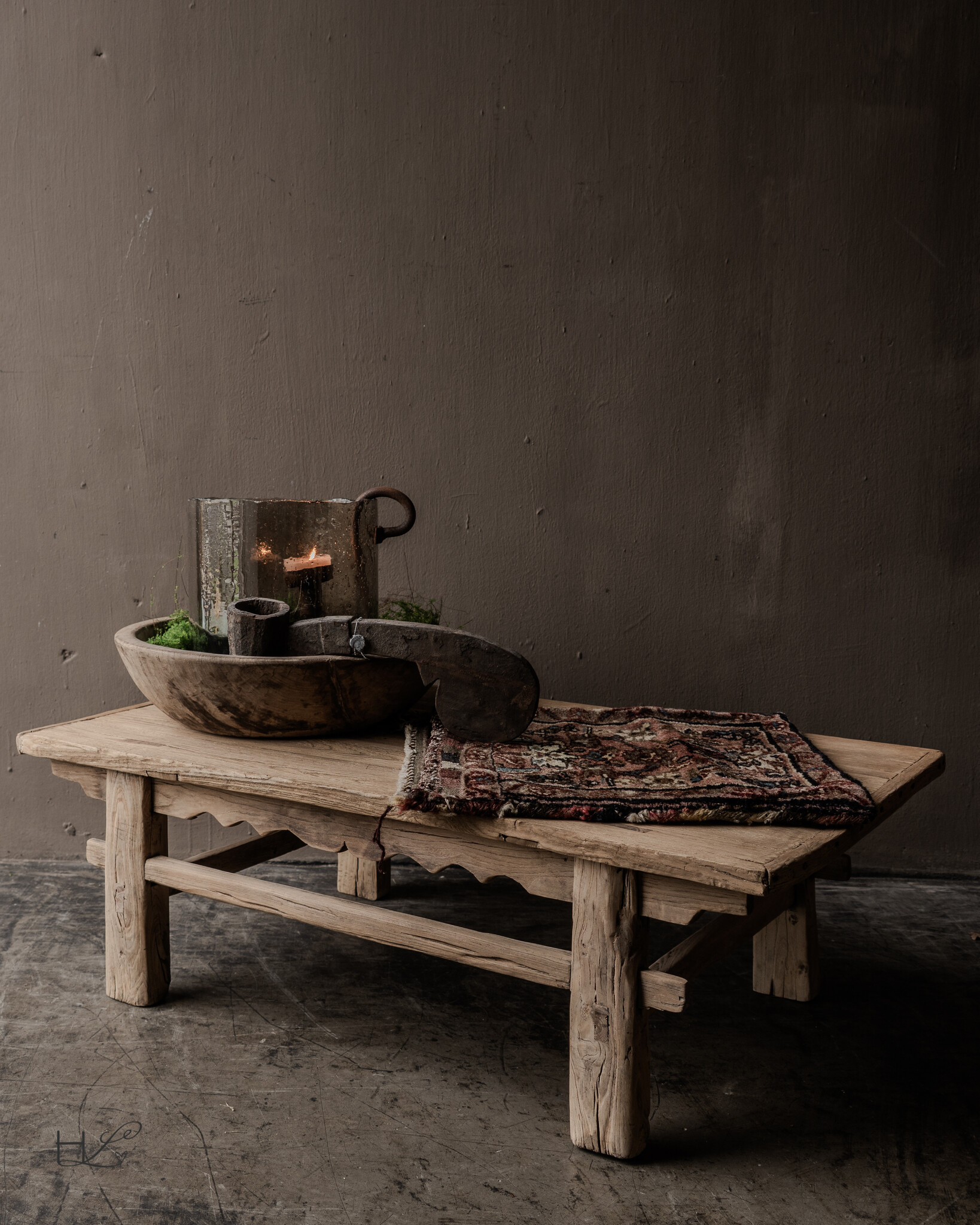 Dieser kleine, niedrige Couchtisch ist aus authentischem, altem Ulmenholz gefertigt und besticht durch seine wunderschöne, gealterte Optik. Das Holz wurde im Laufe der Zeit geformt und trägt die Spuren jahrelanger Nutzung, wodurch jeder Tisch zu einem Unikat wird.