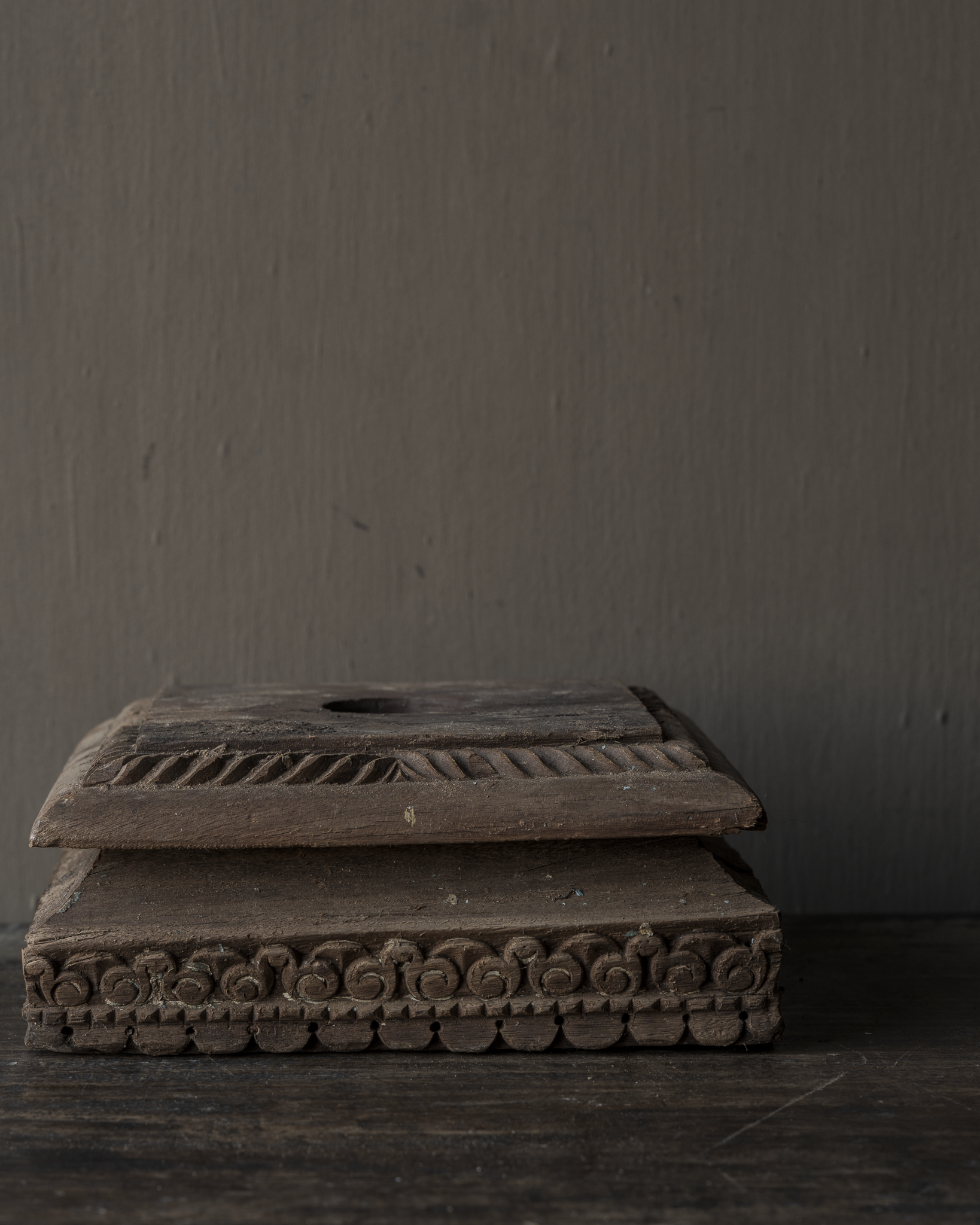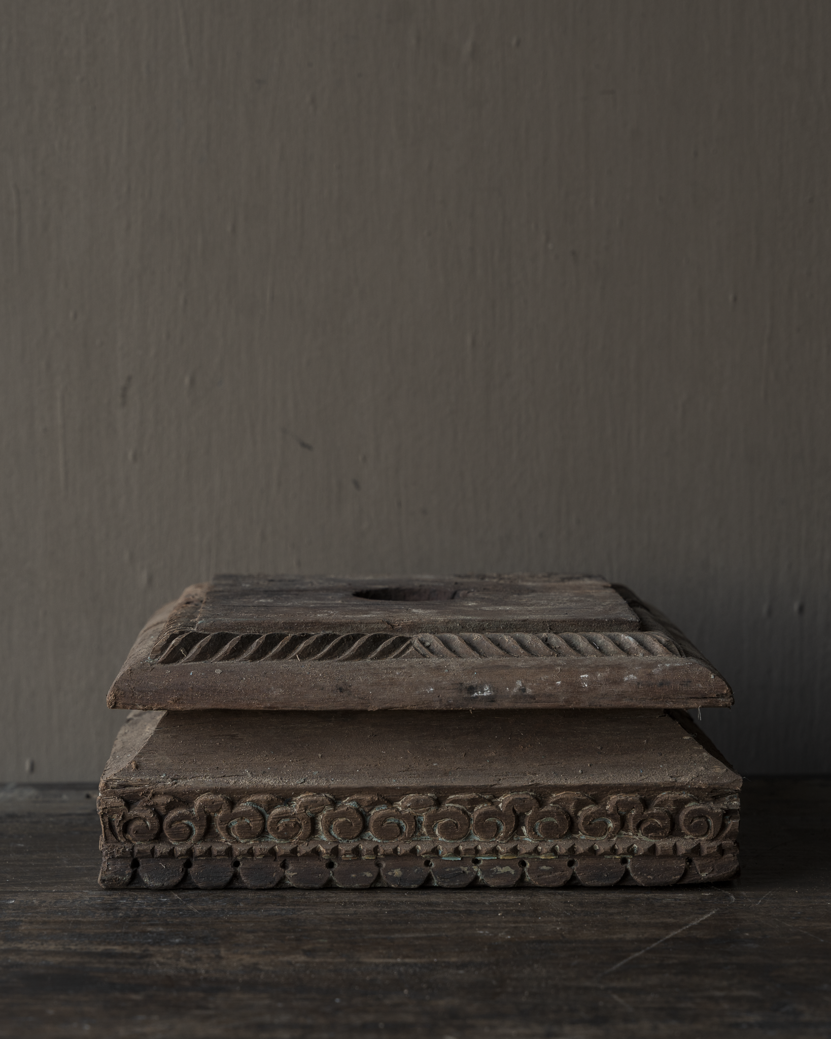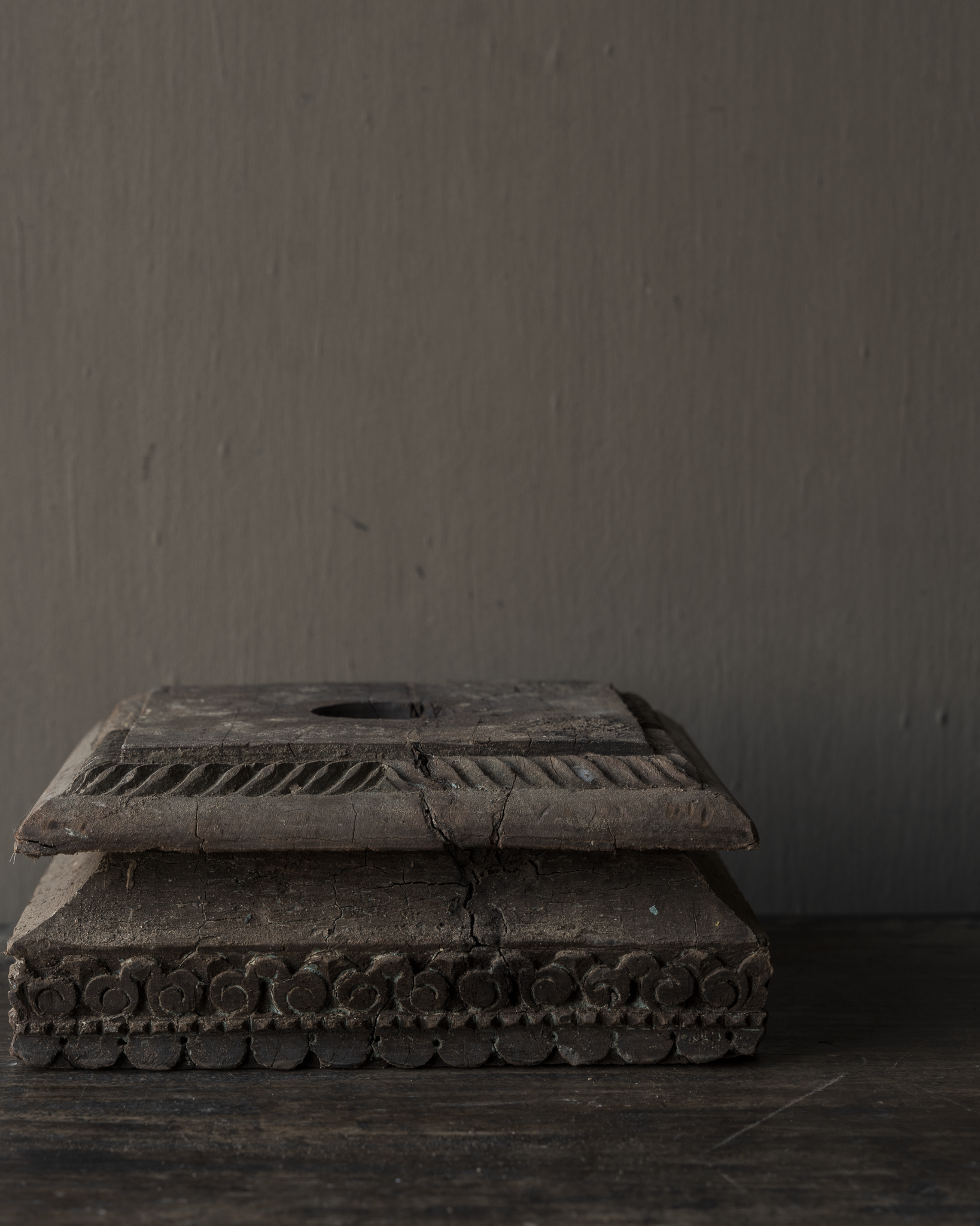 Der natürliche Holzton und die matte, leicht gealterte Oberfläche lassen diesen Sockel mühelos in rustikale, zurückhaltende, Wabi-Sabi- und ruhige Interieurs einfügen. Er drängt sich nicht in den Vordergrund, sondern schafft durch seine Schlichtheit eine angenehme Atmosphäre.