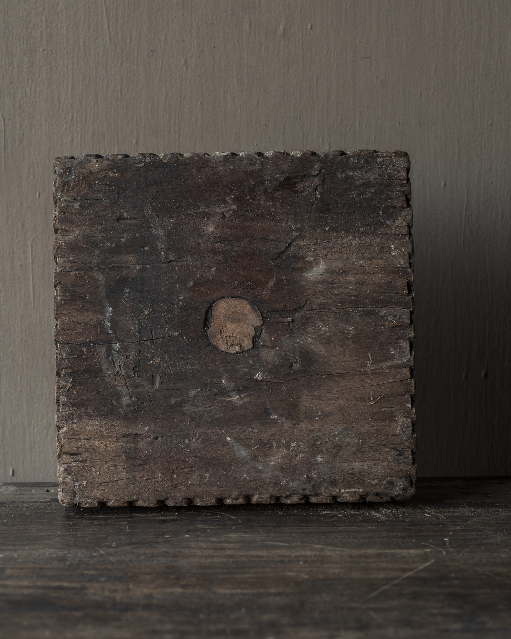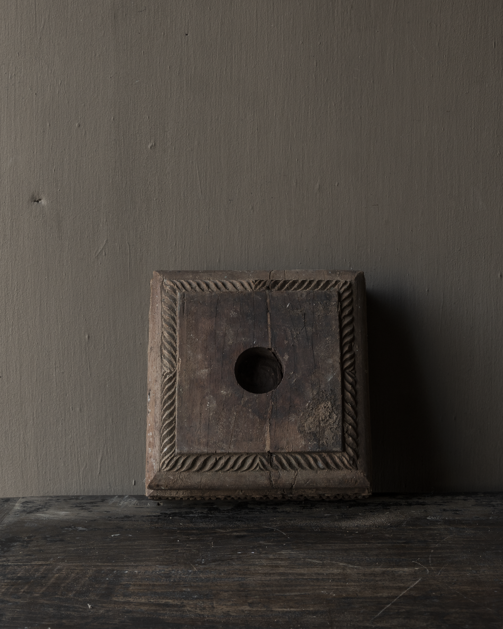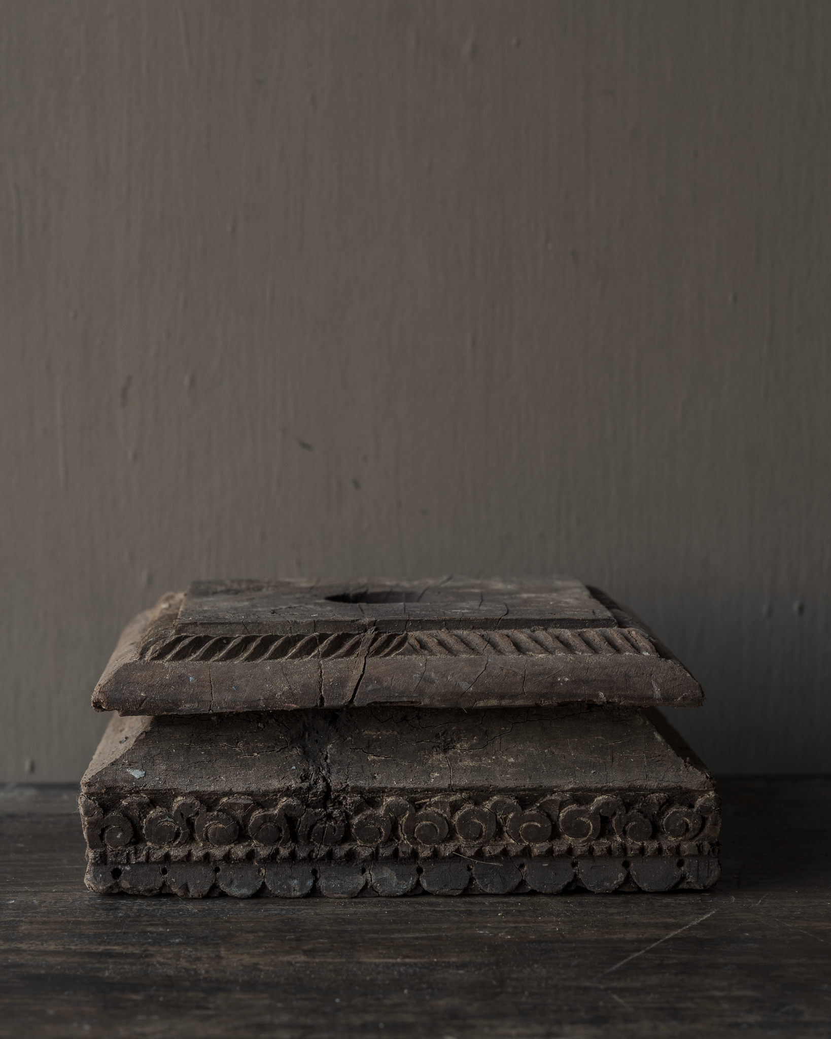 Der natürliche Holzton und die matte, leicht gealterte Oberfläche lassen diesen Sockel mühelos in rustikale, zurückhaltende, Wabi-Sabi- und ruhige Interieurs einfügen. Er drängt sich nicht in den Vordergrund, sondern schafft durch seine Schlichtheit eine angenehme Atmosphäre.