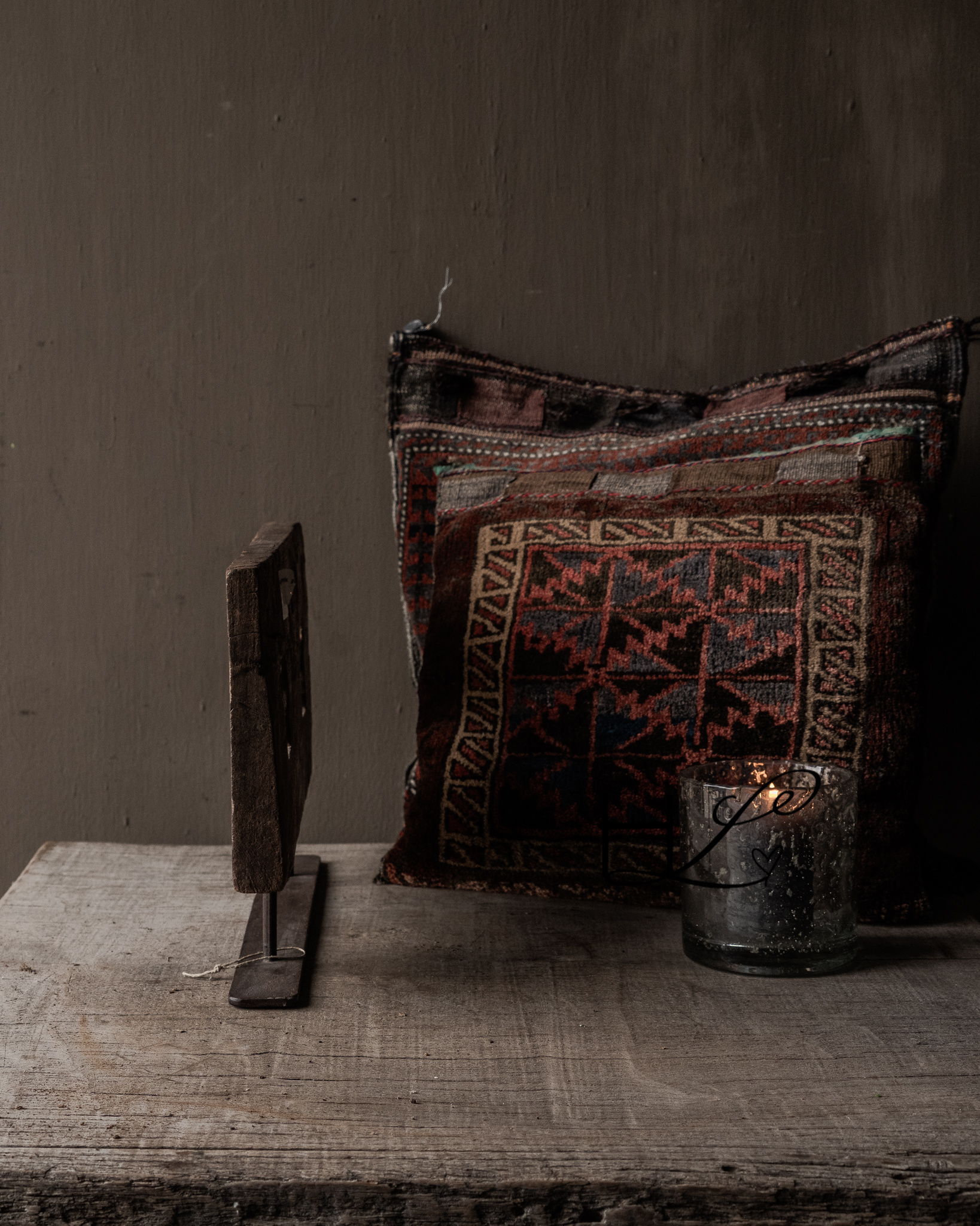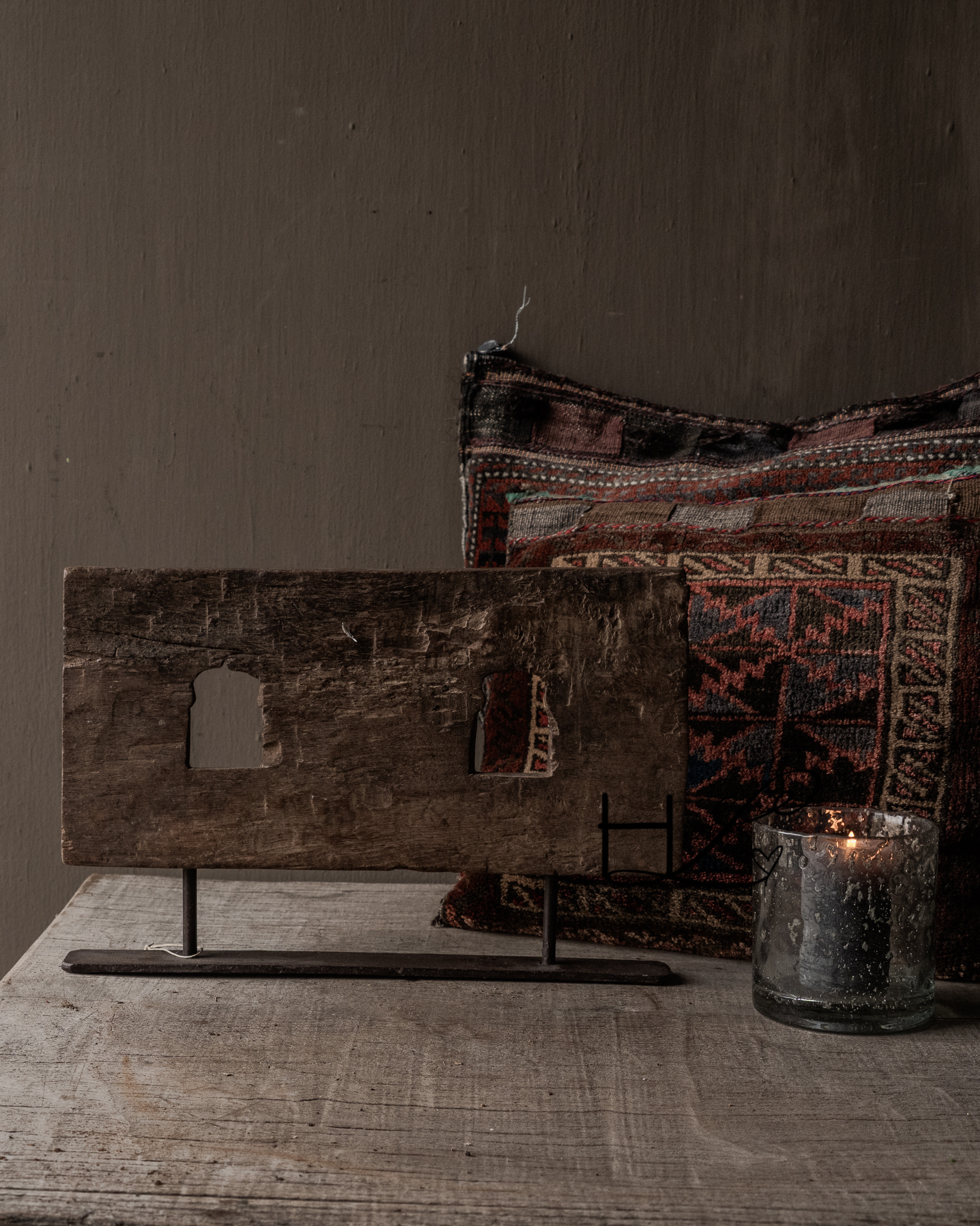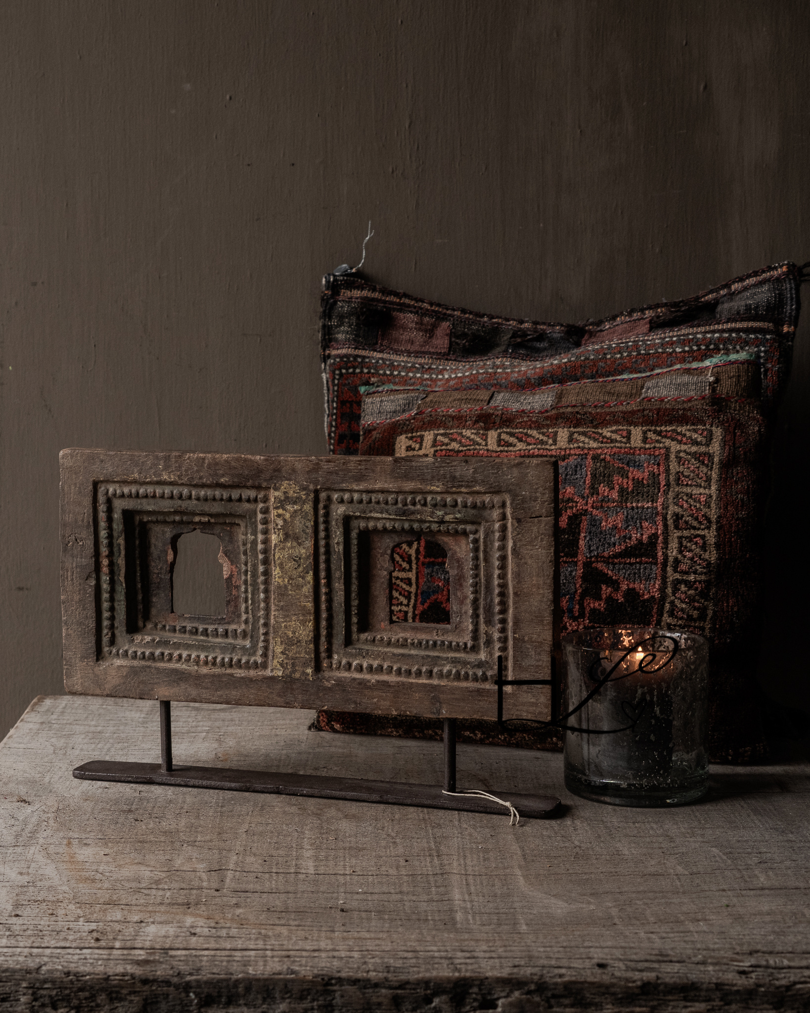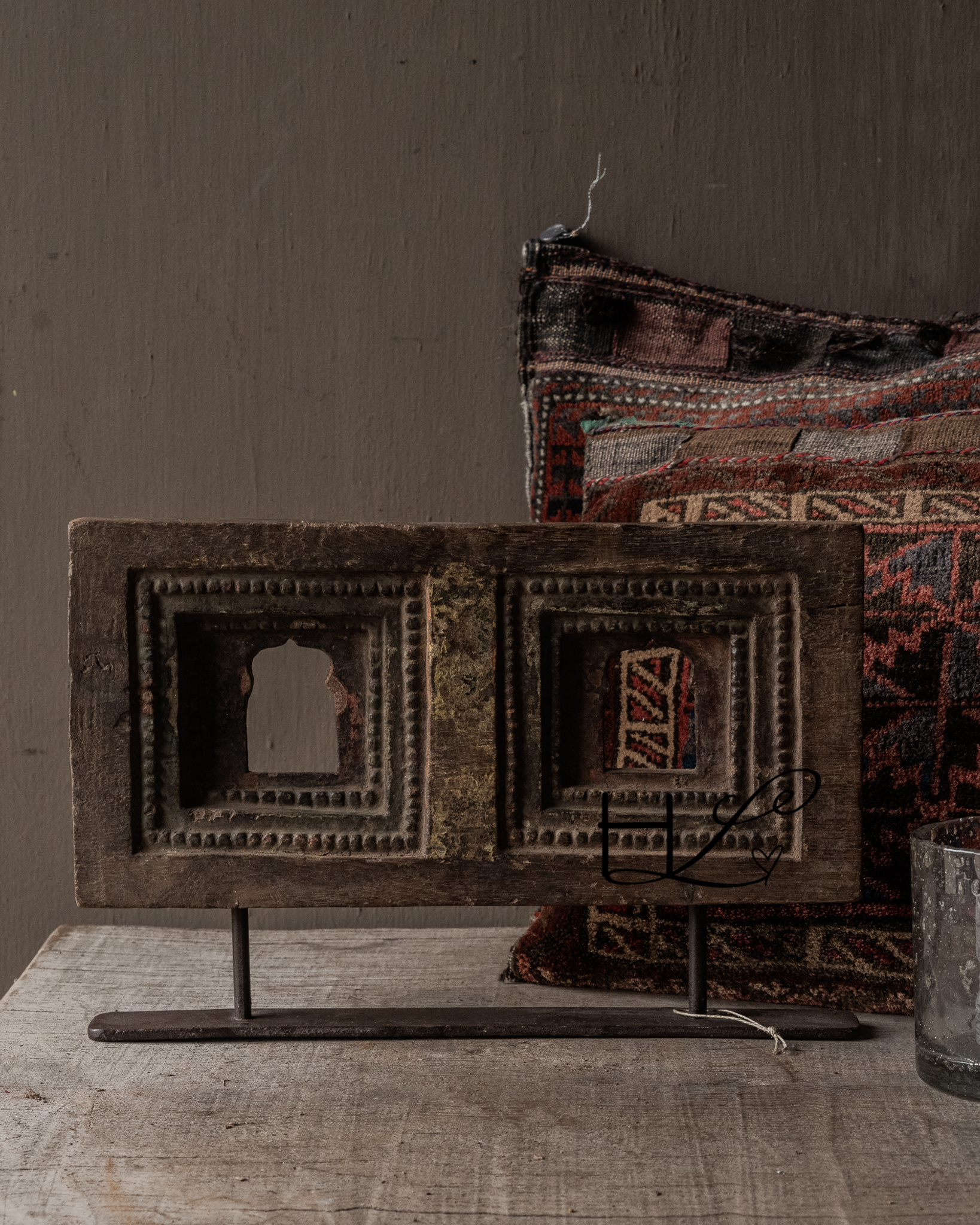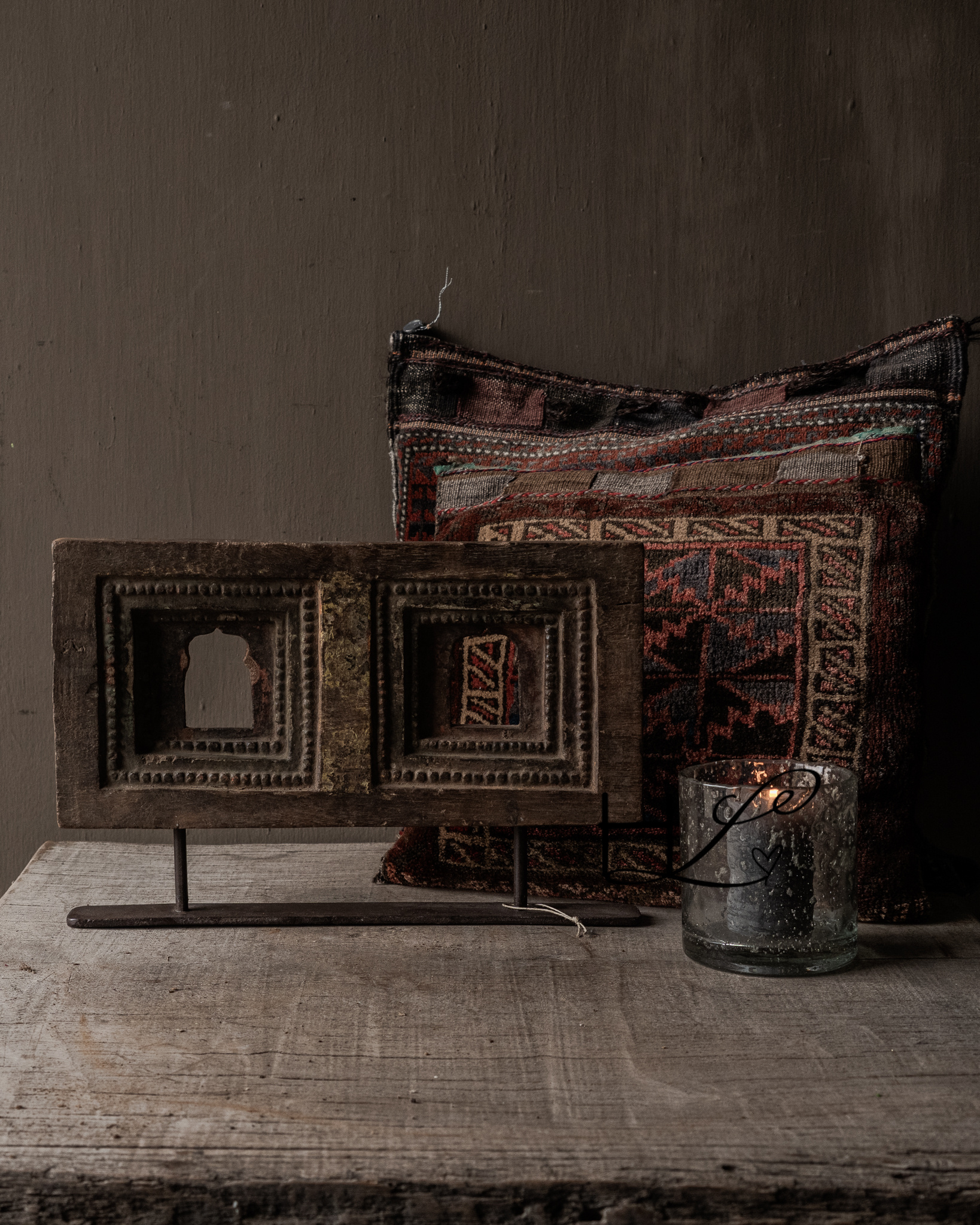Dieses einzigartige, antike Holzornament auf einem Ständer ist ein charaktervolles und authentisches Dekorationsobjekt mit einer edlen Optik. Es ist aus altem Holz gefertigt und zeichnet sich durch wunderschöne, handgeschnitzte Details, dezente Maserungen und eine verwitterte Oberfläche aus, die Ihrem Interieur sofort eine besondere Atmosphäre verleiht.