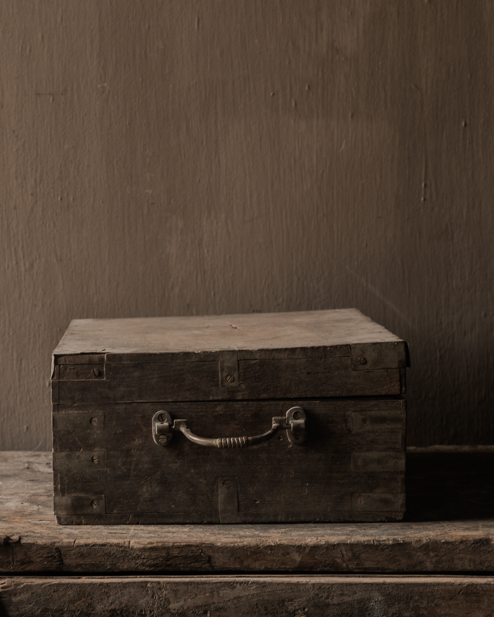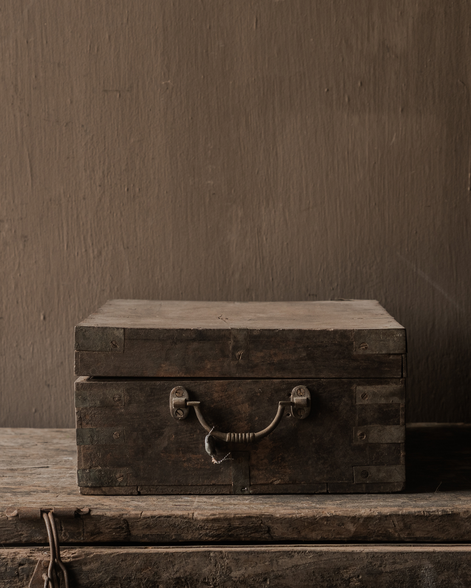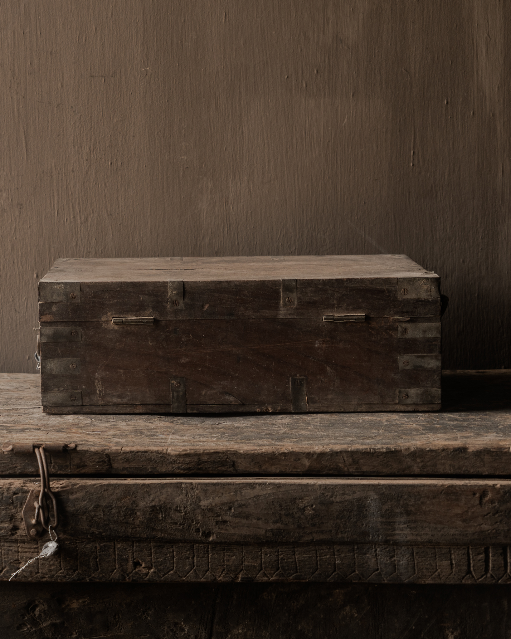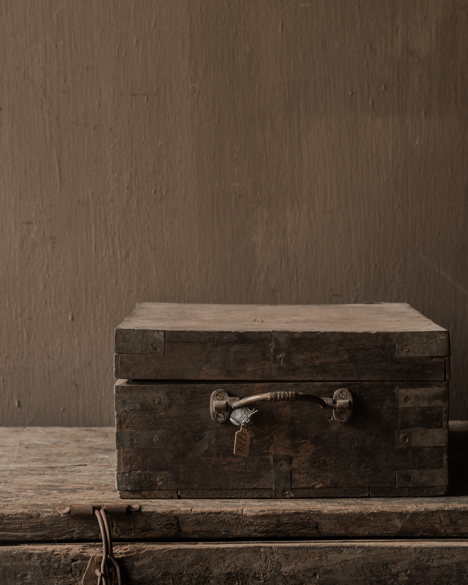 Diese authentische Holztruhe von Hoffz versprüht Charakter und Geschichte. Das verwitterte Holz, die robusten Metalldetails und die warmen, dunklen Farbtöne machen sie zu einem besonderen und einzigartigen Stück.