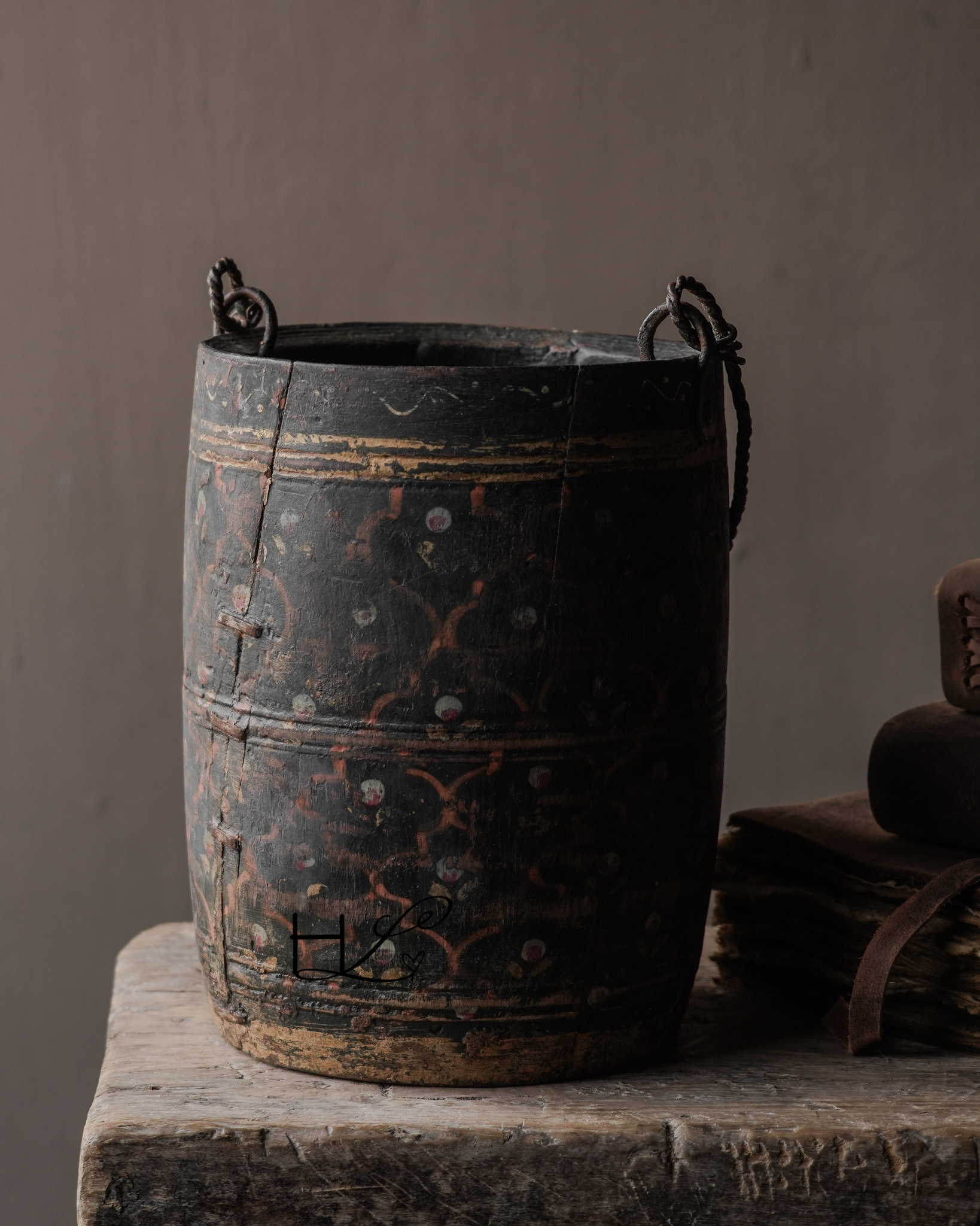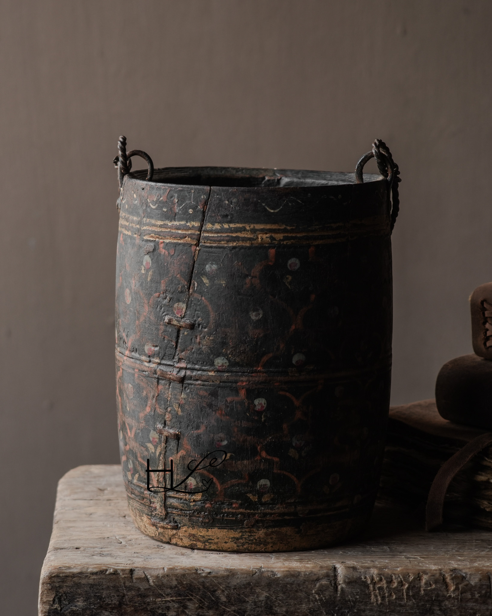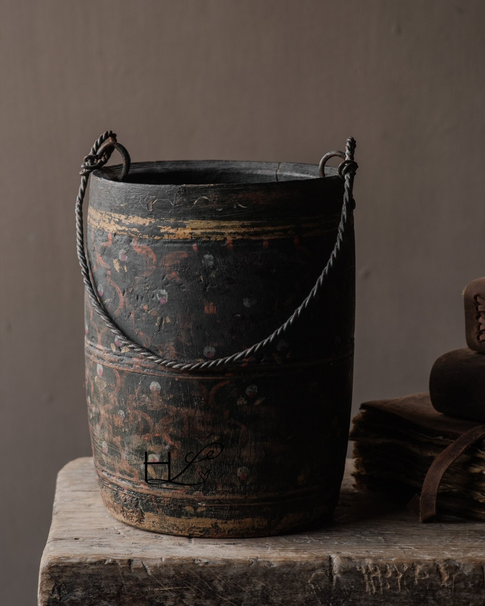 Die dunkle, verwitterte Farbe, die handbemalten Details und der gedrehte Metallgriff verleihen diesem Topf ein einzigartiges und unverwechselbares Aussehen. Durch den häufigen Gebrauch im Alltag hat das Holz eine wunderschöne, gealterte Patina entwickelt.