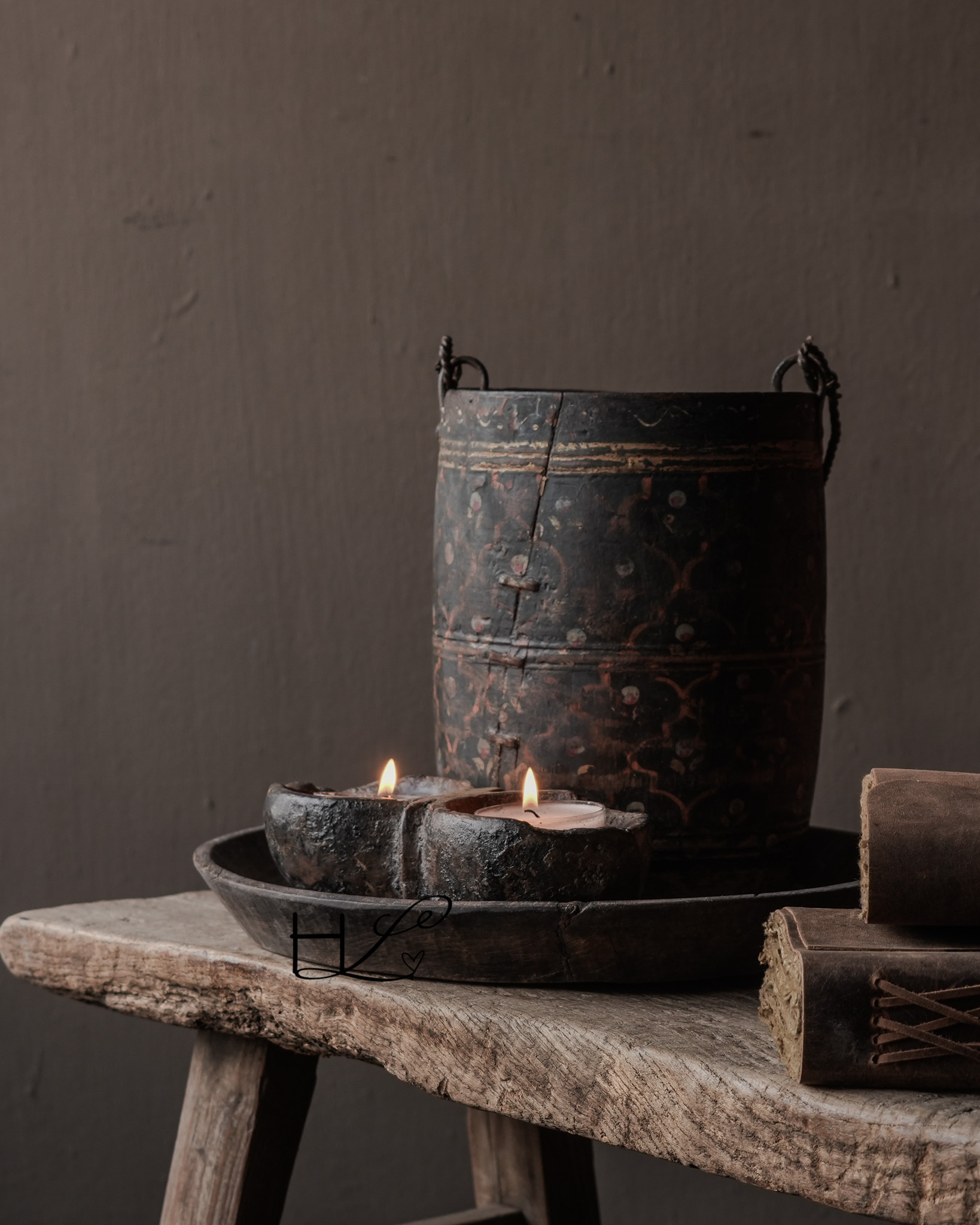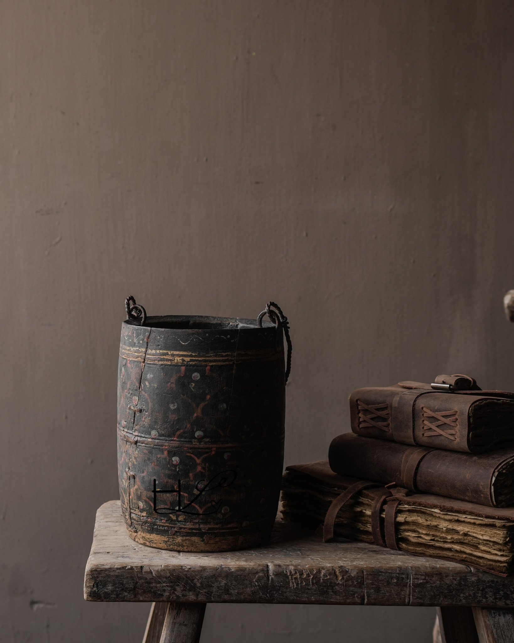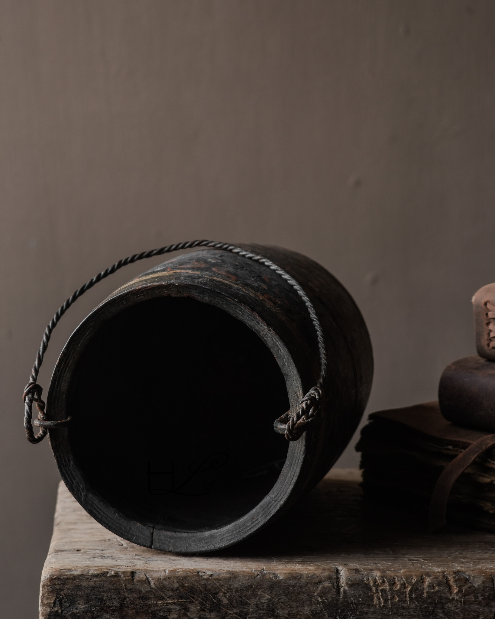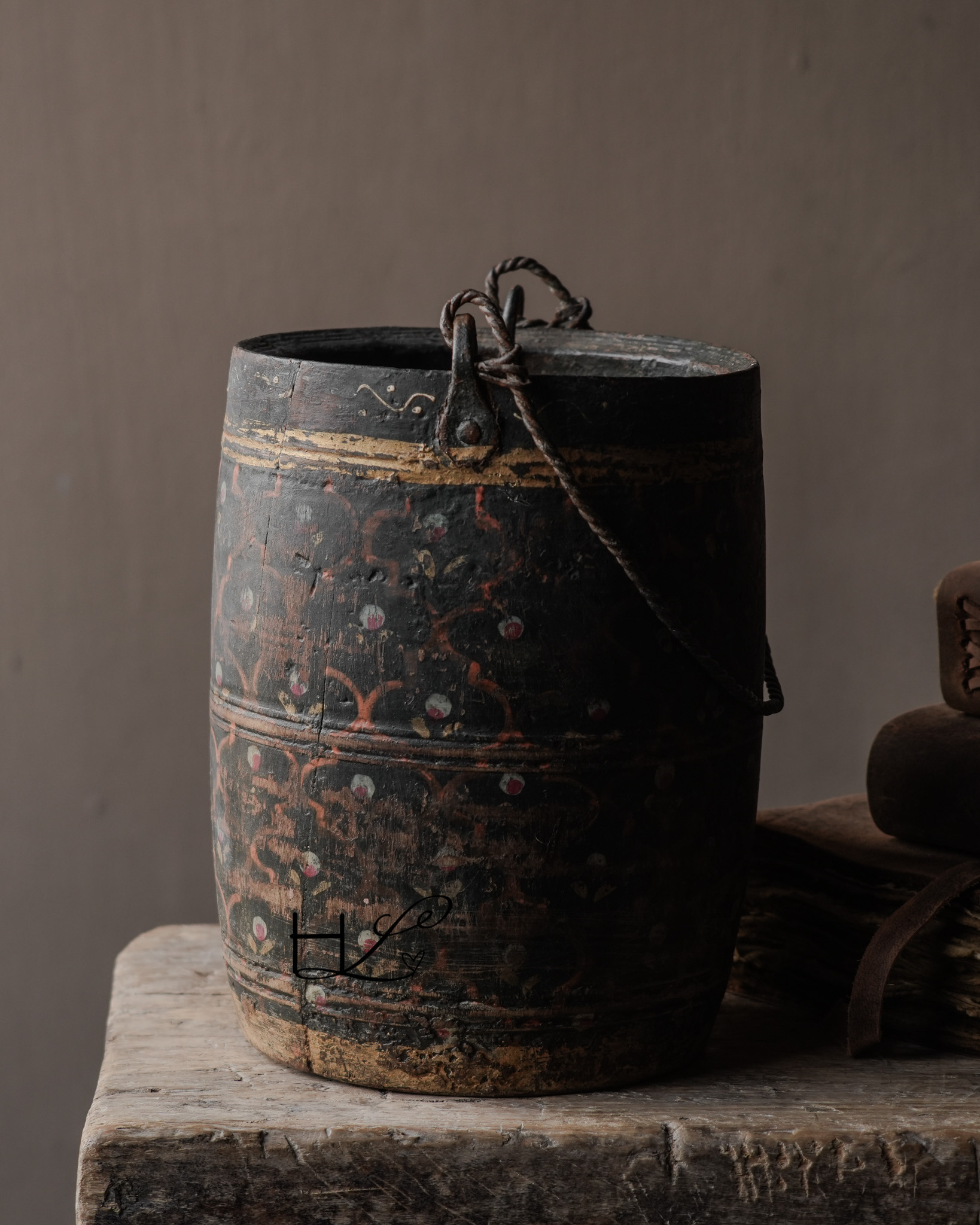 Die dunkle, verwitterte Farbe, die handbemalten Details und der gedrehte Metallgriff verleihen diesem Topf ein einzigartiges und unverwechselbares Aussehen. Durch den häufigen Gebrauch im Alltag hat das Holz eine wunderschöne, gealterte Patina entwickelt.