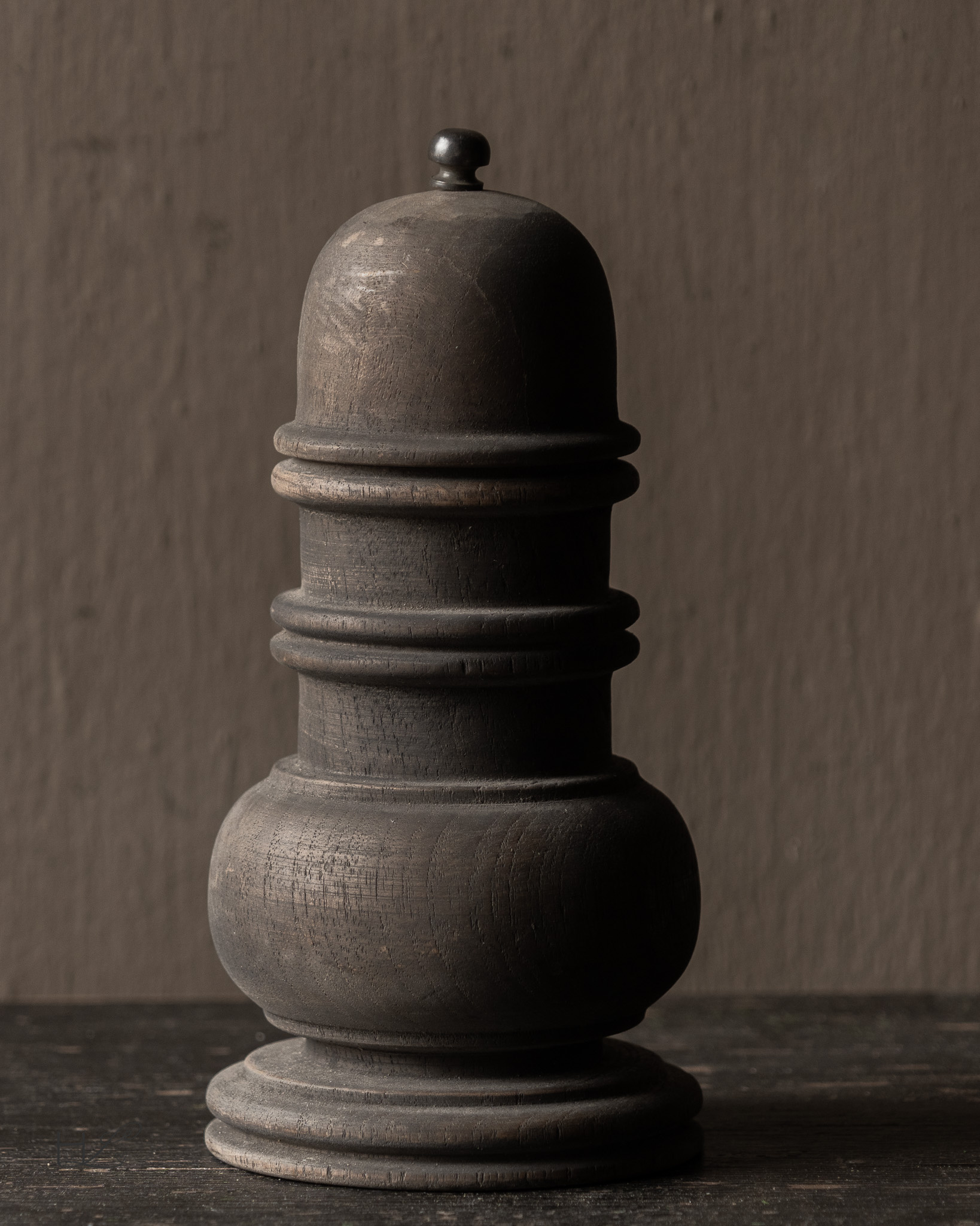 Dieses charaktervolle Holzgefäß mit Deckel von Aura Peeperkorn ist ein wunderschönes Dekorationsobjekt mit schlichtem, rustikalem Charme. Das Gefäß ist aus Massivholz gefertigt und in einem dunklen, patinierten Farbton gehalten.