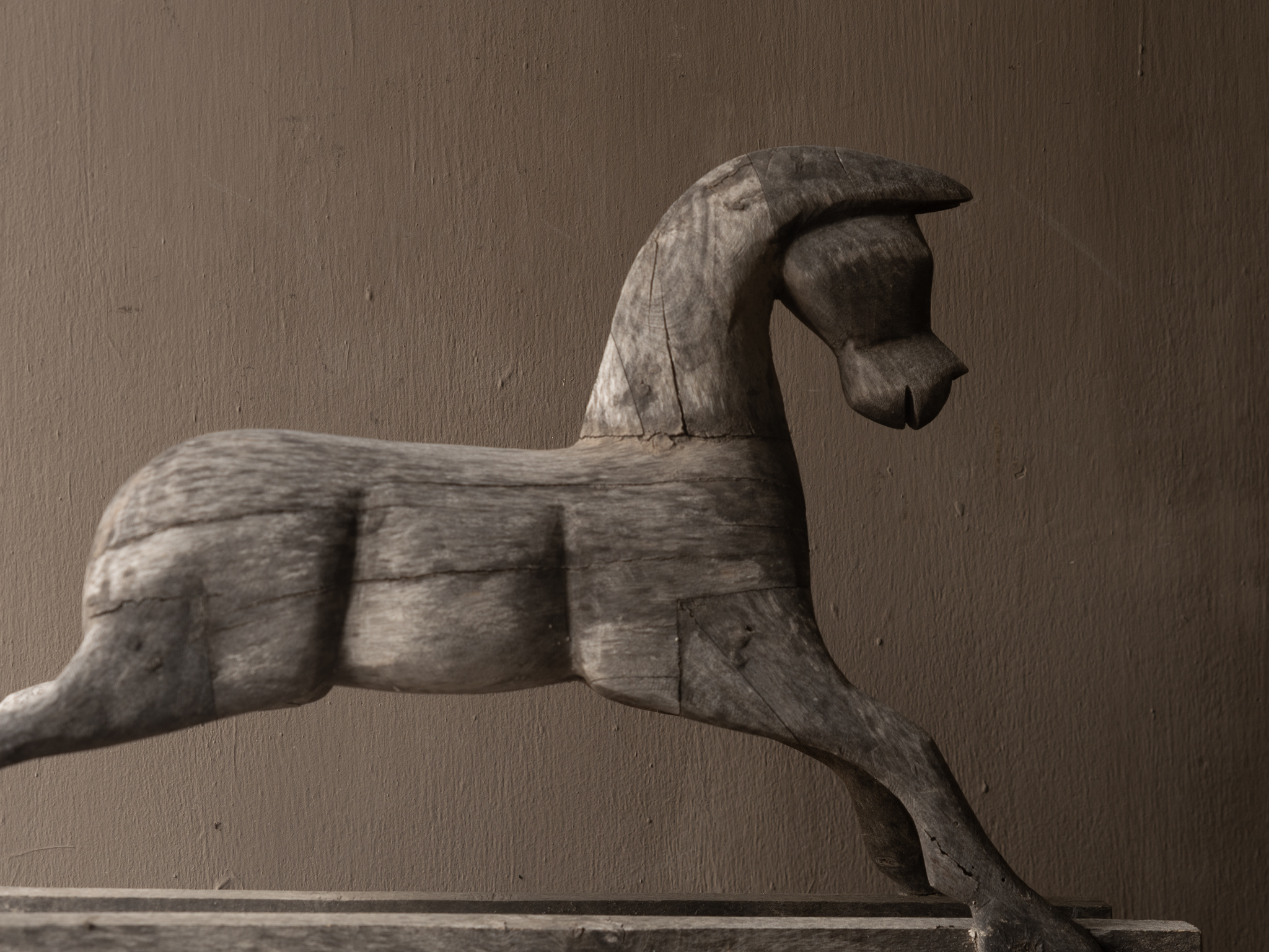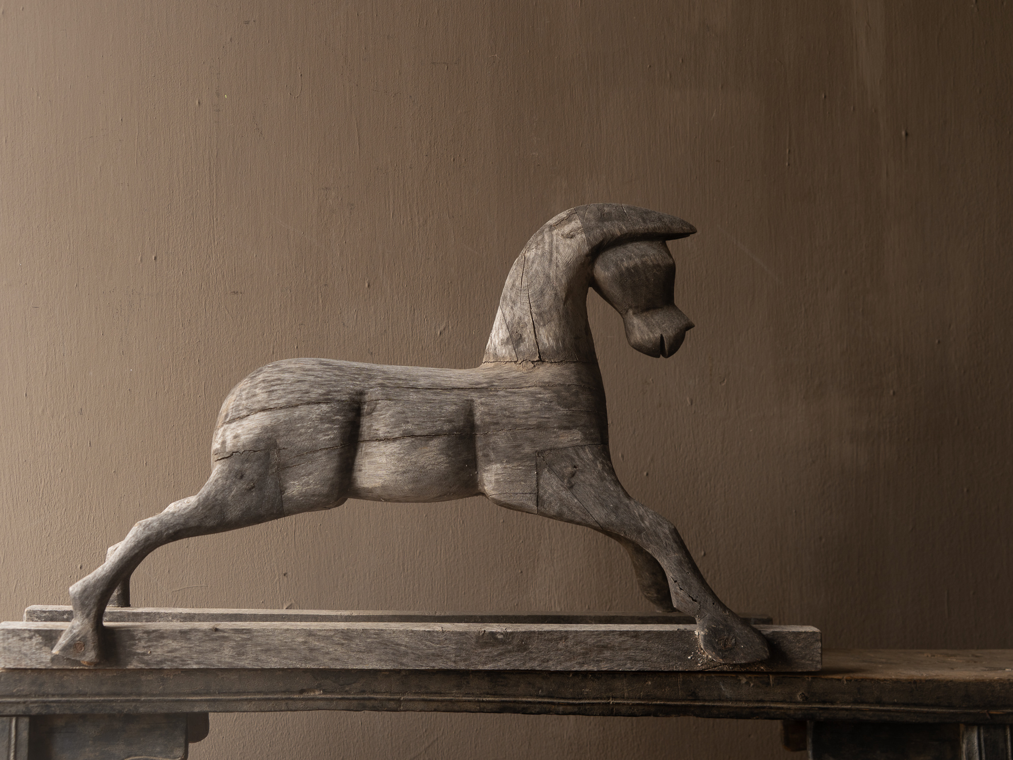 Wunderschönes, großes, altes Holzpferd mit kraftvoller, strenger Ausstrahlung. Dieses einzigartige Ornament ist handgefertigt und hat im Laufe der Jahre eine wunderschöne, verwitterte Patina entwickelt.