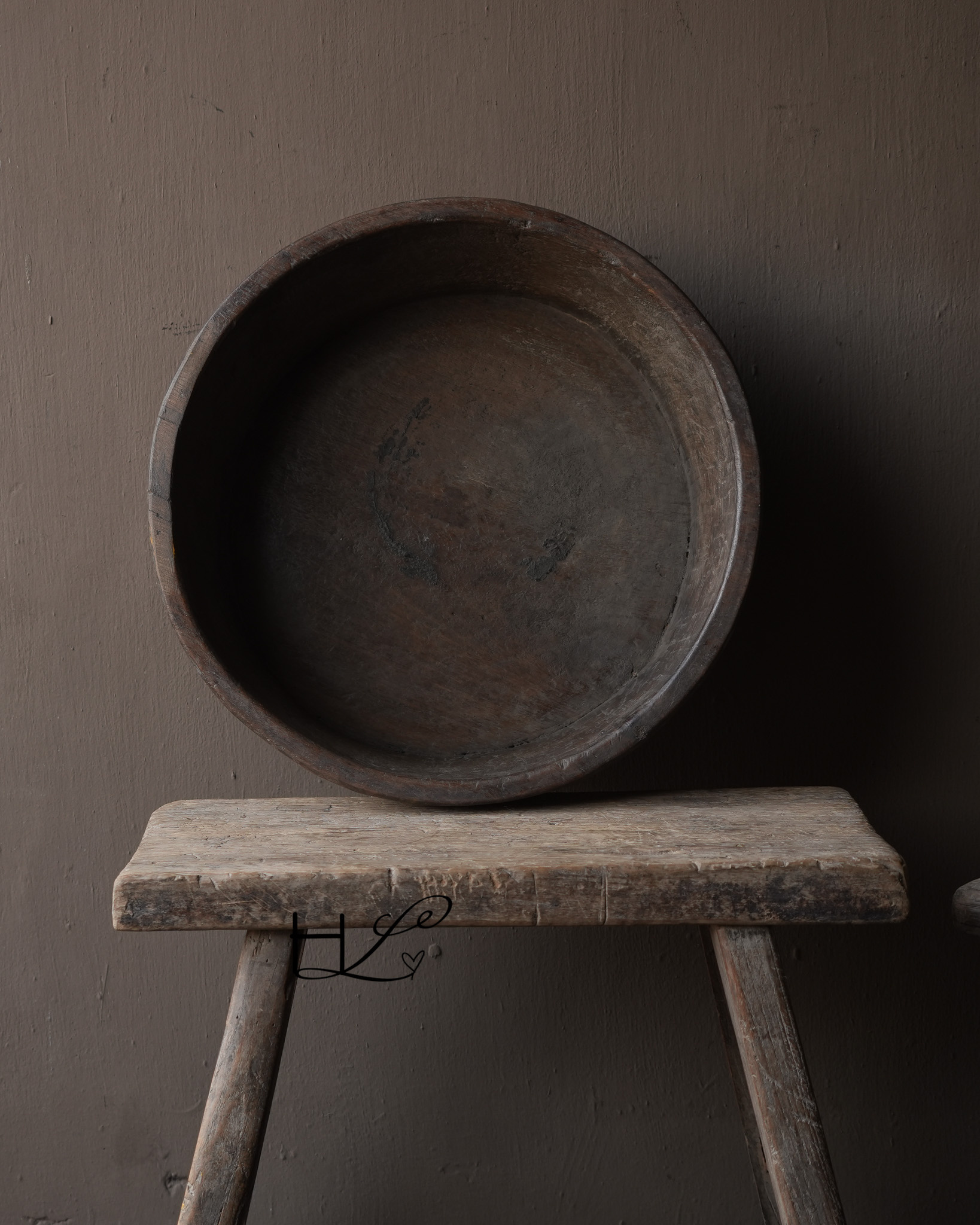 Die Schale besticht durch ihren schönen, breiten Rand und den flachen Boden , wodurch sie stabil steht und sich perfekt für dekorative Zwecke eignet. Die warmen, dunklen Holztöne und die dezenten Gebrauchsspuren verleihen diesem Stück einen authentischen Charakter.