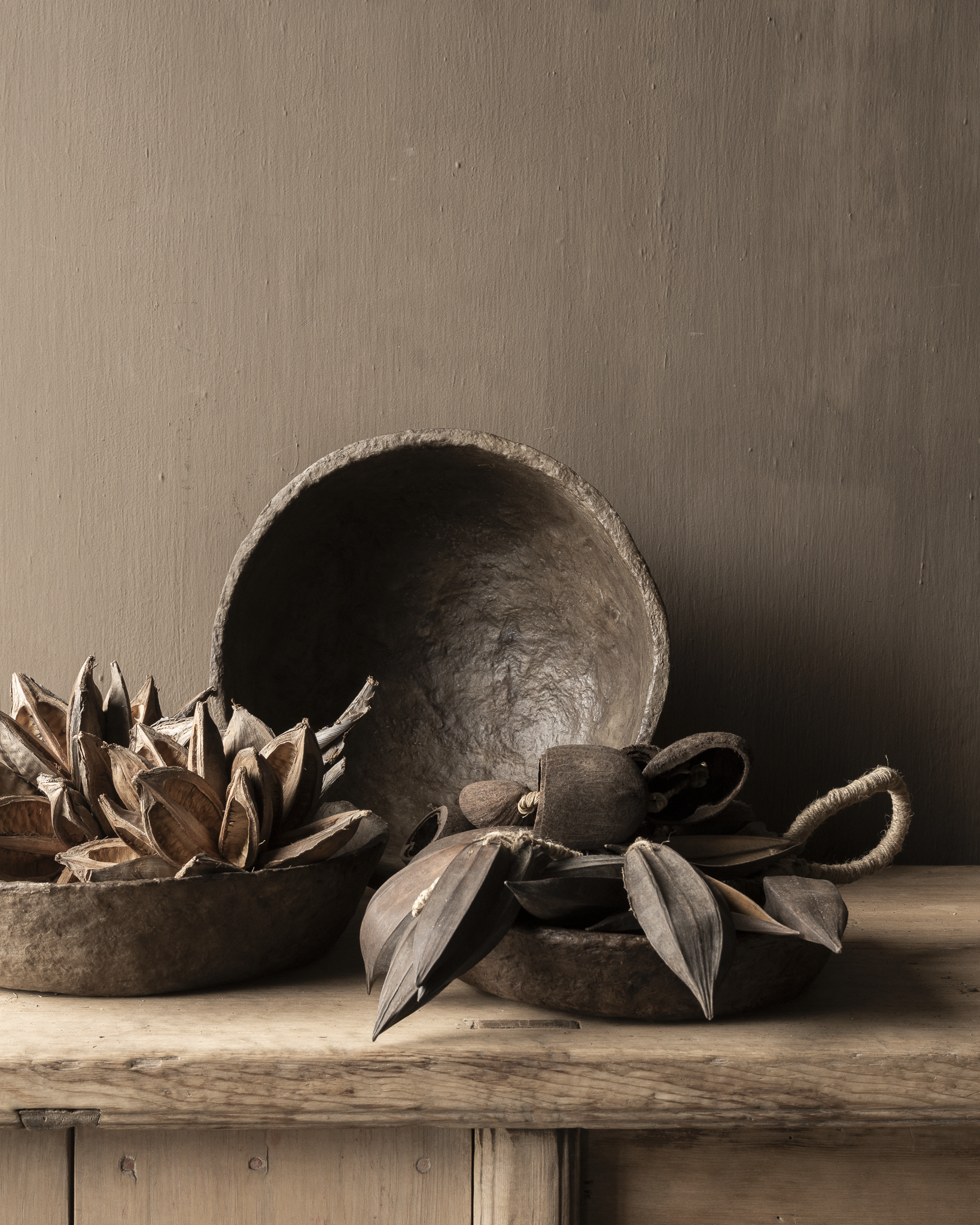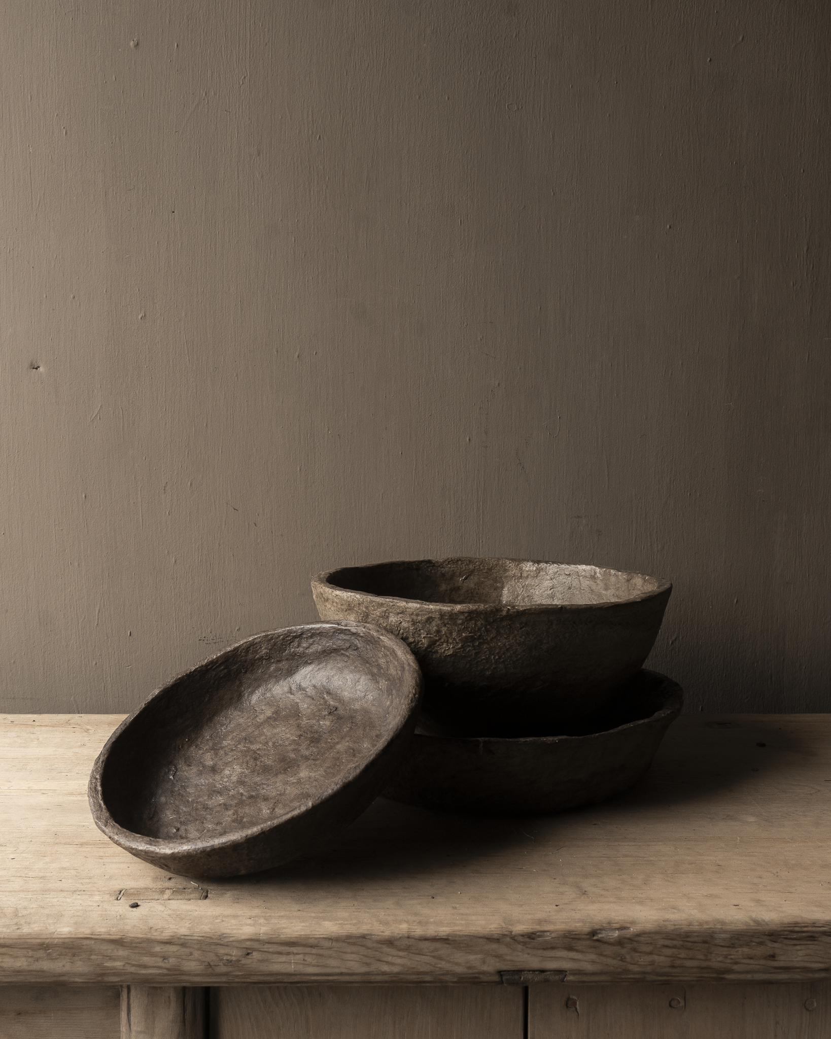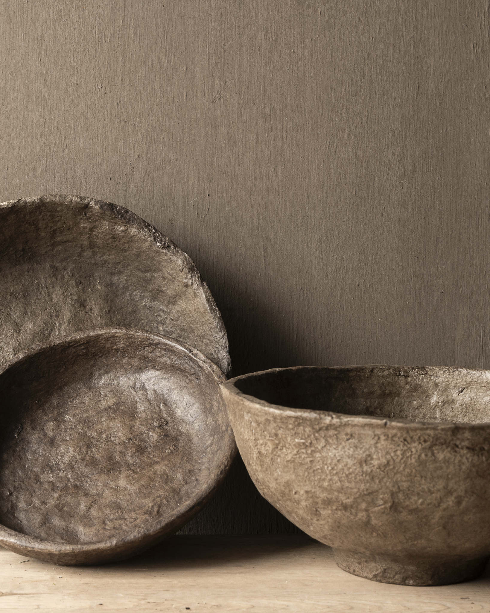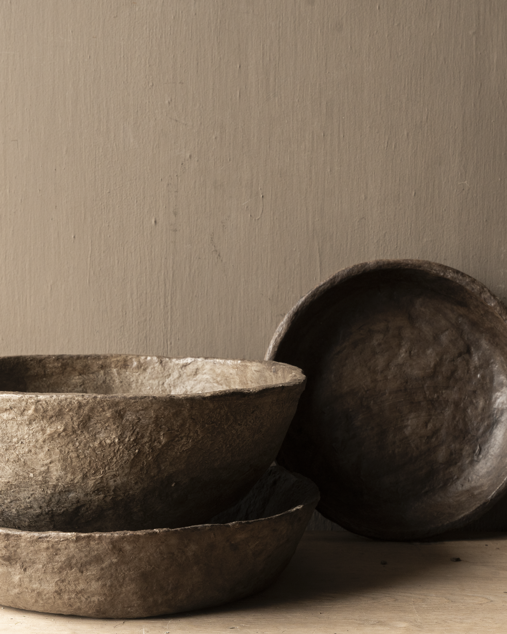 Diese wunderschönen, handgefertigten Pappmaché-Schalen und -Teller verleihen einem rustikalen, schlichten Interieur eine besondere Note. Jedes Stück ist handgefertigt und besticht durch seinen einzigartigen, leicht gealterten Look mit subtilen Farbnuancen und natürlichen Unregelmäßigkeiten.