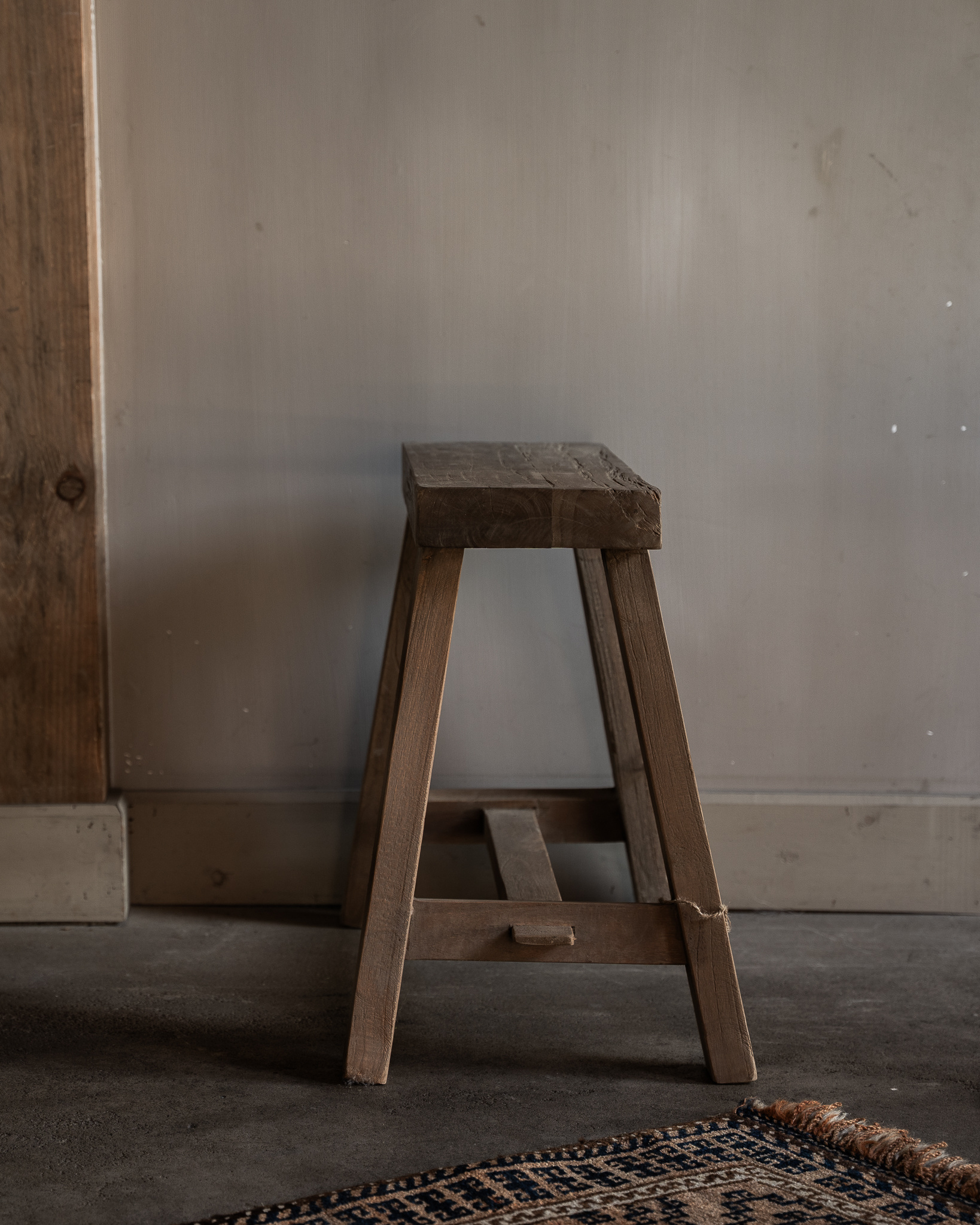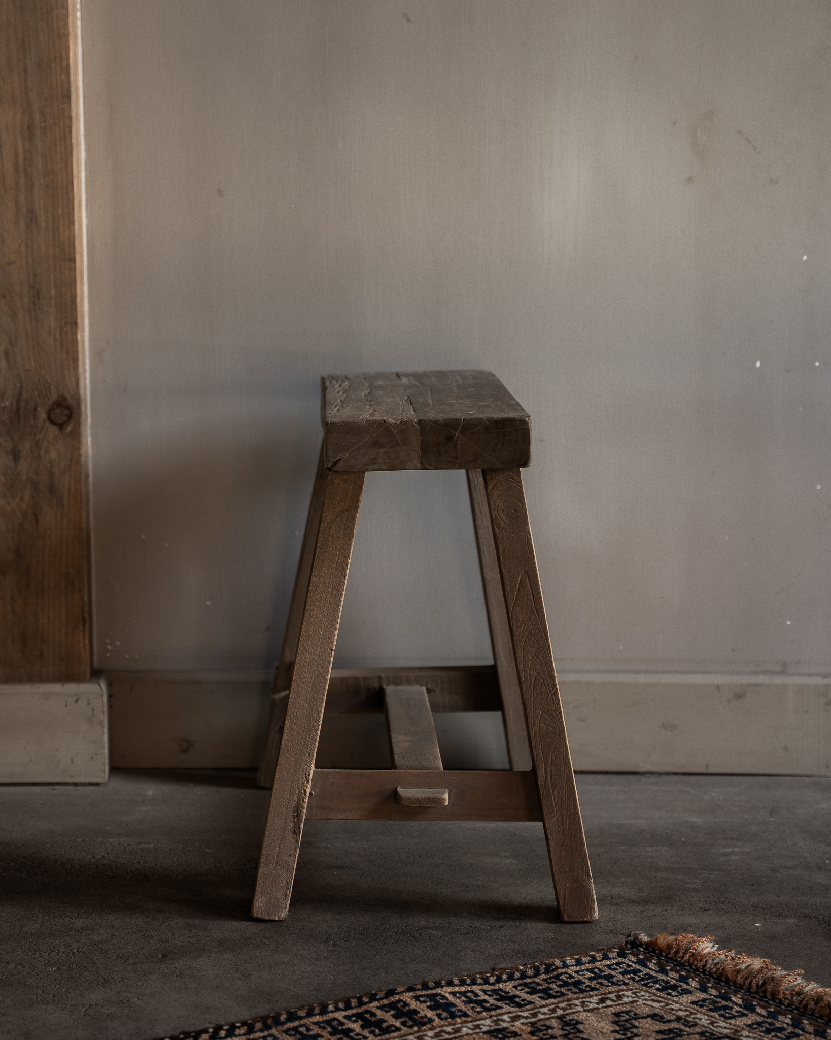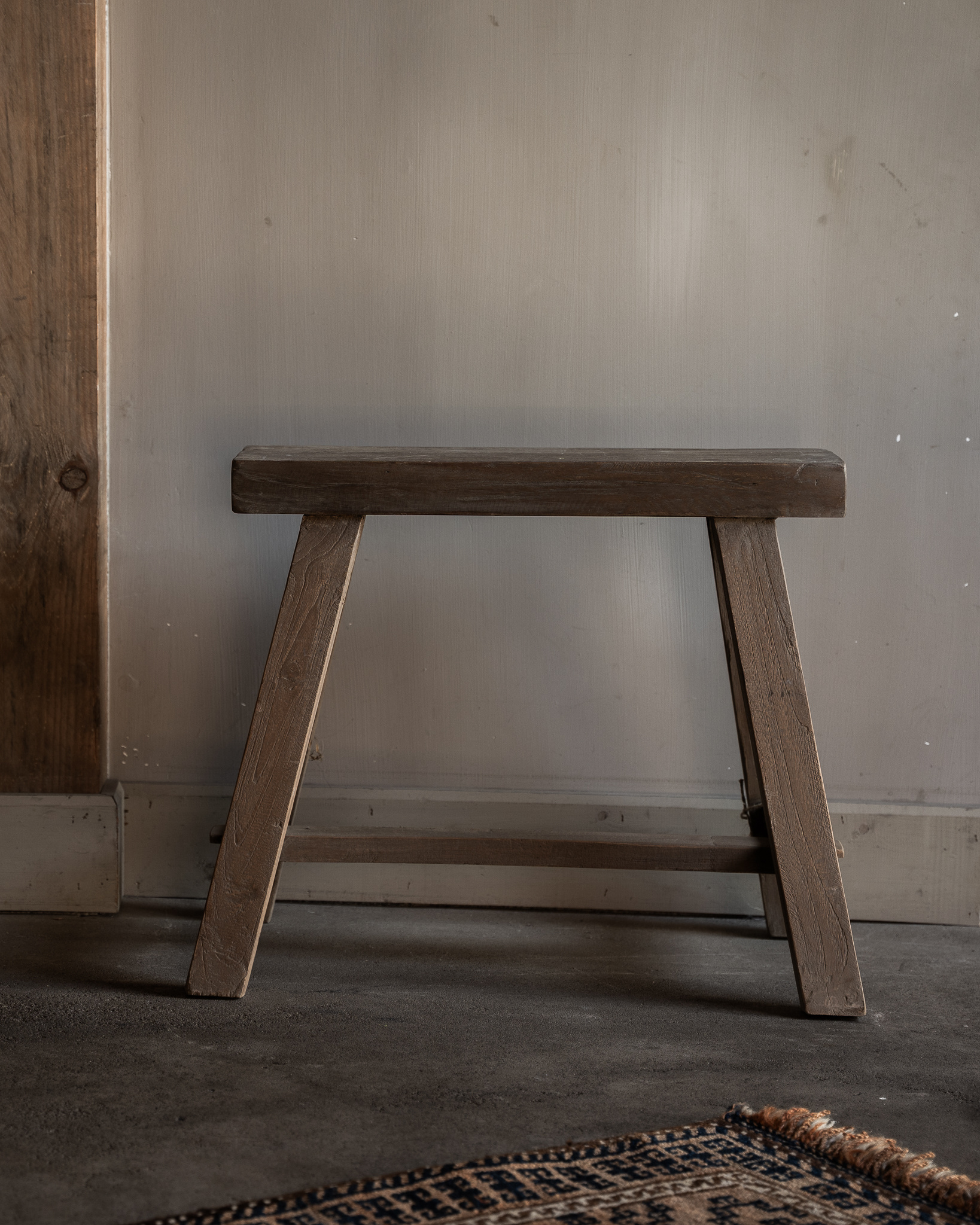 Ein robuster und funktionaler Hocker oder eine schmale Bank, handgefertigt aus altem Obstbaumholz. Die tiefe, warme Holzfarbe, die sichtbare Maserung und die kräftigen Linien verleihen diesem Möbelstück einen authentischen Charakter. Jedes Stück ist handgefertigt – keines gleicht dem anderen.
