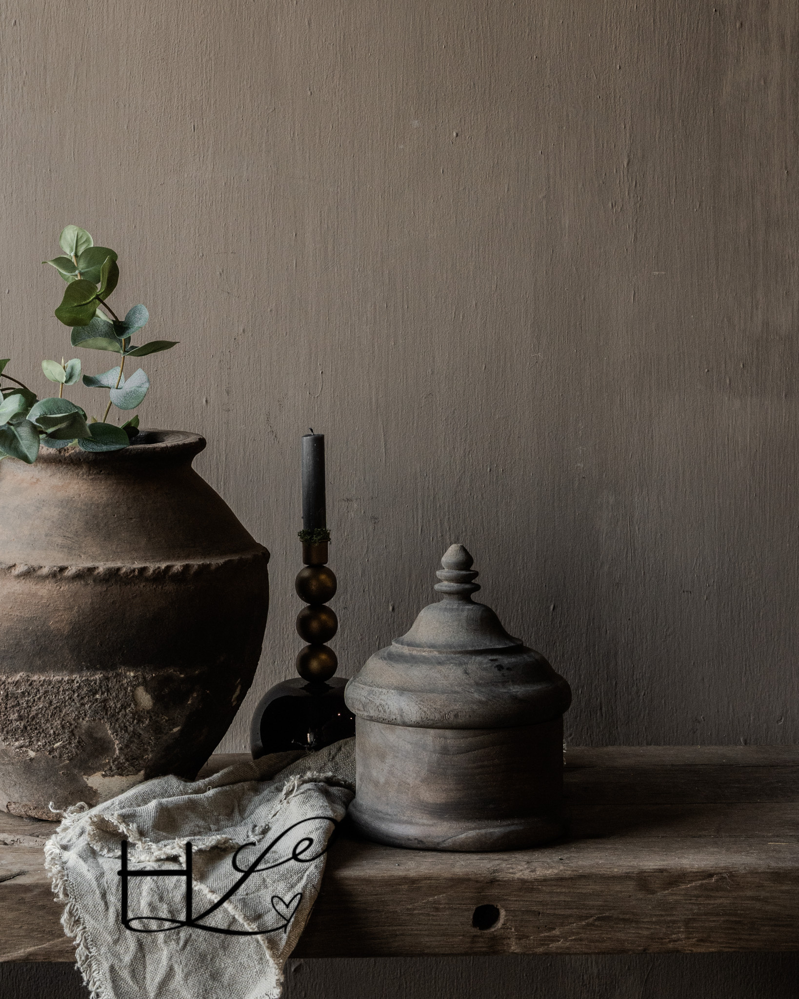 Dieses charmante Holzgefäß mit Deckel ist ein wunderschönes Dekorationsobjekt, das Ihrem Interieur sofort Wärme und Atmosphäre verleiht. Es ist handgefertigt aus Naturholz und hat eine sanfte, matte Oberfläche in Grautönen. Seine organische Form und die dezenten Unregelmäßigkeiten machen es zur perfekten Ergänzung für ein rustikales, unaufdringliches und Wabi-Sabi-inspiriertes Interieur .