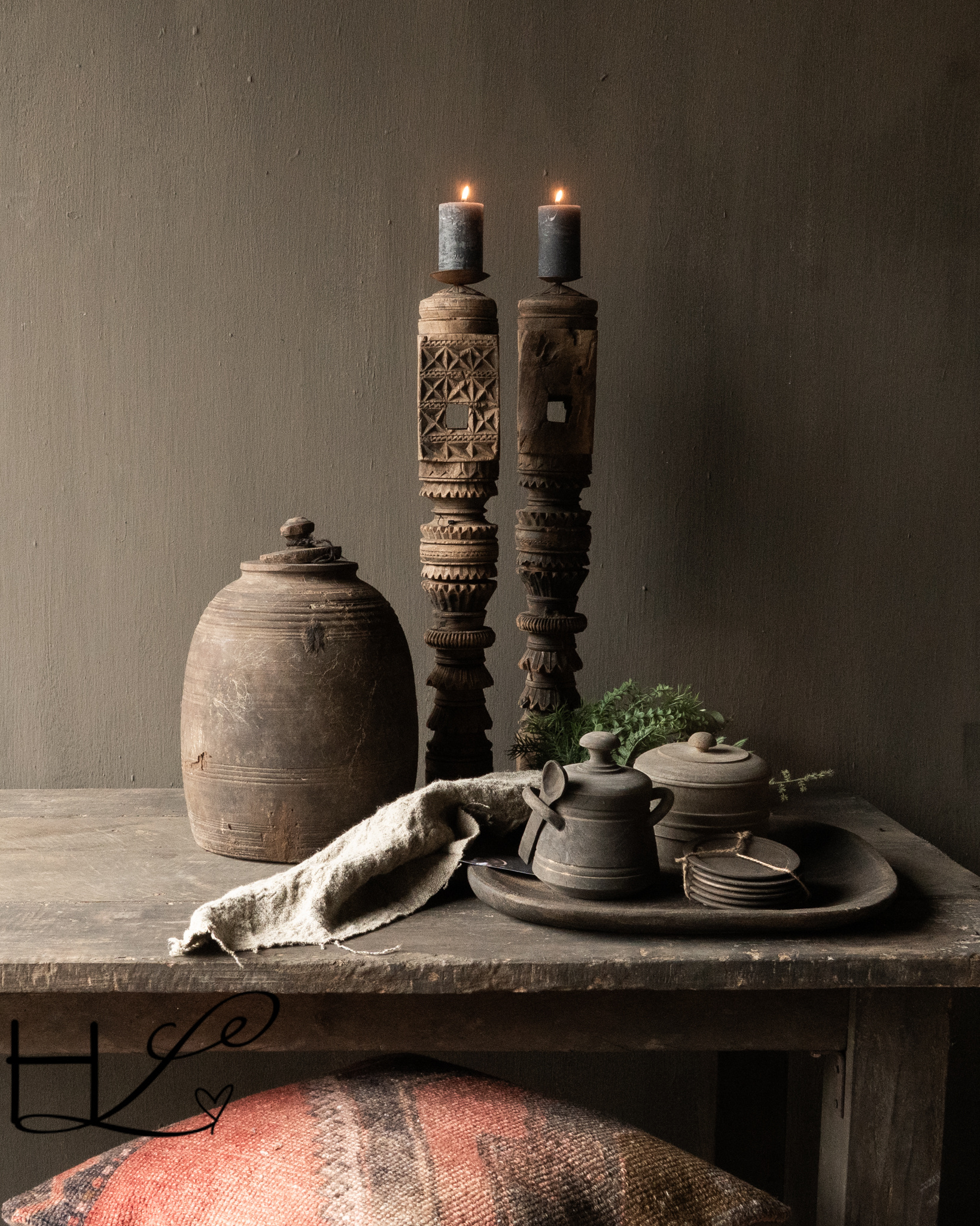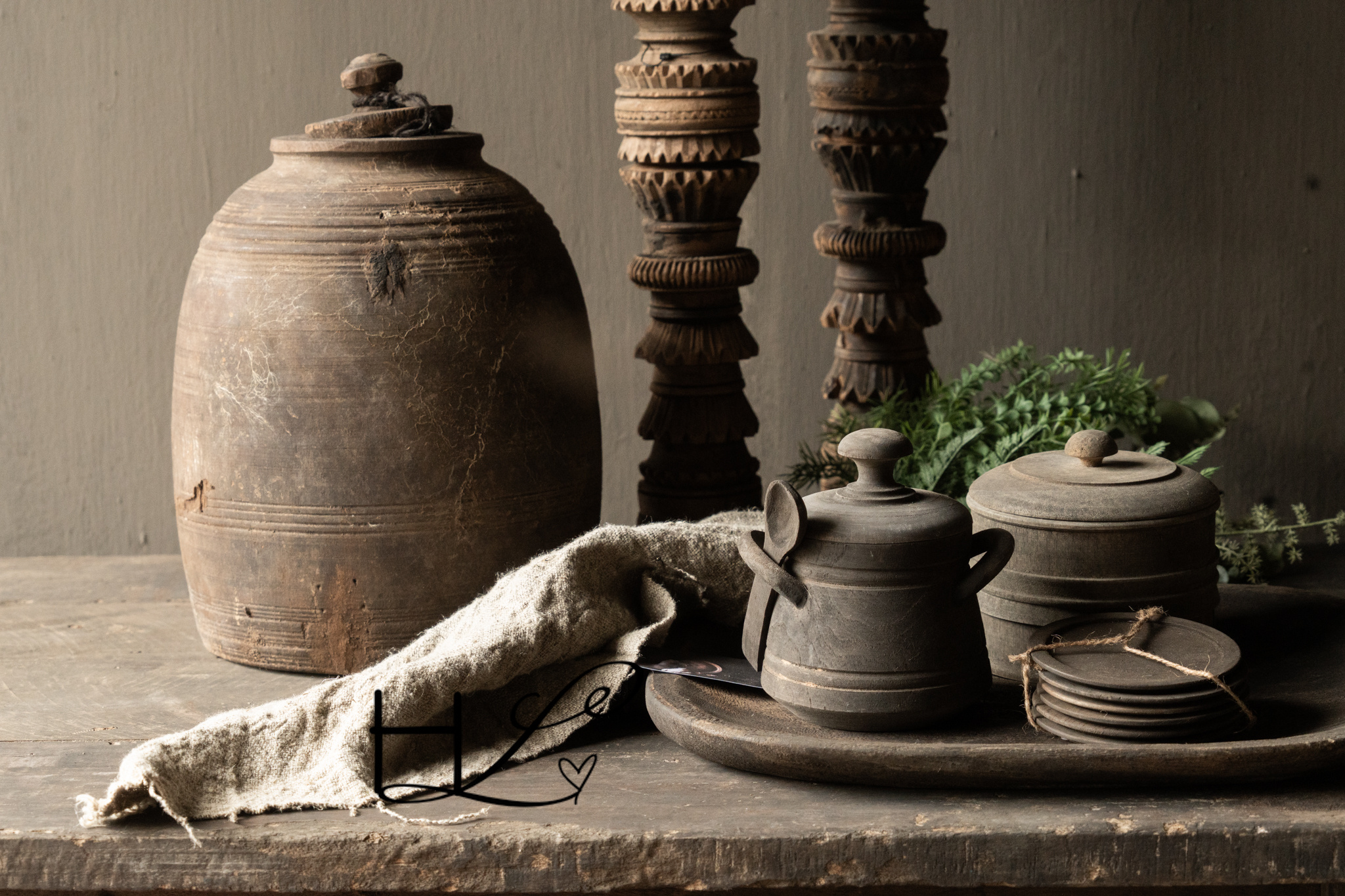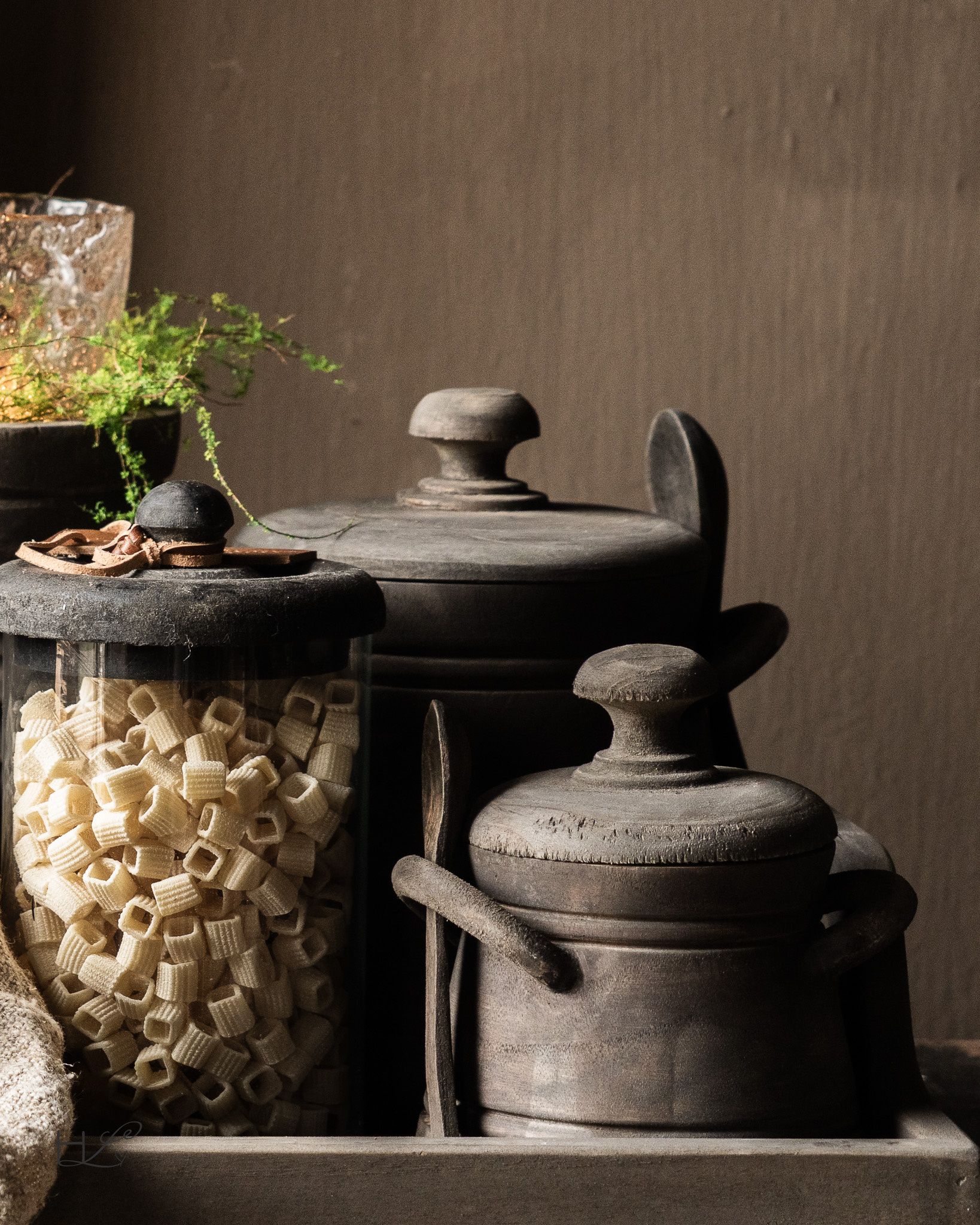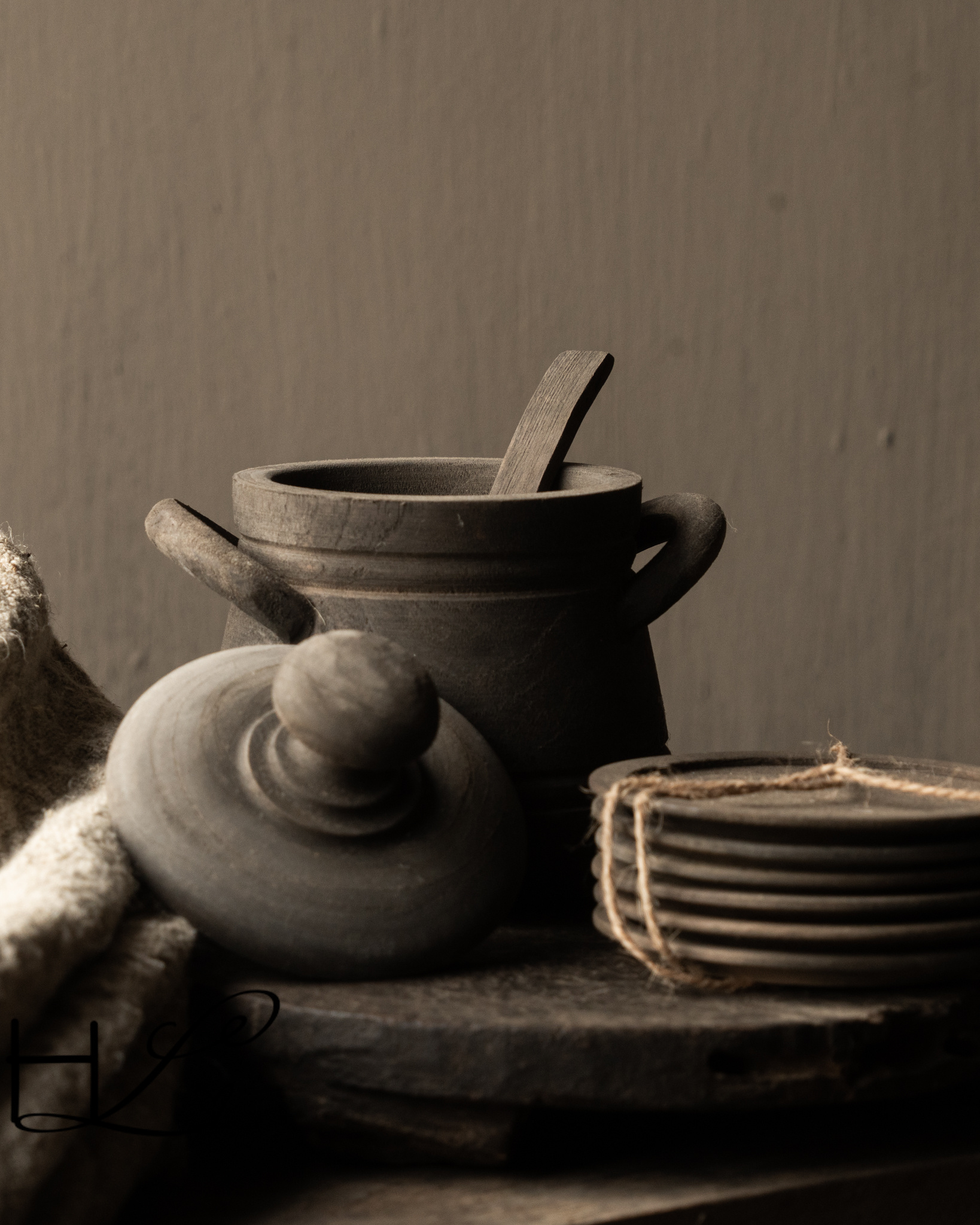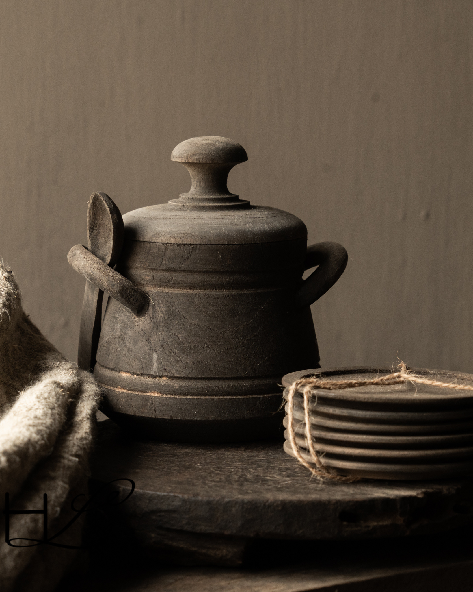 Dieser charaktervolle Holztopf mit Löffel von Aura Peeperkorn vereint Funktionalität mit einer ruhigen, rustikalen Optik. Gefertigt aus Massivholz, besticht der Topf durch seine dunkle, verwitterte Oberfläche, die perfekt zu einer robusten und schlichten Einrichtung passt.