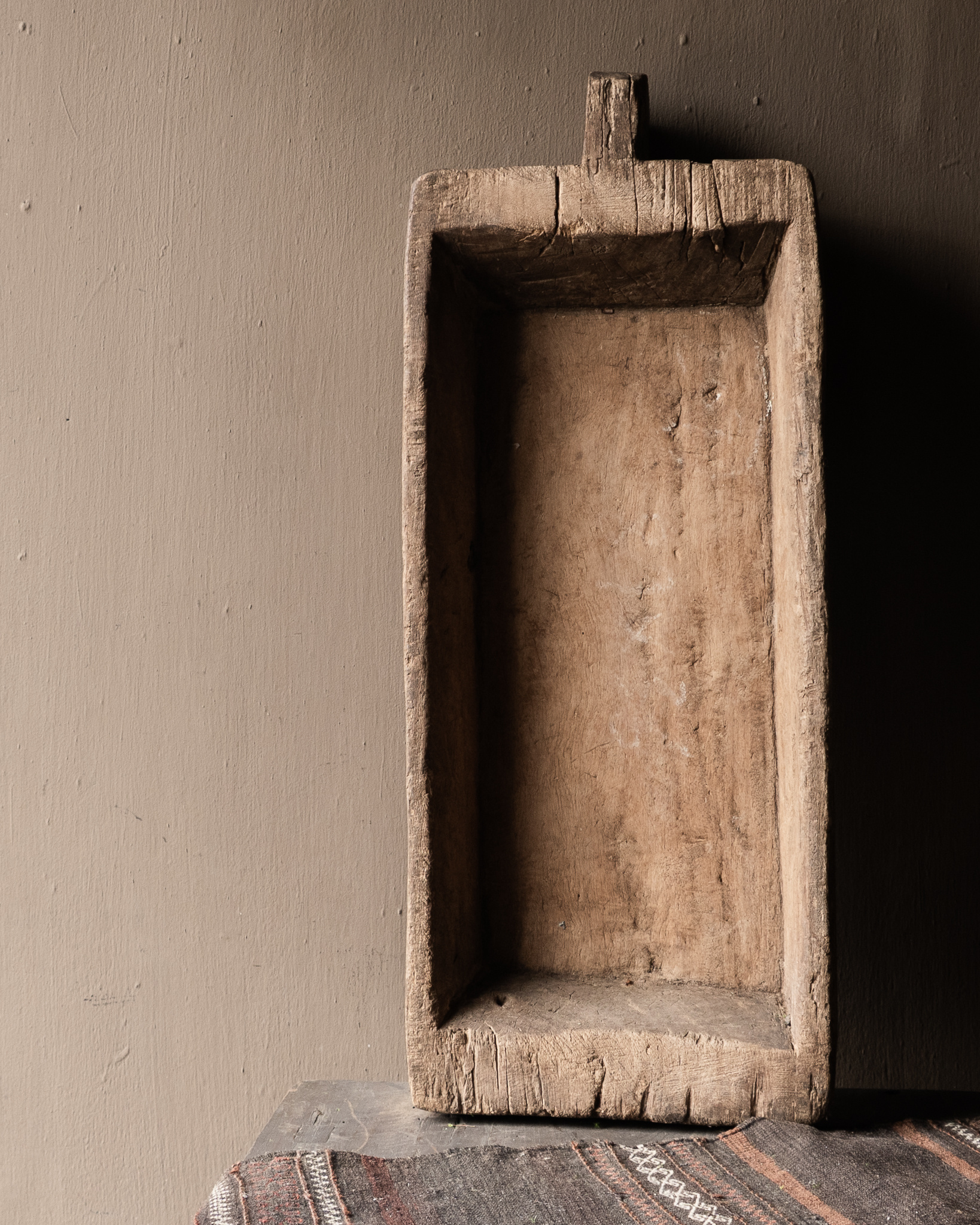 Der rechteckige Trog mit Griff wirkt besonders handwerklich und authentisch. Dank der stabilen Wände und des massiven Holzes liegt er schwer und solide in der Hand. Jedes Stück ist ein Unikat; kein Trog gleicht dem anderen.