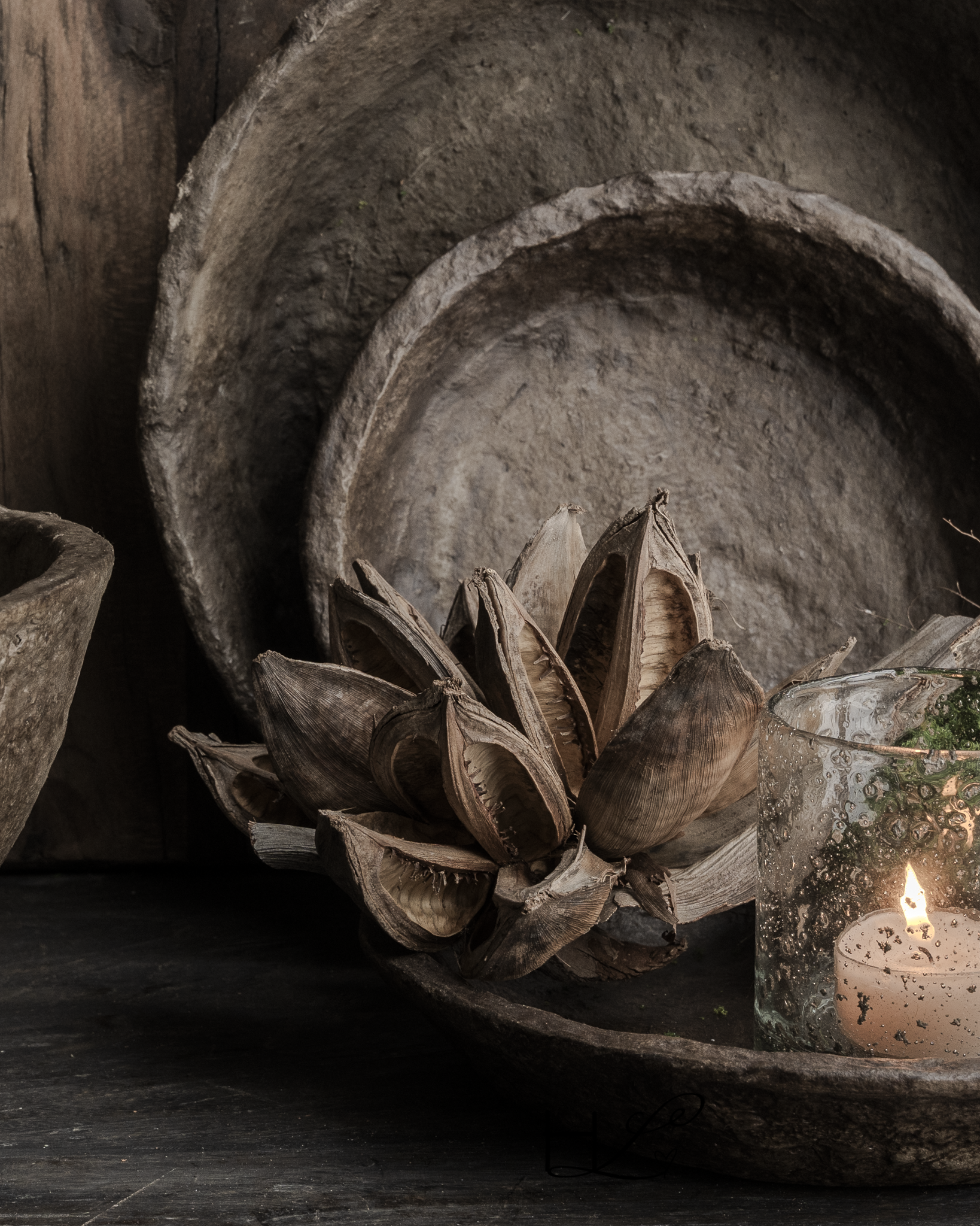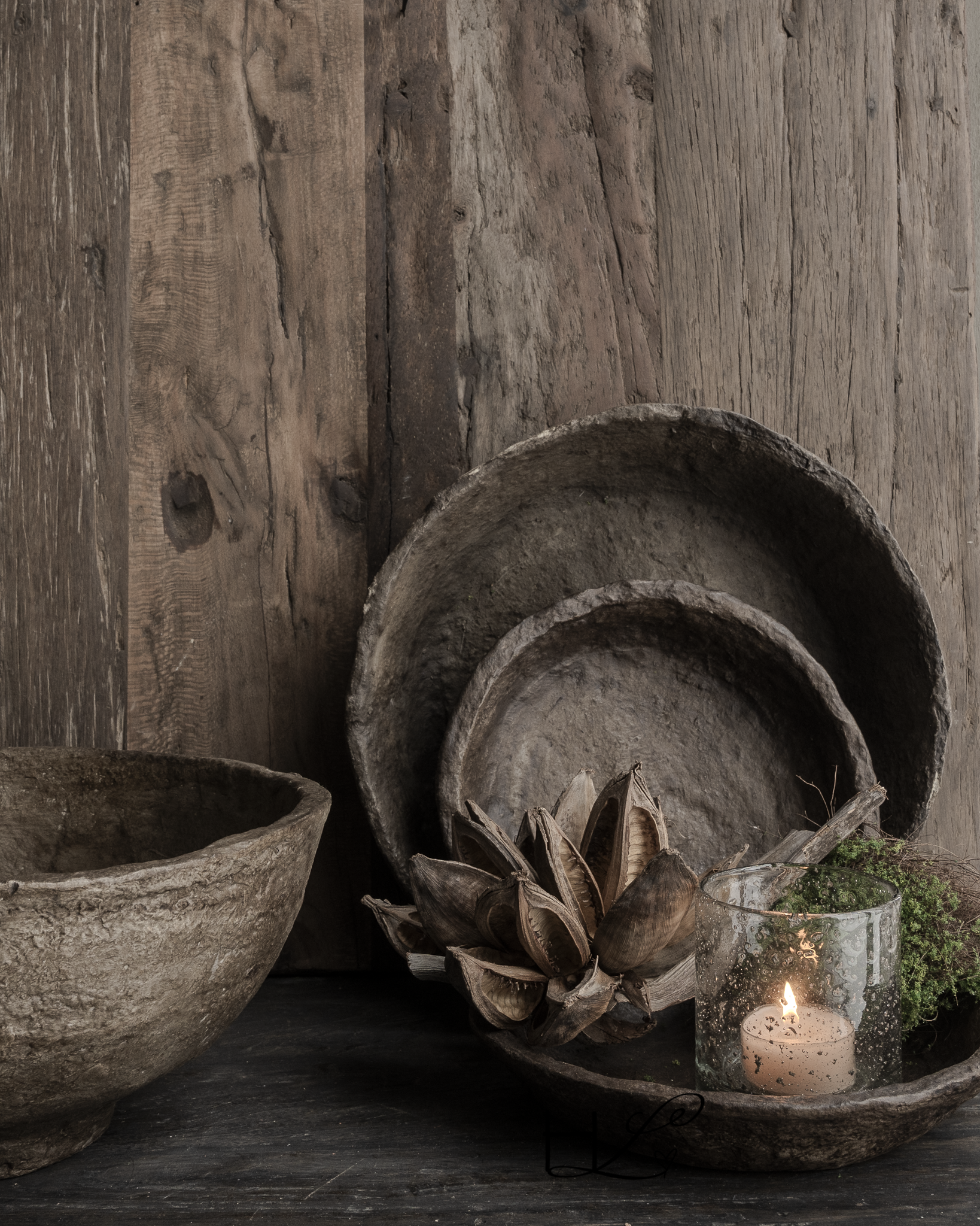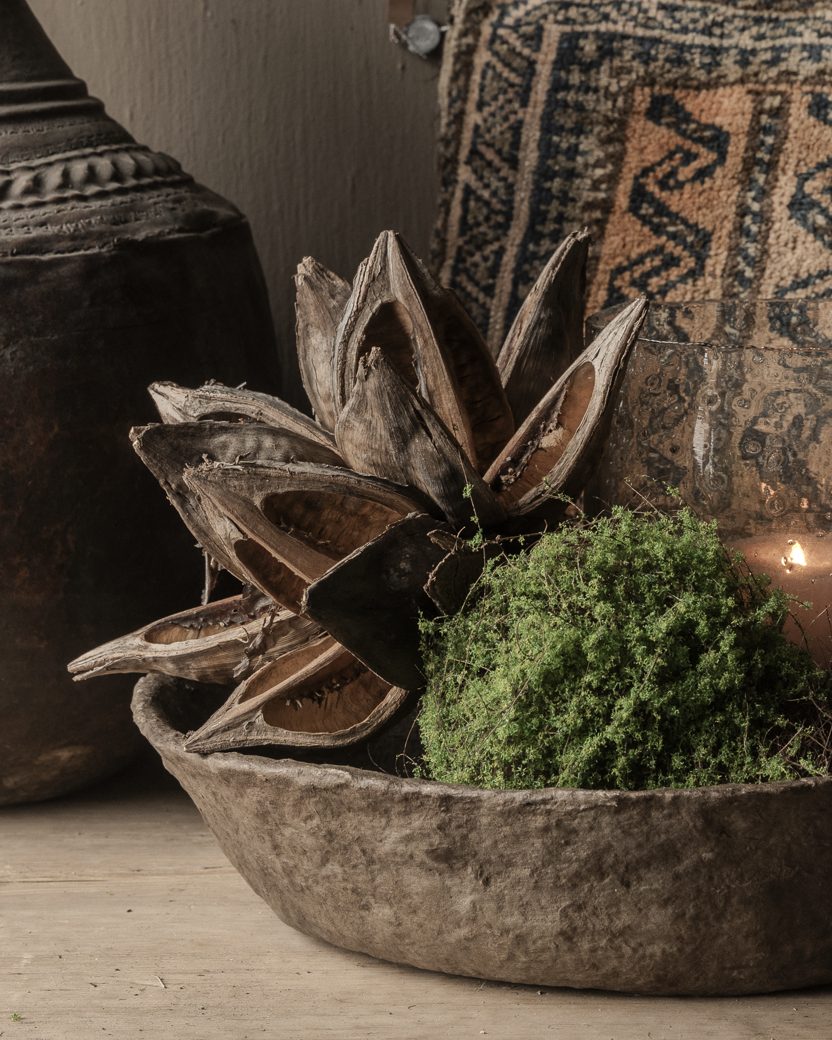 Es harmoniert wunderbar mit Holzschalen, Laternen, Textilien und anderen Naturmaterialien. Es fügt sich perfekt in ein rustikales, naturnahes und Wabi-Sabi-Interieur ein.