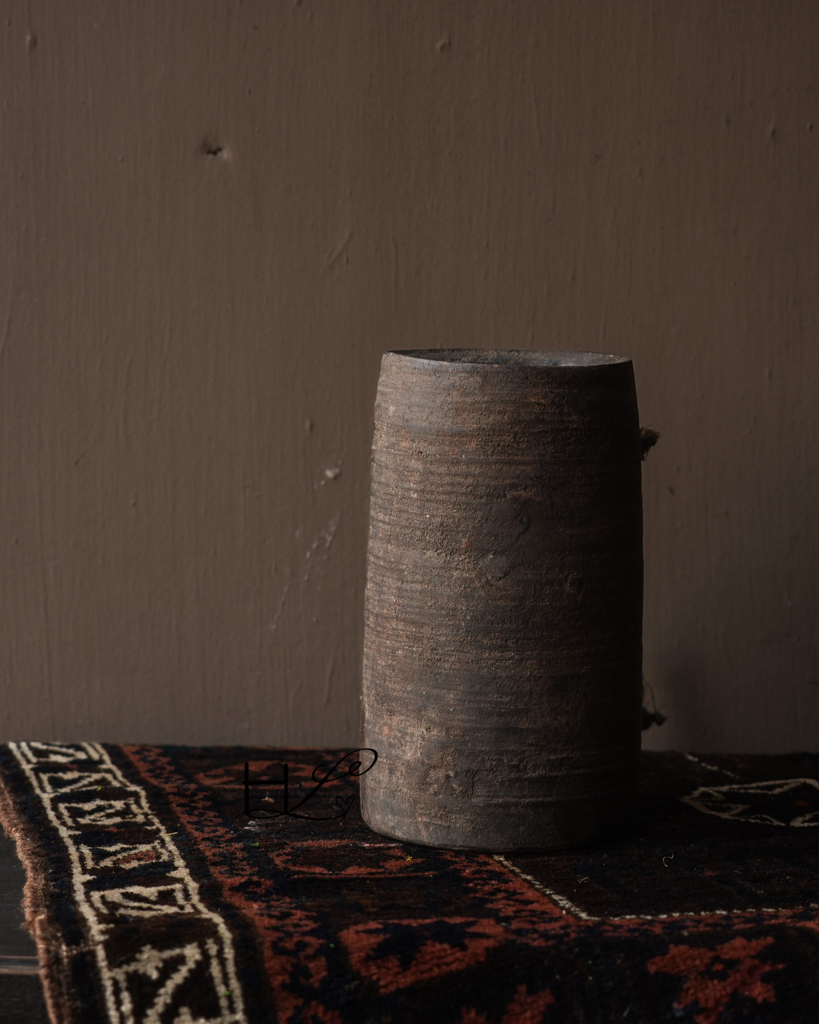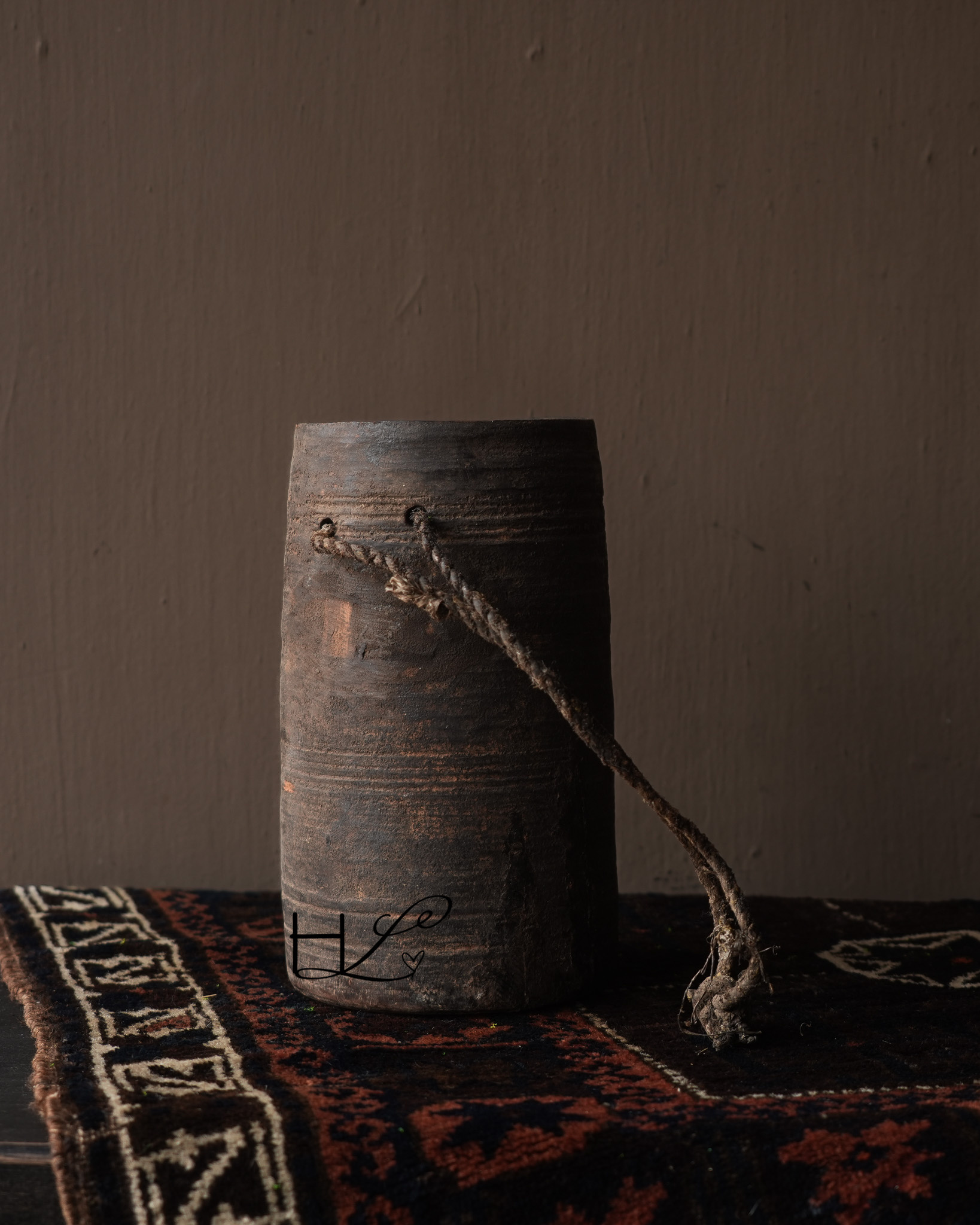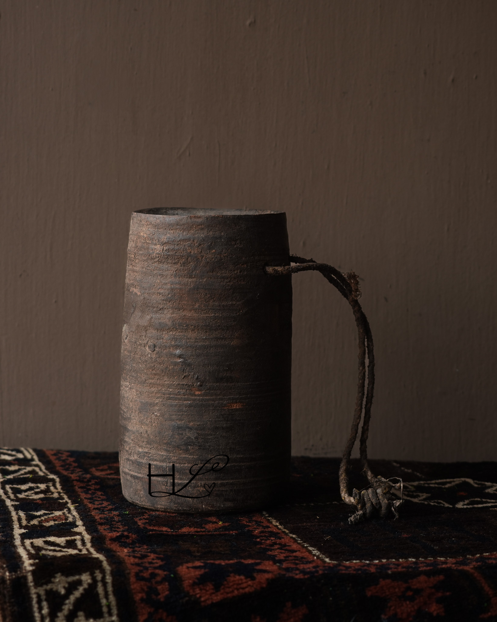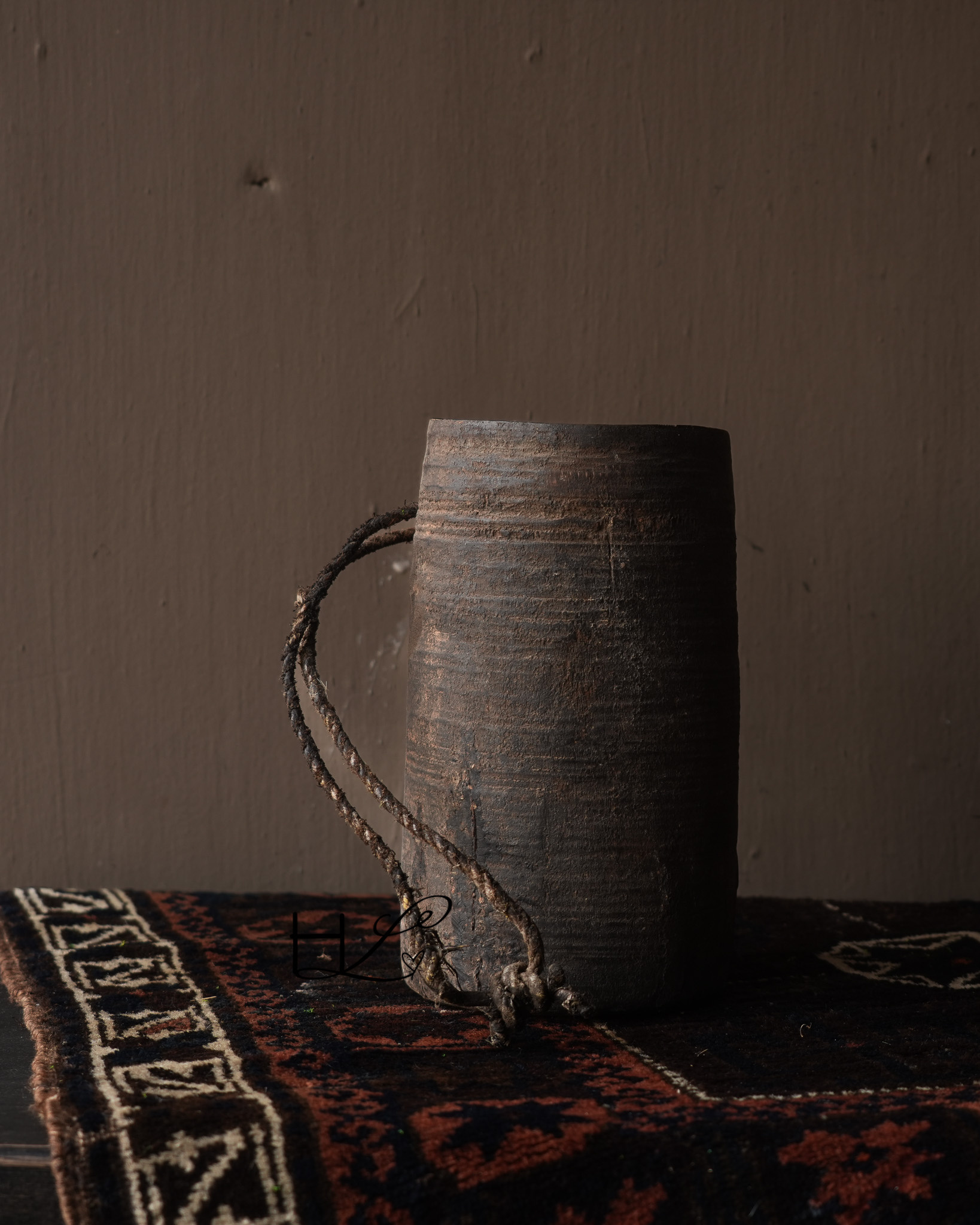 Das charakteristische Seil an der Seite verleiht dem Krug ein robustes und schlichtes Aussehen und unterstreicht seine handwerkliche Herkunft. Ursprünglich wurden solche Holzkrüge in Nepal zur Aufbewahrung oder zum Transport von Wasser, Öl oder Getreide verwendet.