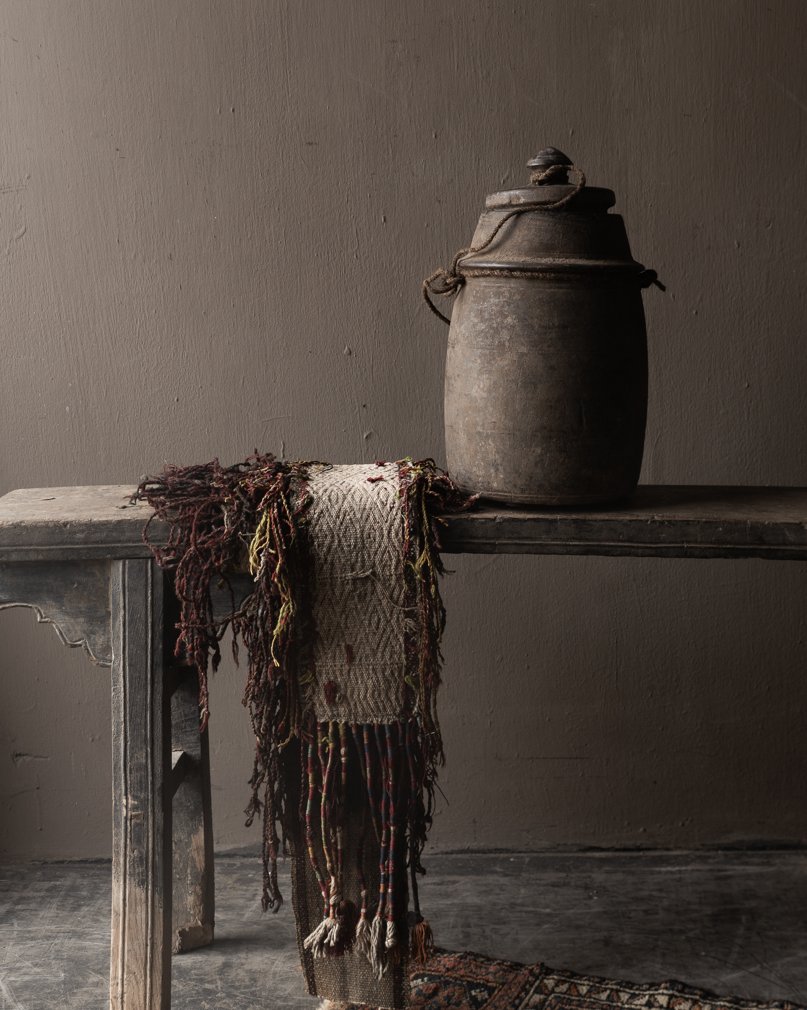 Dank seiner schlichten Form und der Verwendung natürlicher Materialien fügt sich dieses Objekt perfekt in ein Interieur ein, das von Marken wie HOFFZ, Aura Peeperkorn und Luksa inspiriert ist. Kombinieren Sie es beispielsweise mit antiken Krügen, Holzschalen, Kelim-Teppichen oder Glaslaternen für eine warme und authentische Atmosphäre.