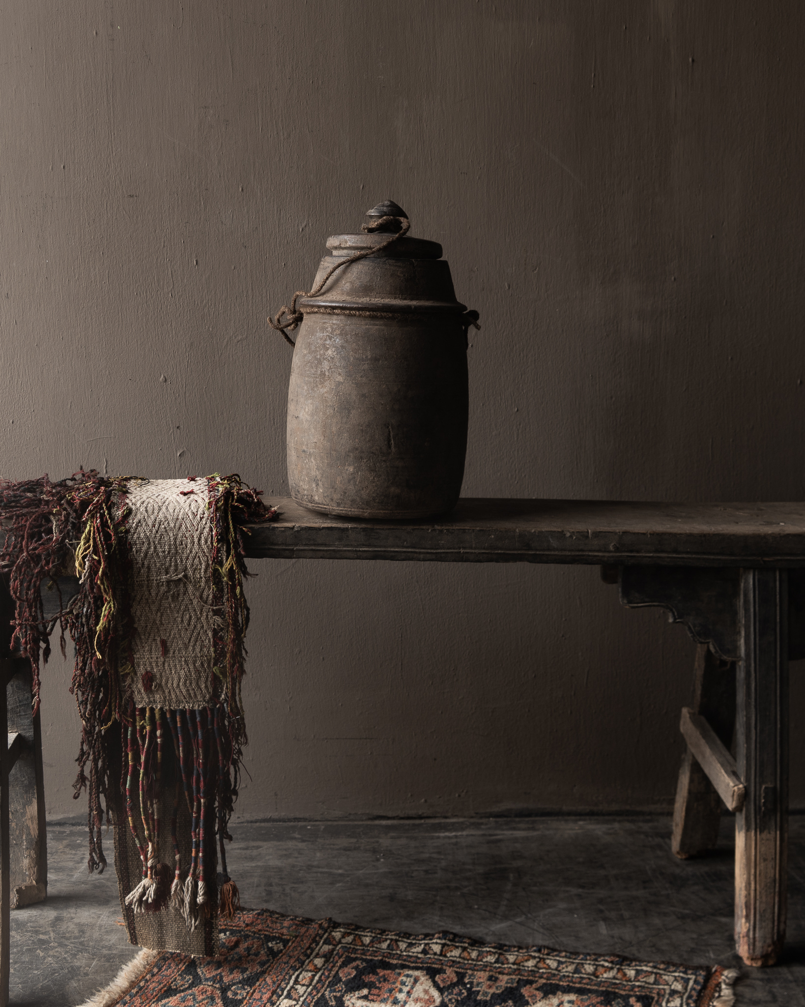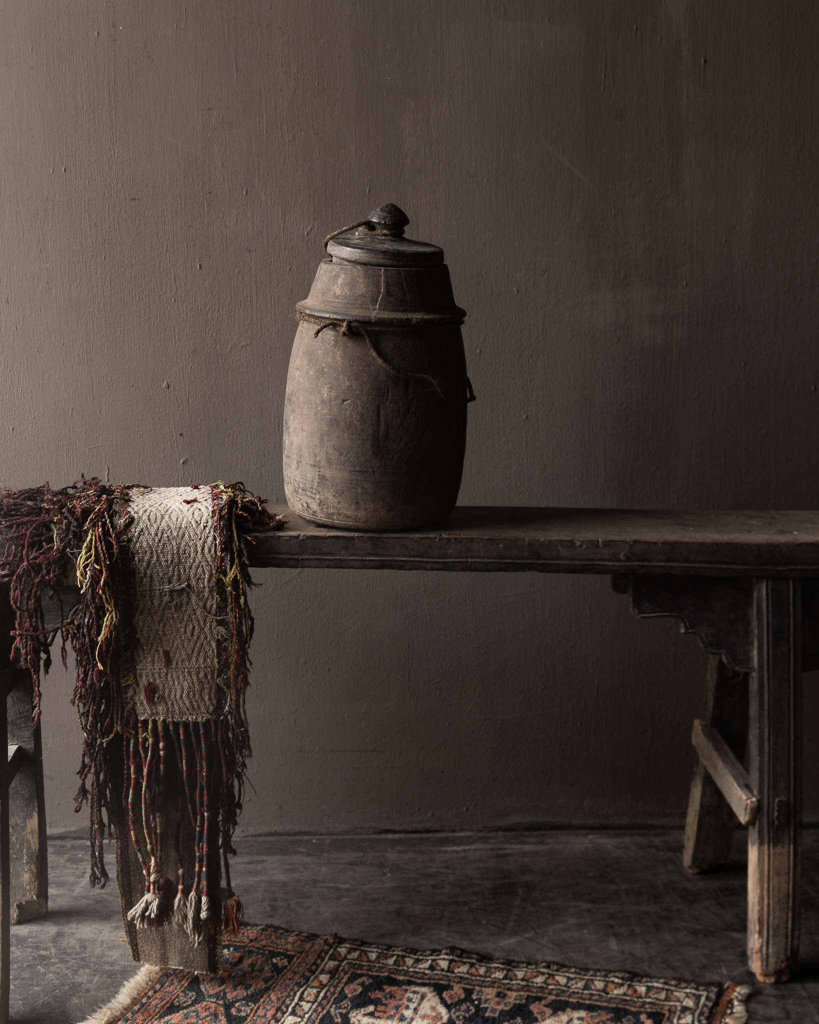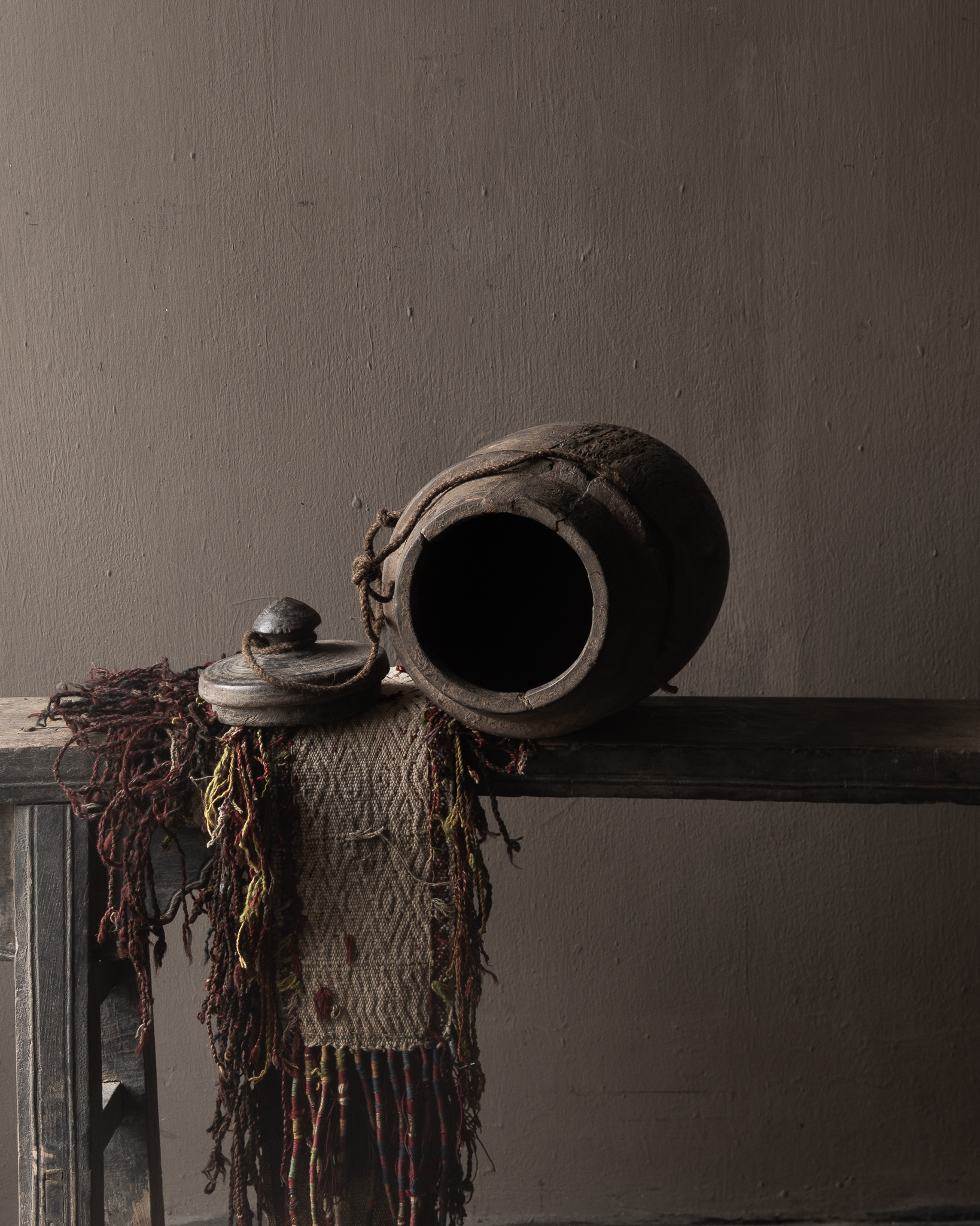 Das charakteristische Seil an der Seite verleiht dem Krug ein rustikales und zugleich schlichtes Aussehen und unterstreicht seine handwerkliche Herkunft. Ursprünglich wurde diese Art von Holztopf in Nepal zur Aufbewahrung oder zum Transport von Wasser, Öl oder Getreide verwendet.