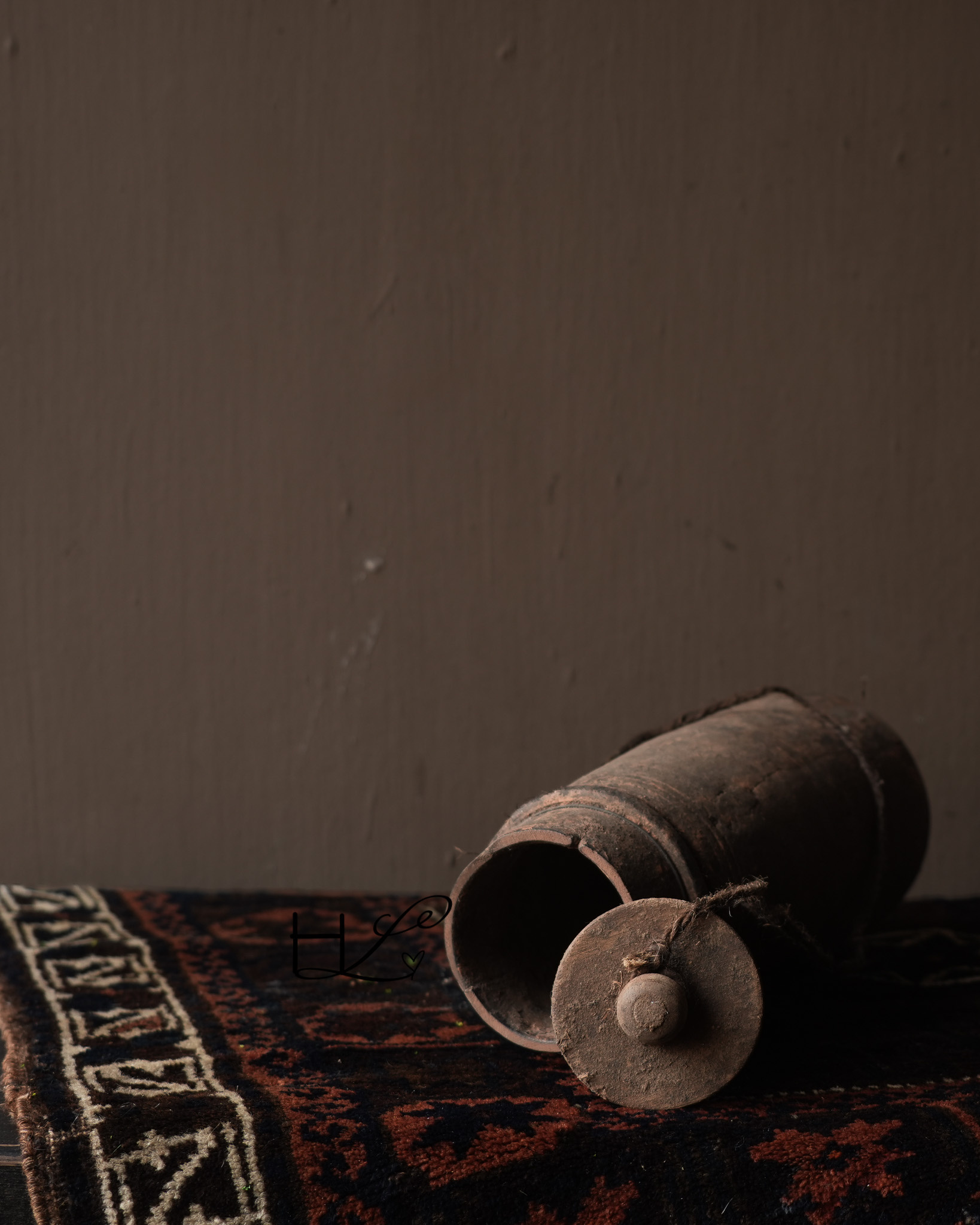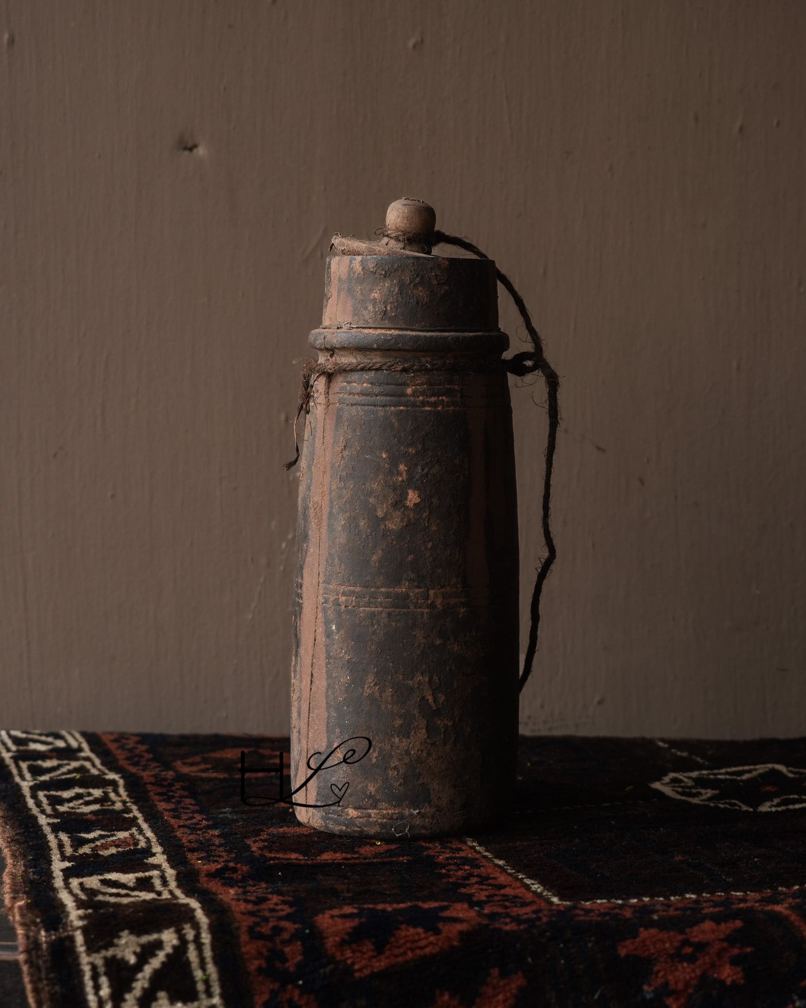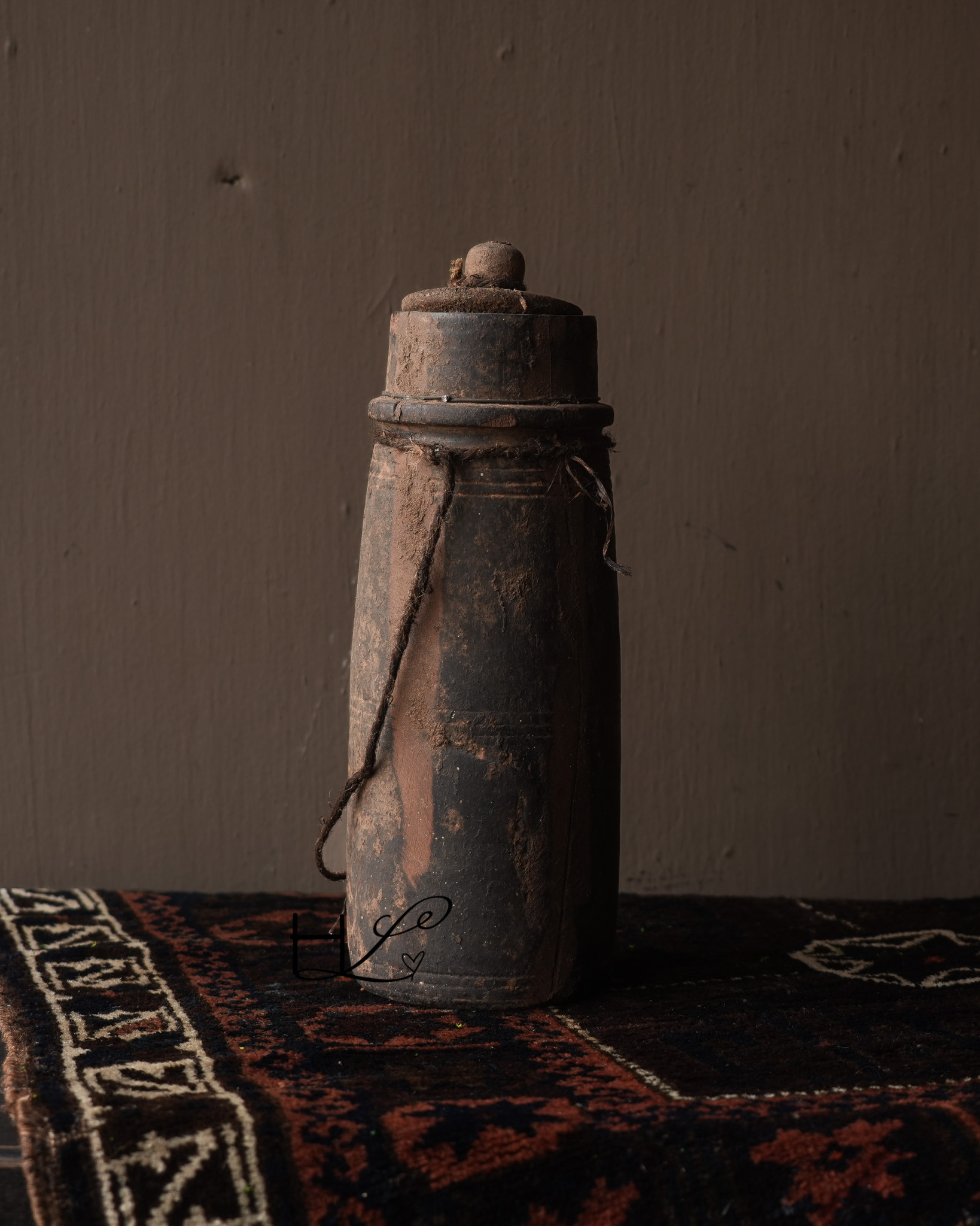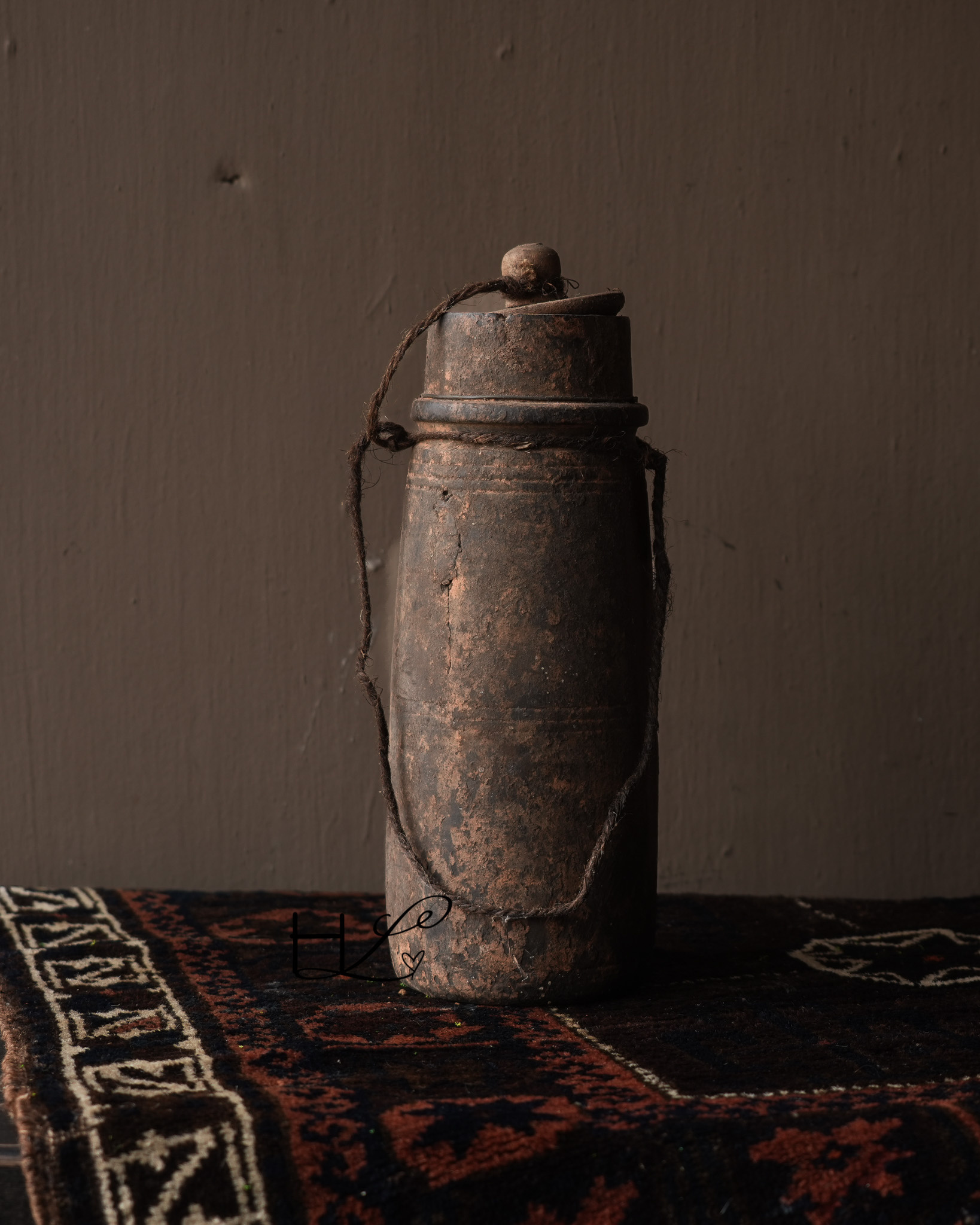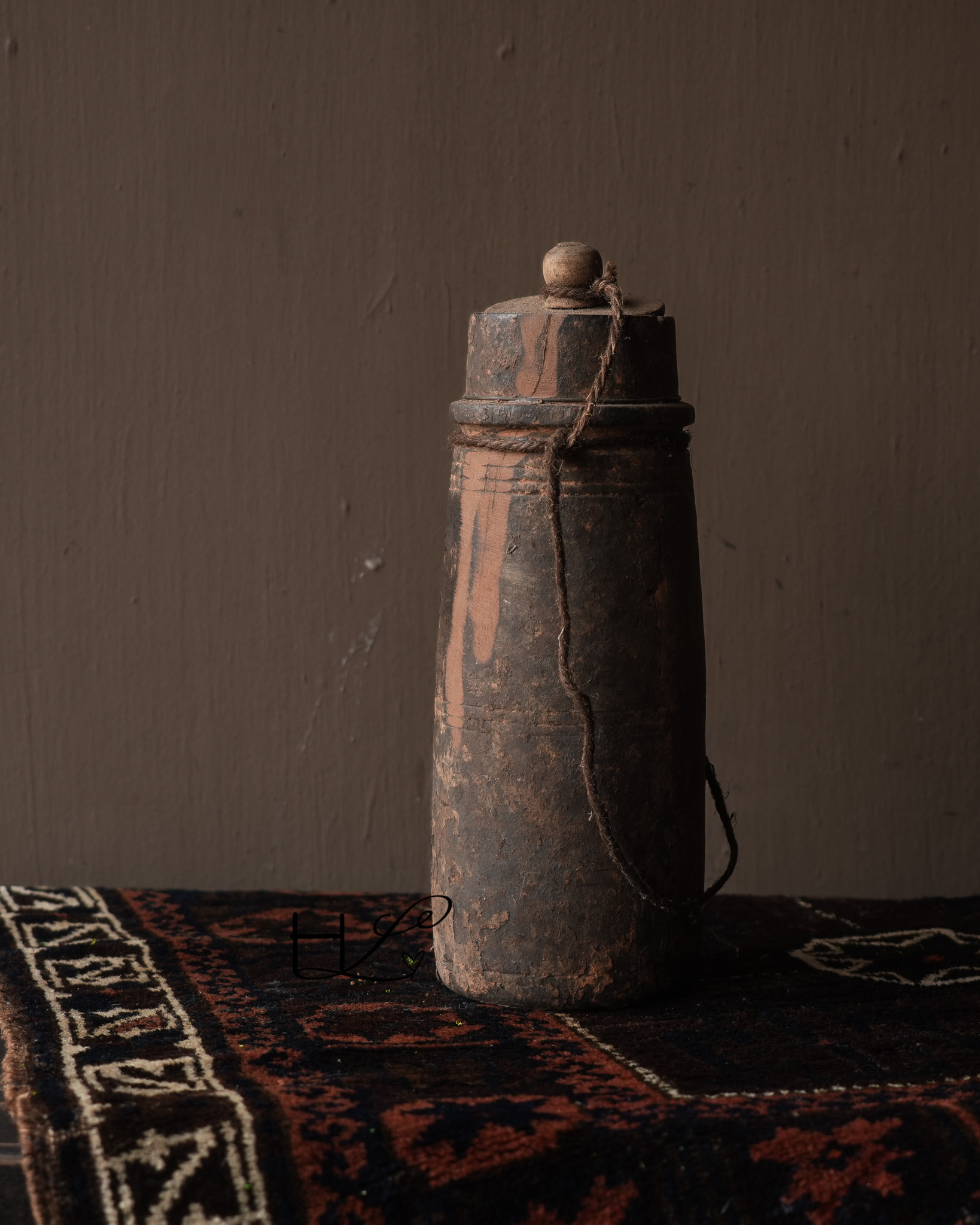 Das charakteristische Seil an der Seite verleiht dem Krug ein robustes und schlichtes Aussehen und unterstreicht seine handwerkliche Herkunft. Ursprünglich wurden solche Holzkrüge in Nepal zur Aufbewahrung oder zum Transport von Wasser, Öl oder Getreide verwendet.