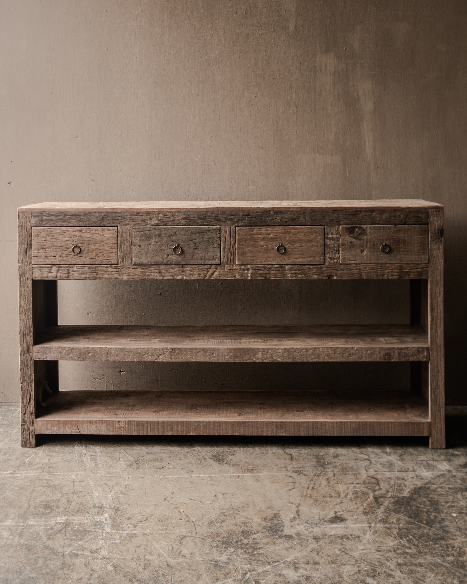 Signature Collectie Robuster, stabiler alter Wand-/Beistelltisch aus Holz mit vier Schubladen