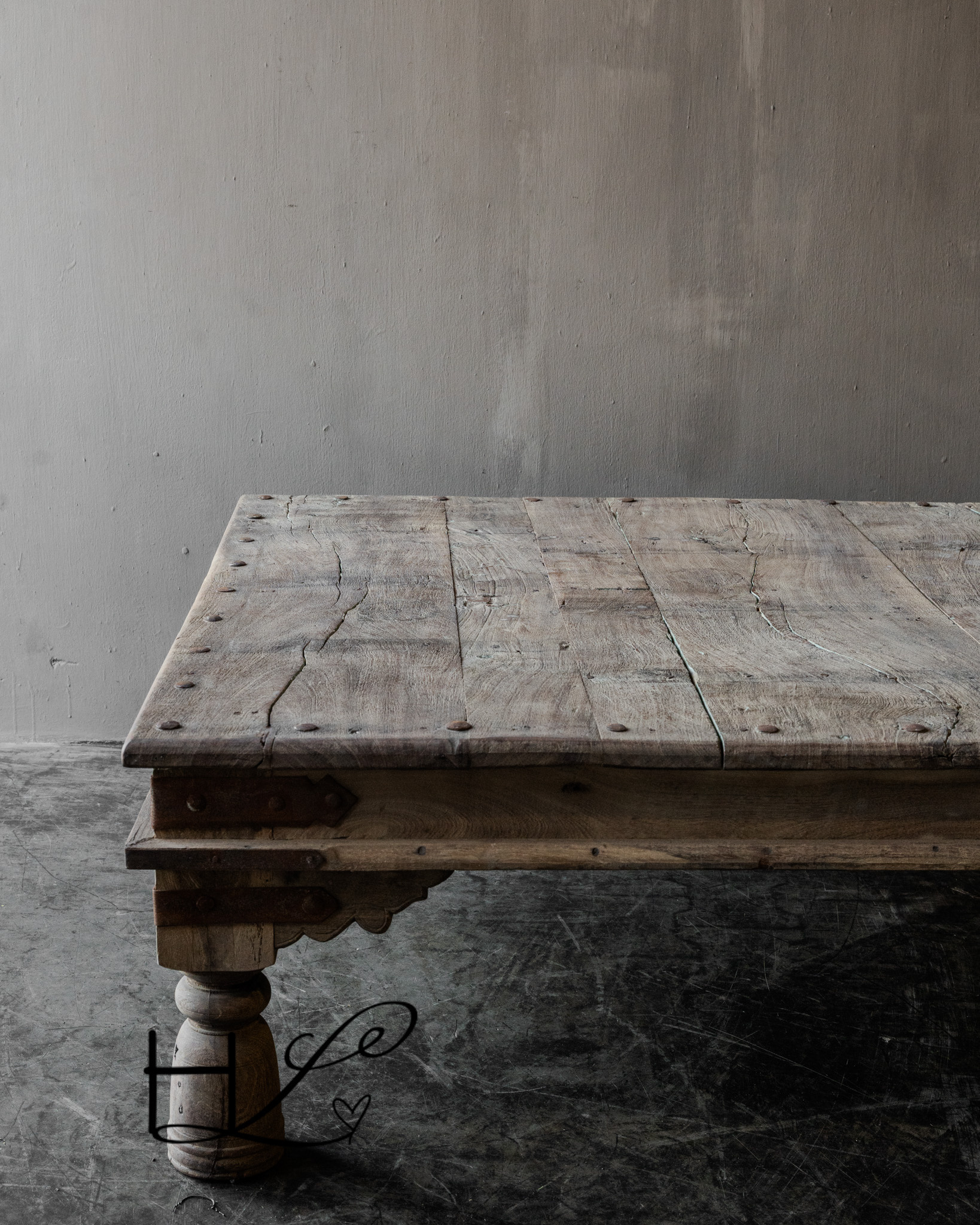 Dieser robuste, große und einzigartige Couchtisch aus Holz setzt in jedem Interieur ein starkes Statement. Mit seiner massiven, quadratischen Form, der Maserung des verwitterten Holzes und den sichtbaren Eisendetails strahlt dieser Tisch Charakter, Ruhe und Authentizität aus.