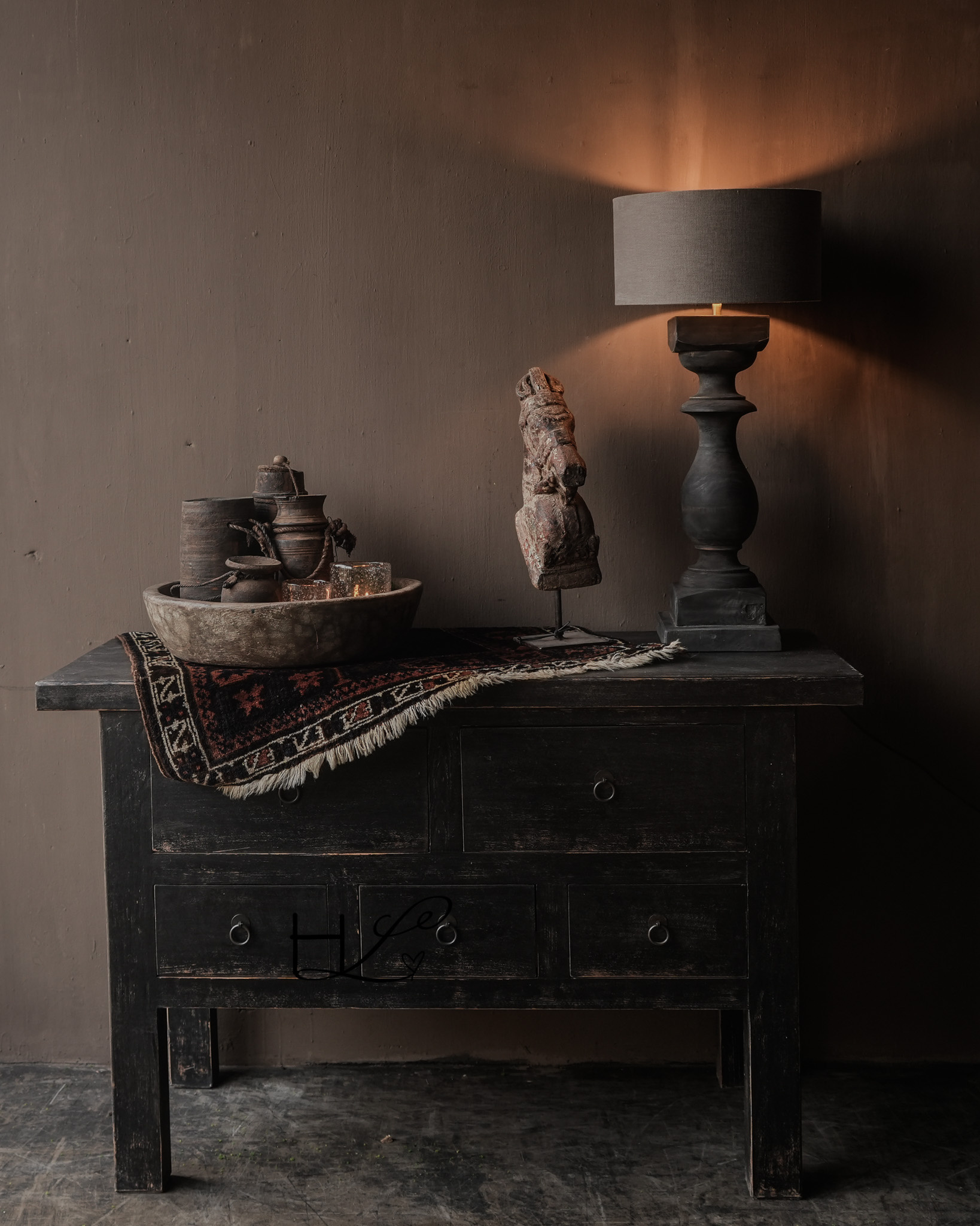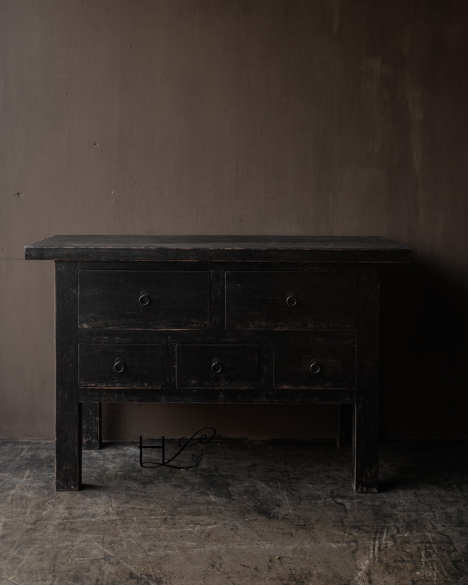Dieses robuste Sideboard aus schwarzem Holz mit fünf Schubladen fügt sich perfekt in ein rustikales, schlichtes und warmes Interieur ein. Die matte, schwarze Oberfläche und die dezenten, gealterten Details im Holz verleihen dem Möbelstück einen zeitlosen Look.