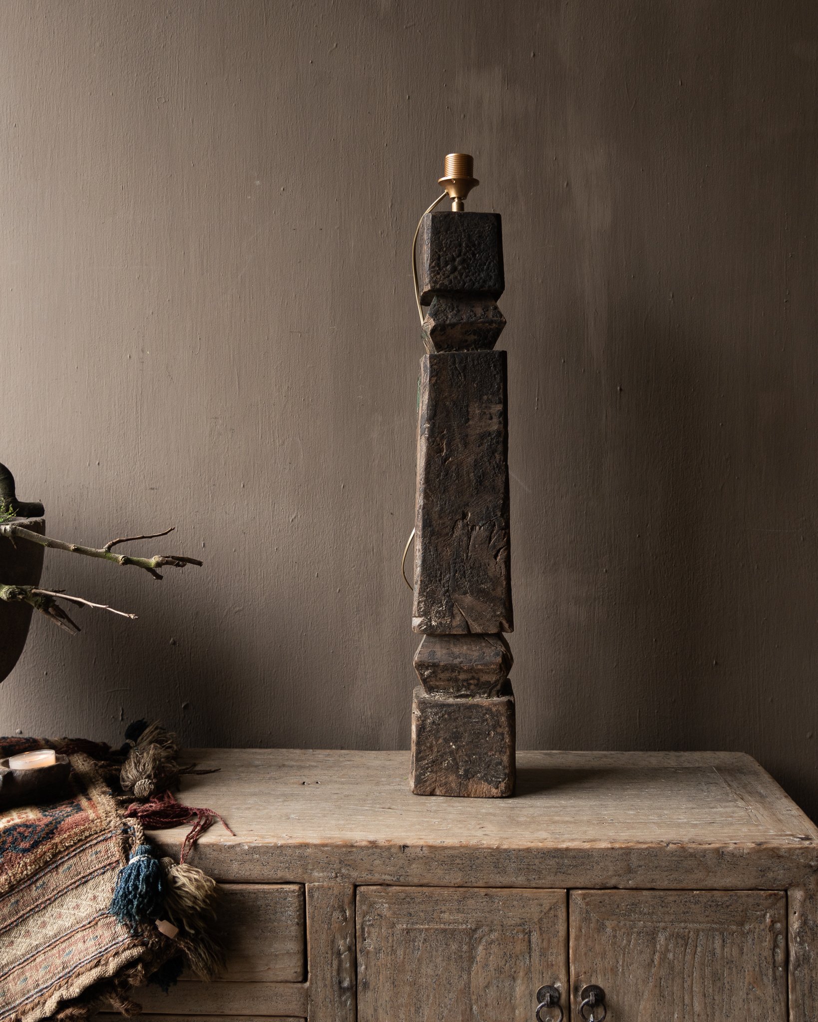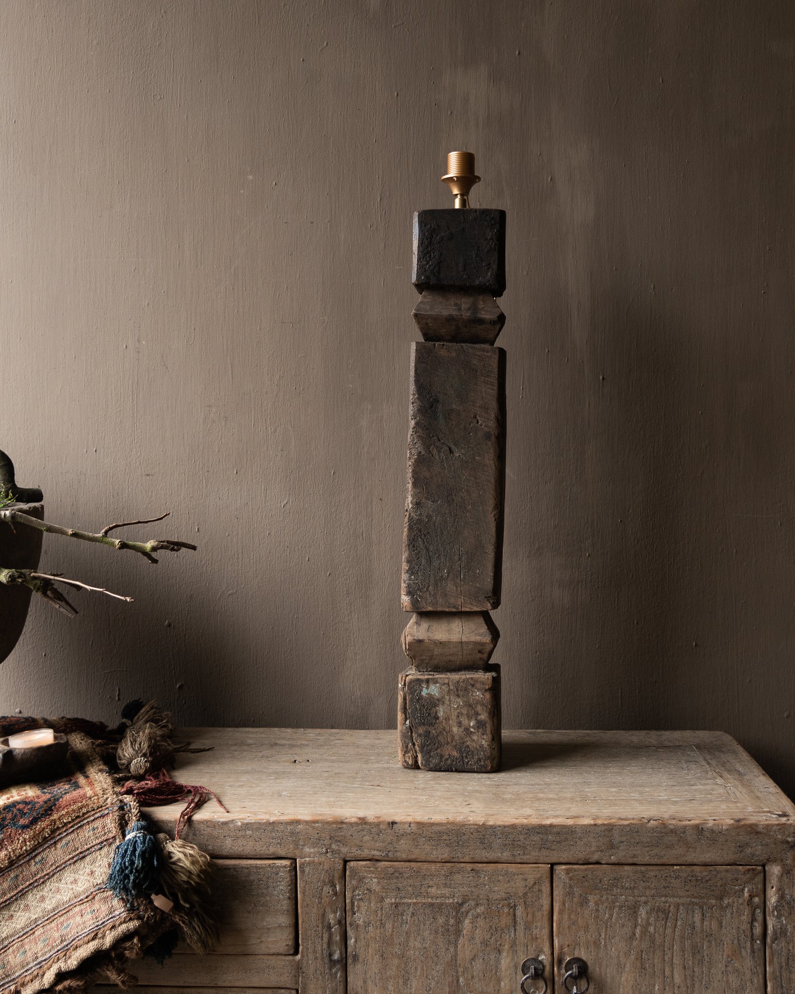 Diese charaktervolle Baluster-Tischleuchte ist aus Altholz gefertigt und besticht durch ihre schöne, gealterte Optik. Der Lampenfuß besteht aus mehreren robusten Holzblöcken, die zusammen eine skulpturale Form bilden. Durch die Verwendung von Altholz weist die Leuchte eine authentische Patina mit sichtbarer Maserung, Rissen und Farbunterschieden auf.