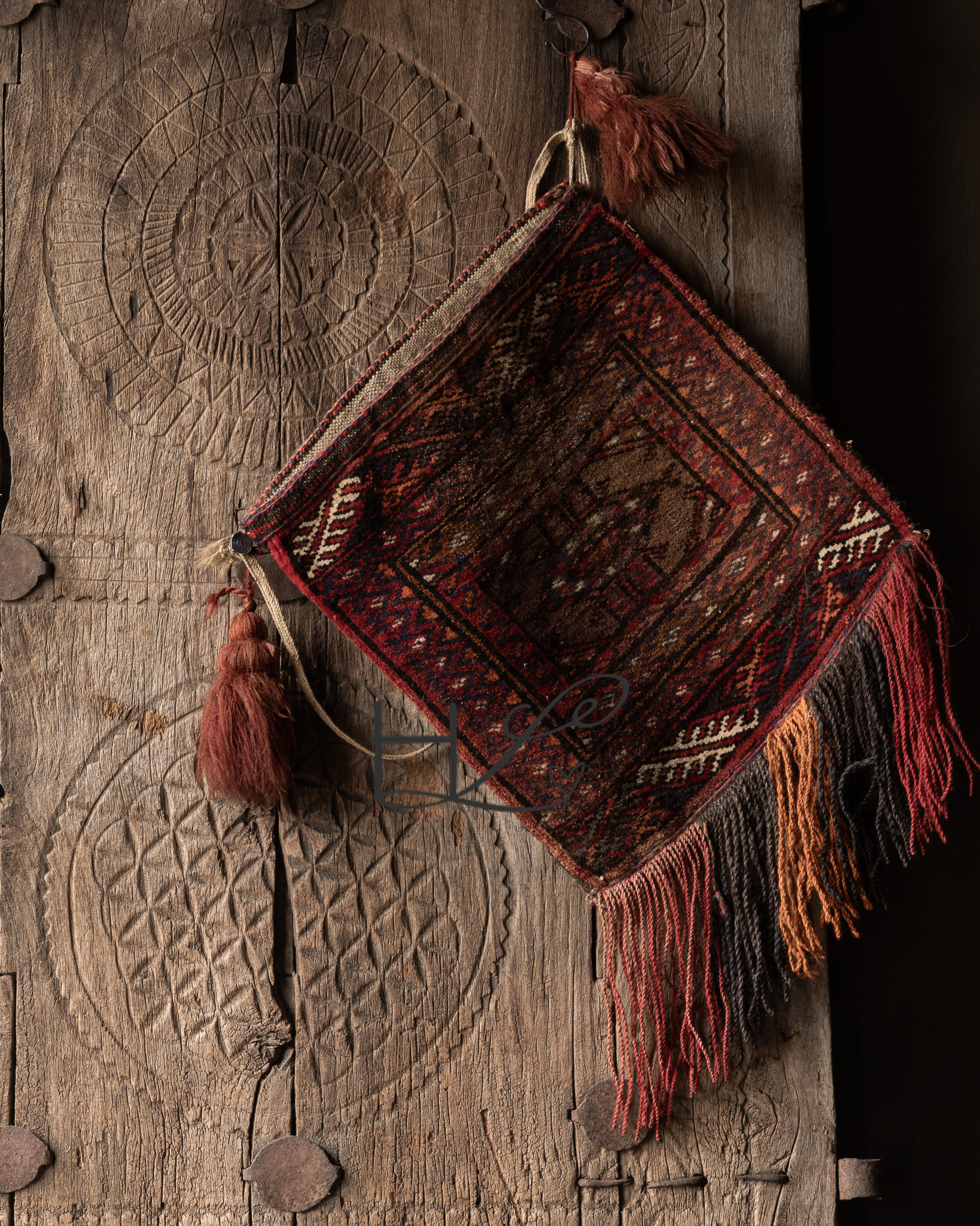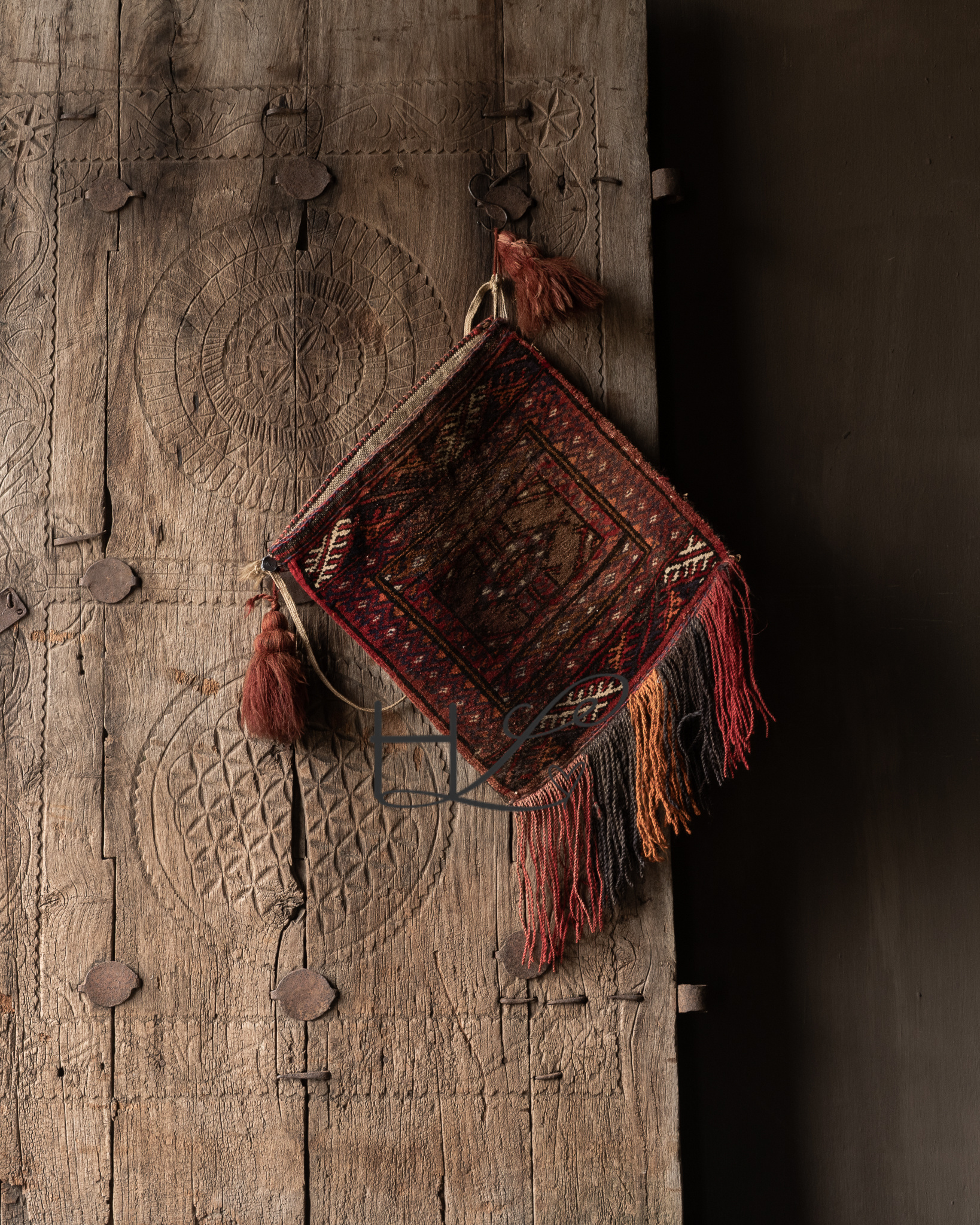 Diese Tasche wird von Nomadenstämmen aus dem Grenzgebiet zwischen Afghanistan und Iran handgewebt. Ursprünglich diente diese Art von Tasche dem Transport von persönlichen Gegenständen, Getreide oder Kleidung auf langen Reisen durch die unwegsame Landschaft.