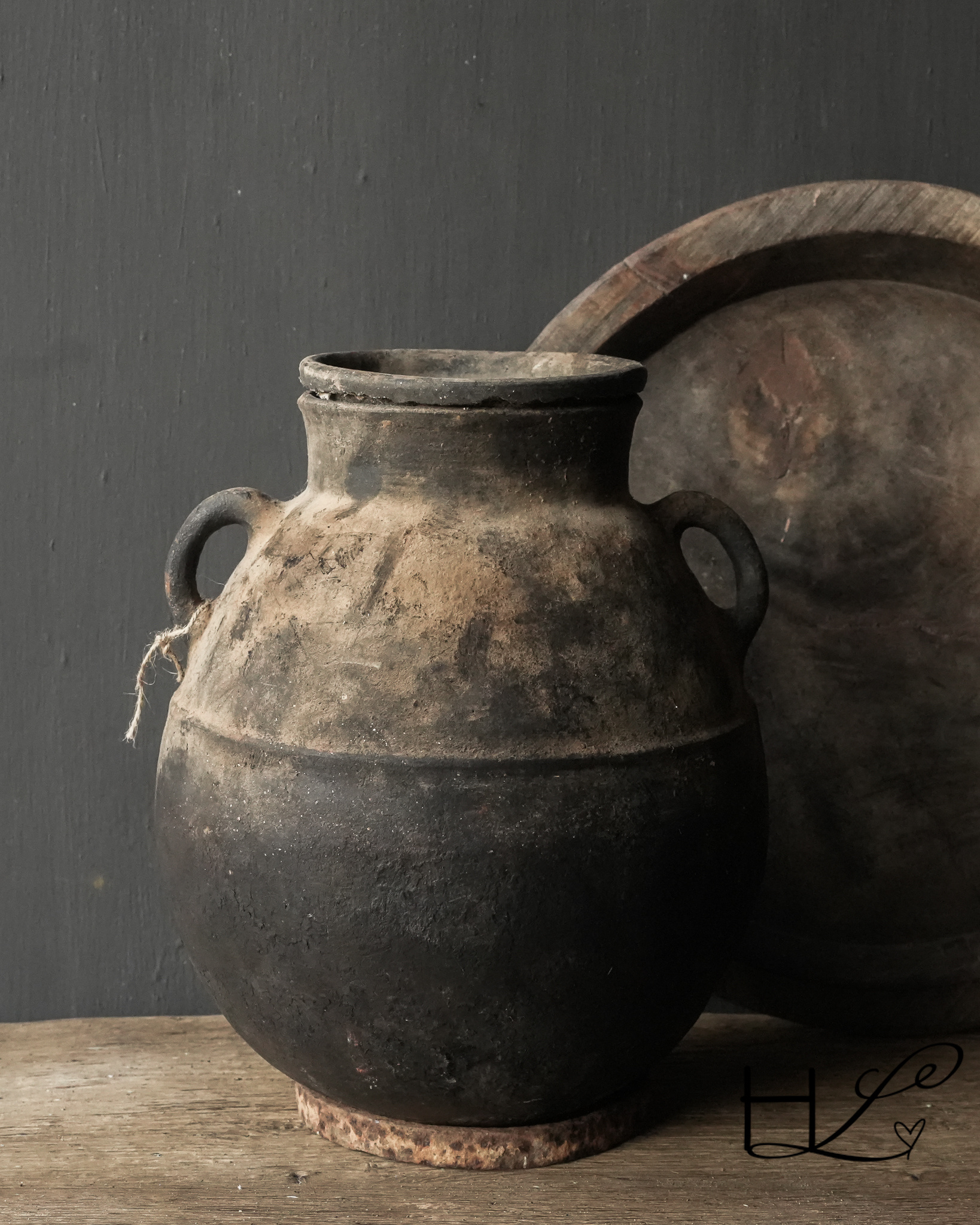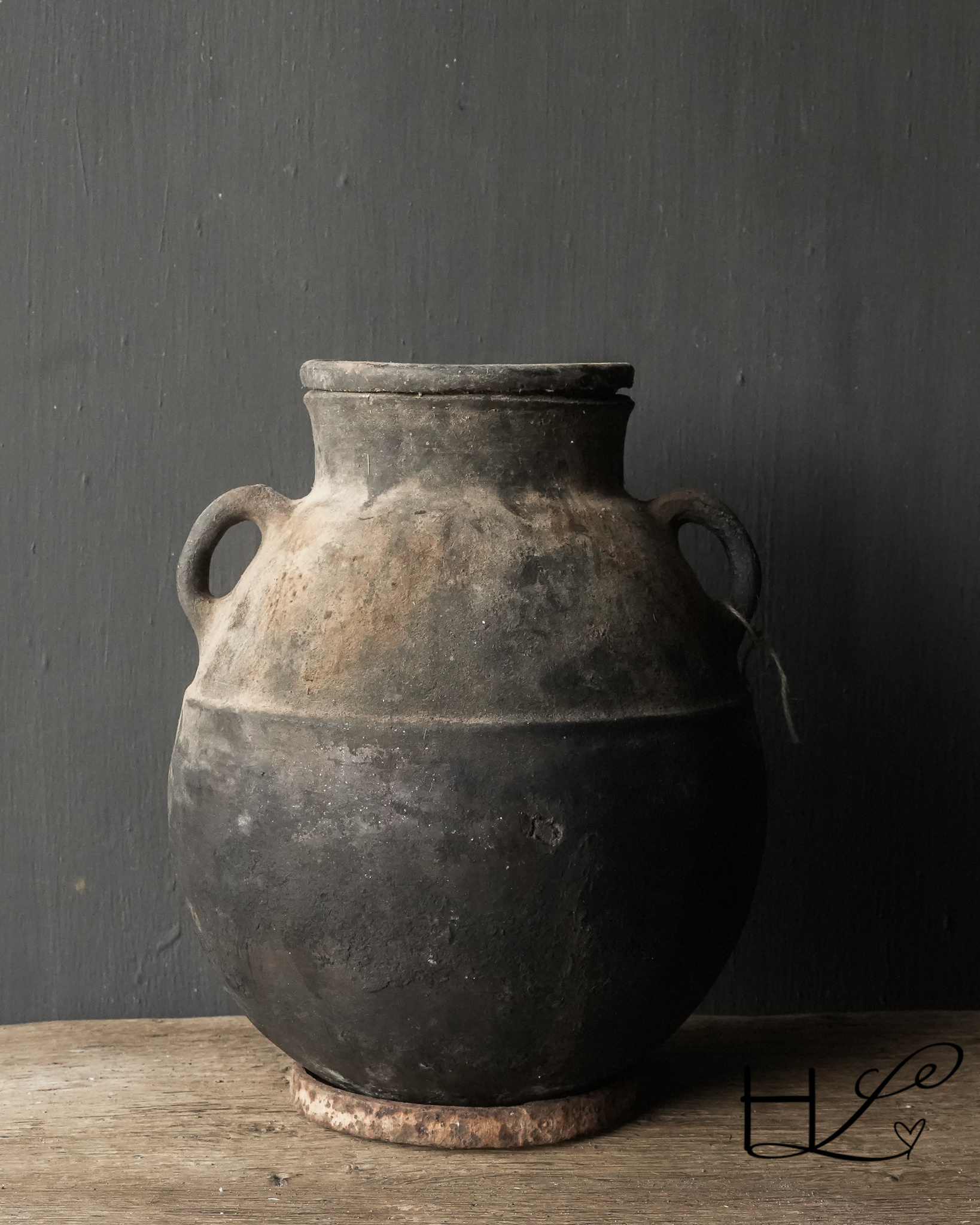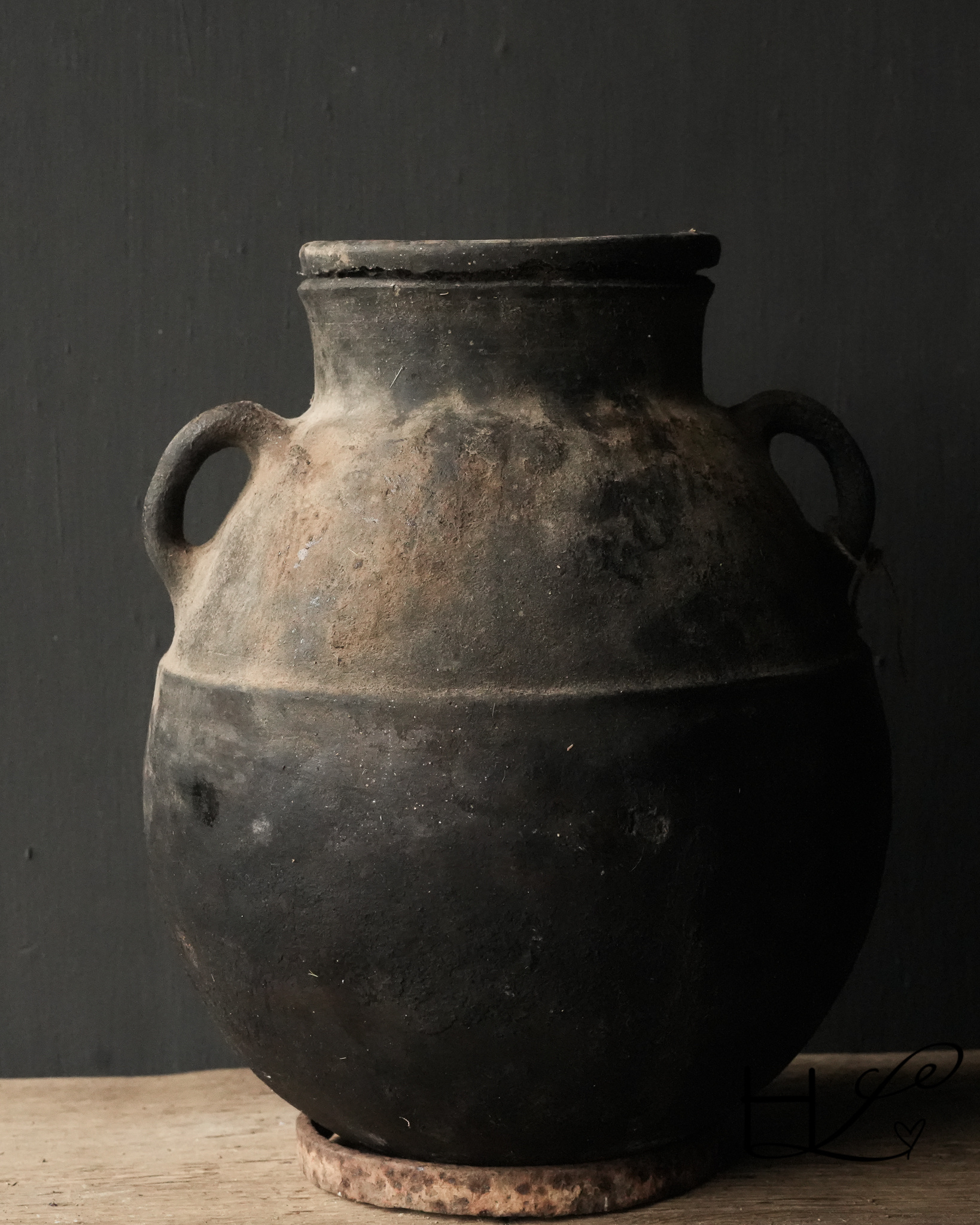 Der Krug hat einen abgerundeten Boden. Er wird mit einem alten Stahlring geliefert, auf den der Krug gestellt werden kann