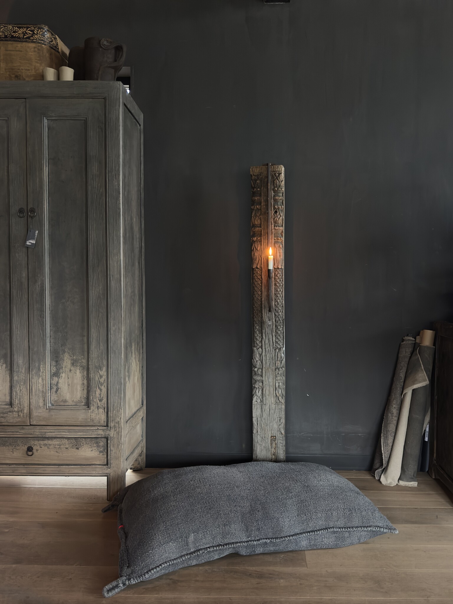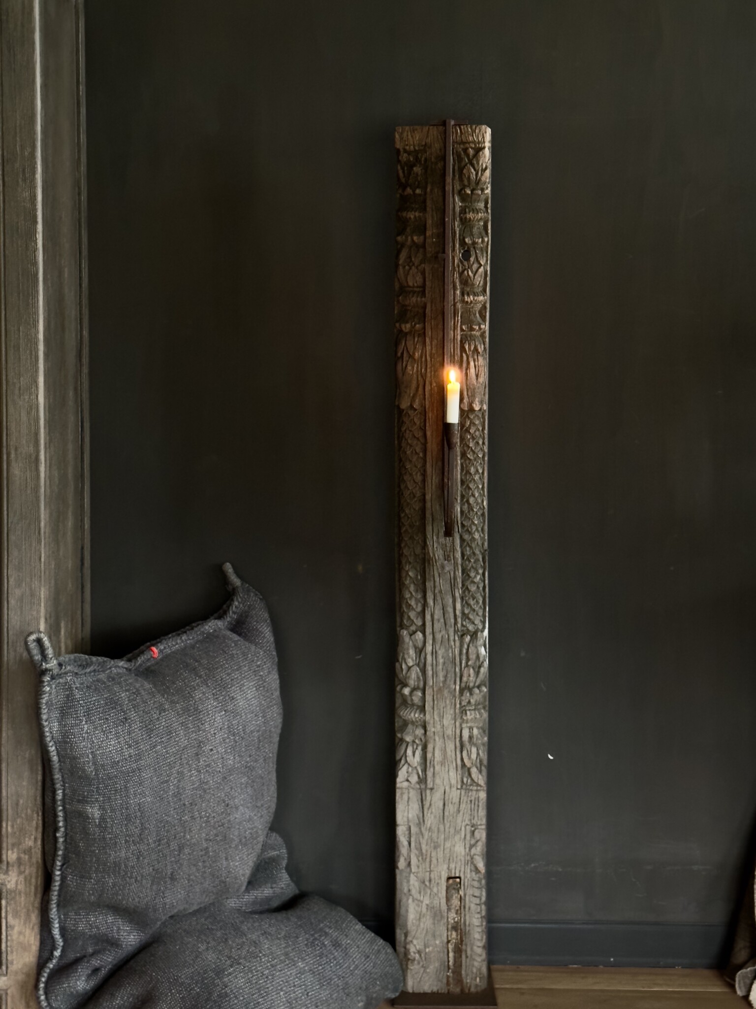 This authentic Indian wooden pillar is a unique and characterful object that instantly adds ambiance and refined simplicity to your interior. Crafted from old Indian wood, it boasts rich, weathered textures, hand-carved details, and the marks of time.
