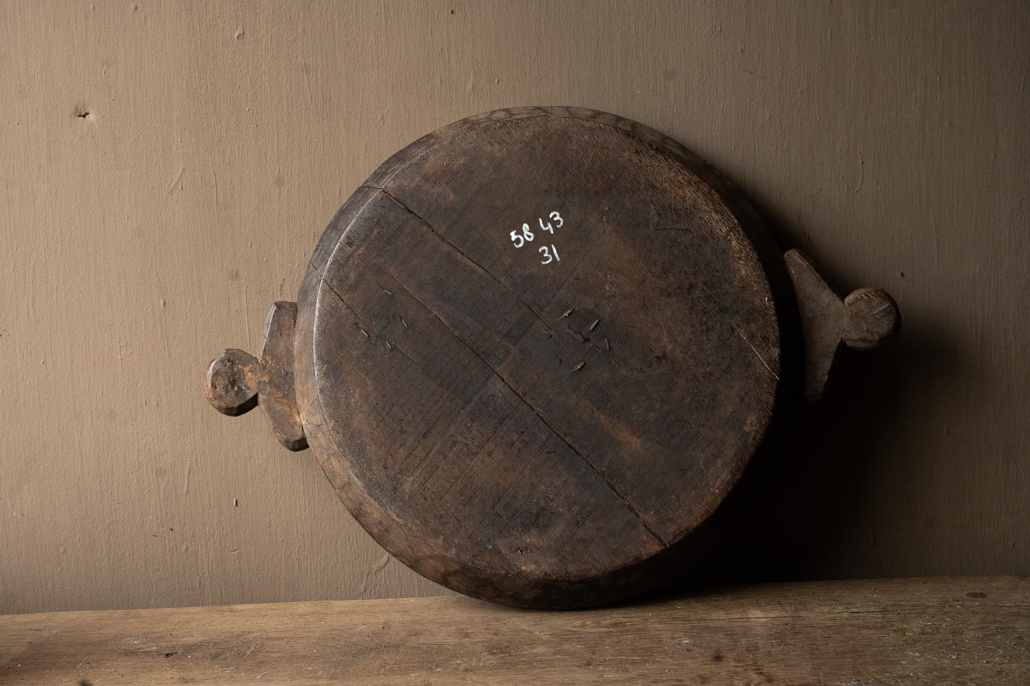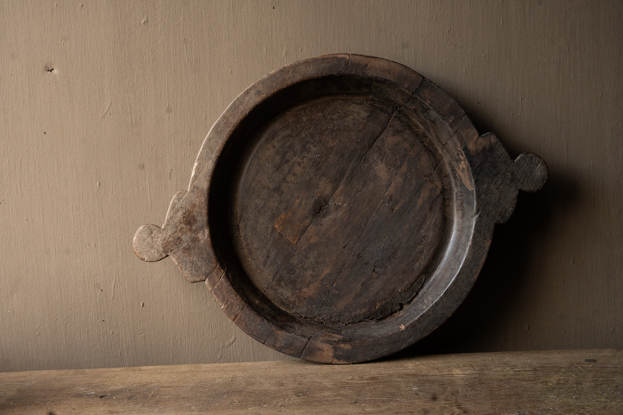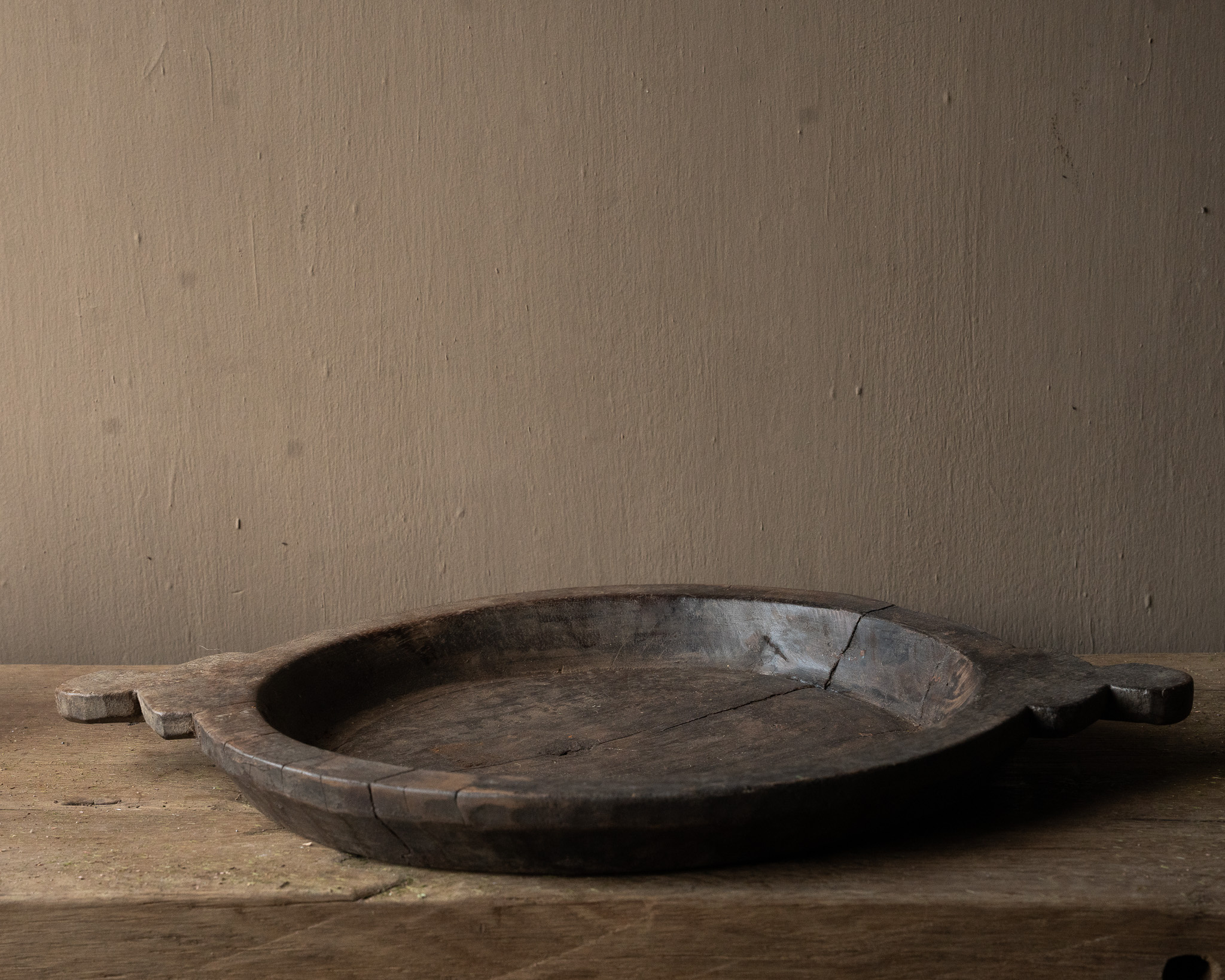 This unique, authentic Parat bowl from Nepal is hand-carved from a single piece of wood. Originally used for kneading dough, these bowls are now beloved decorative pieces in understated, rustic, and wabi-sabi interiors. The weathered texture, natural patina, and subtle signs of wear make each bowl unique.
