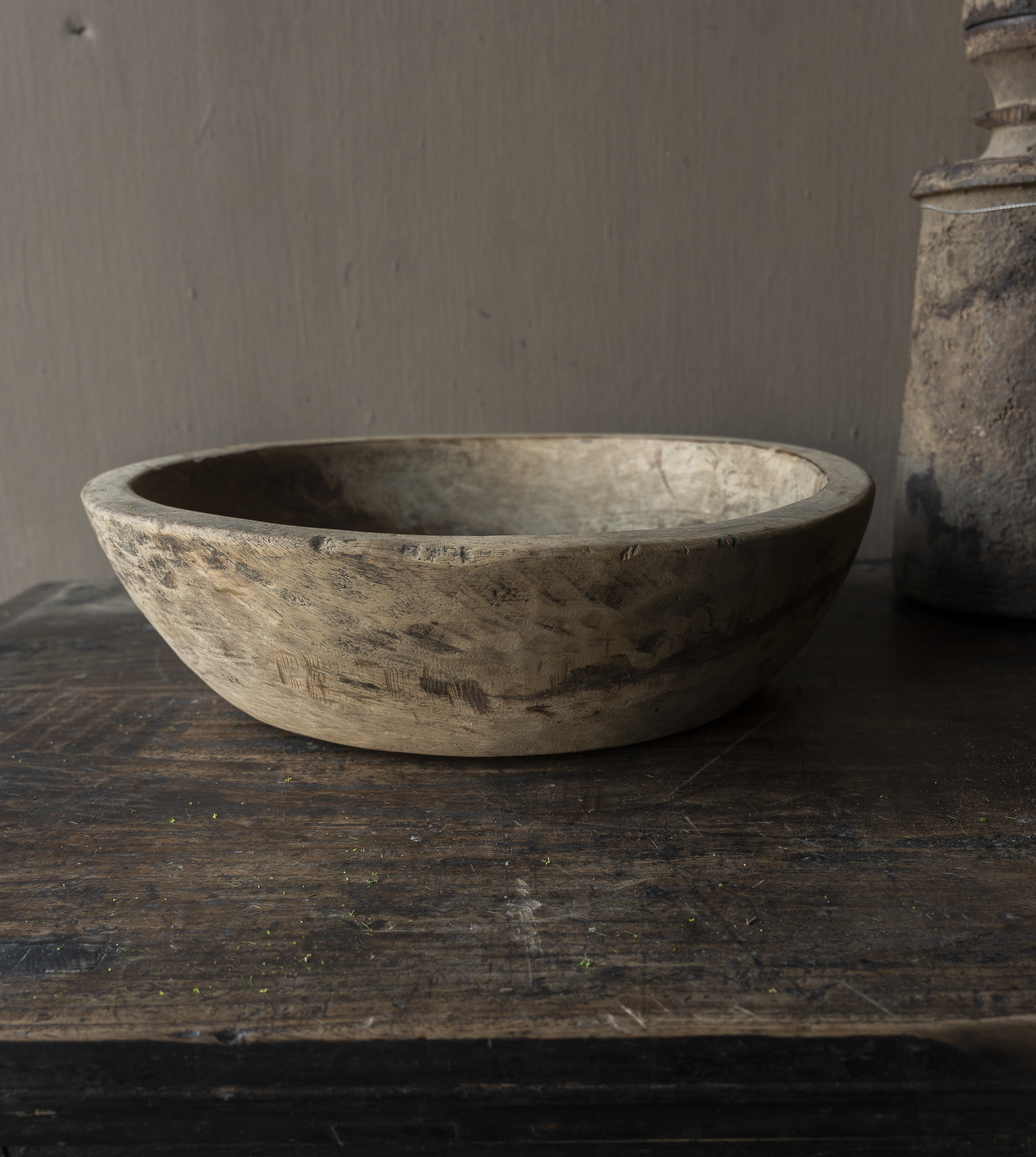This unique, authentic Parat bowl from Nepal is hand-carved from a single piece of wood. Originally used for kneading dough, these bowls are now beloved decorative pieces in understated, rustic, and wabi-sabi interiors. The weathered texture, natural patina, and subtle signs of wear make each bowl unique.