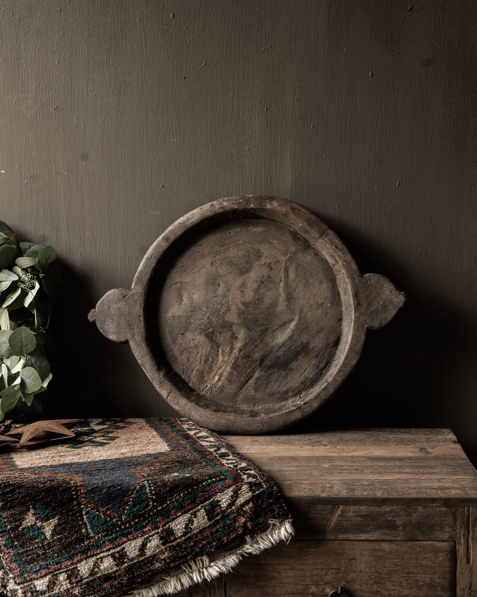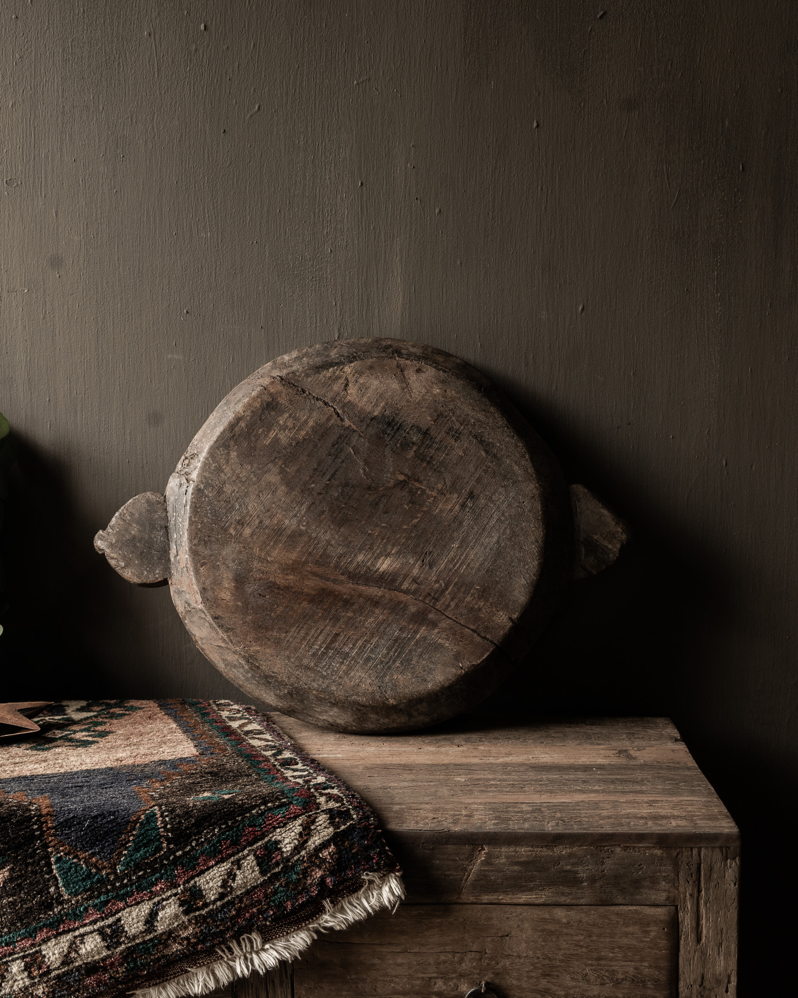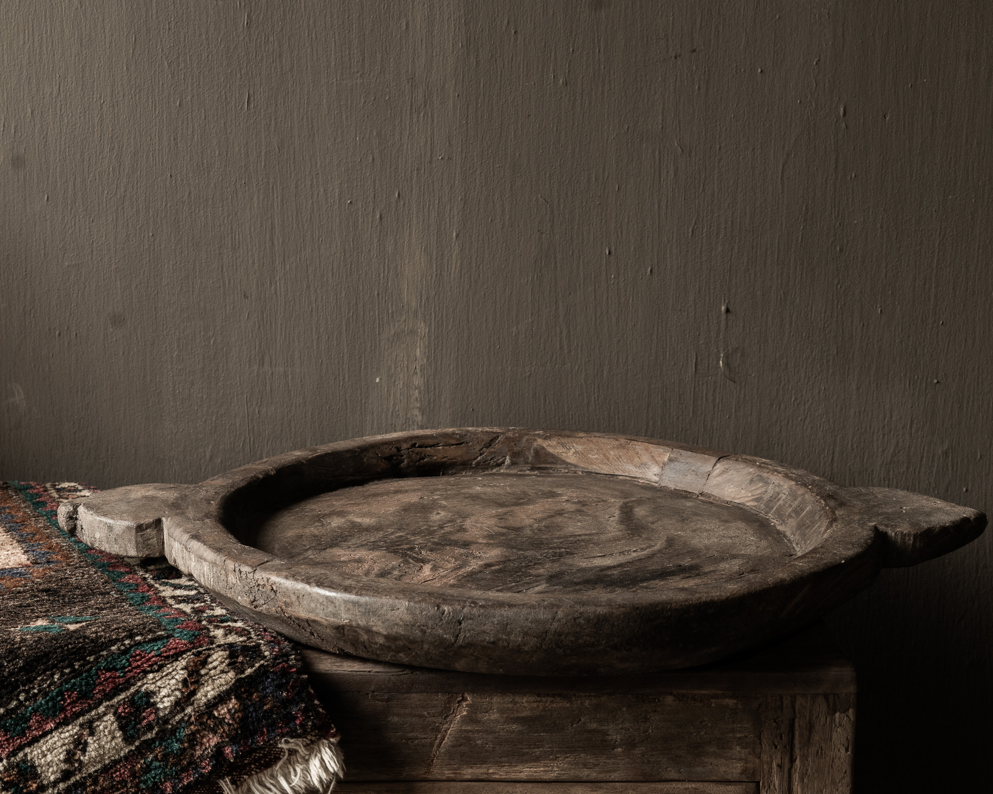 This unique, authentic Parat bowl from Nepal is hand-carved from a single piece of wood. Originally used for kneading dough, these bowls are now beloved decorative pieces in understated, rustic, and wabi-sabi interiors. The weathered texture, natural patina, and subtle signs of wear make each bowl unique.