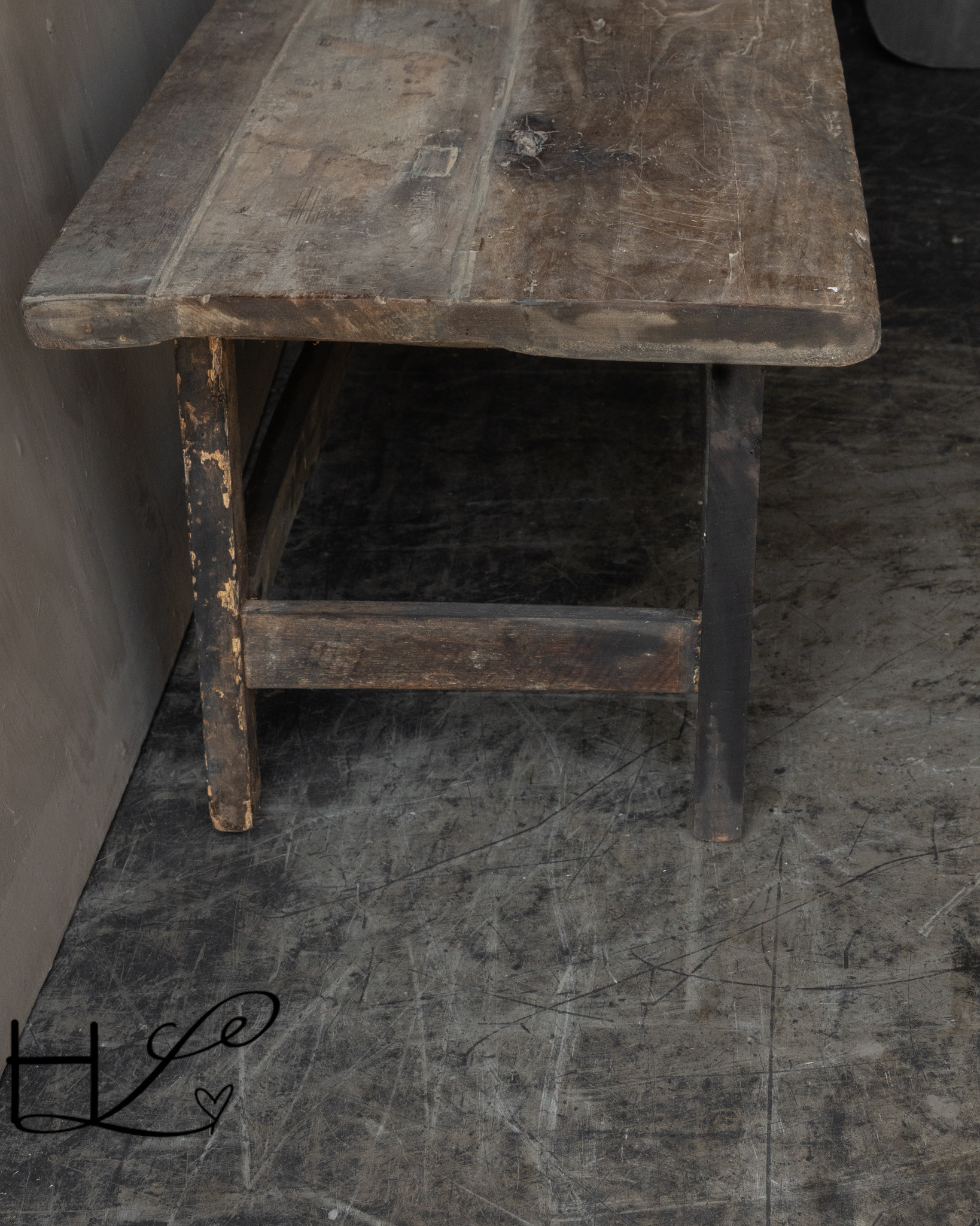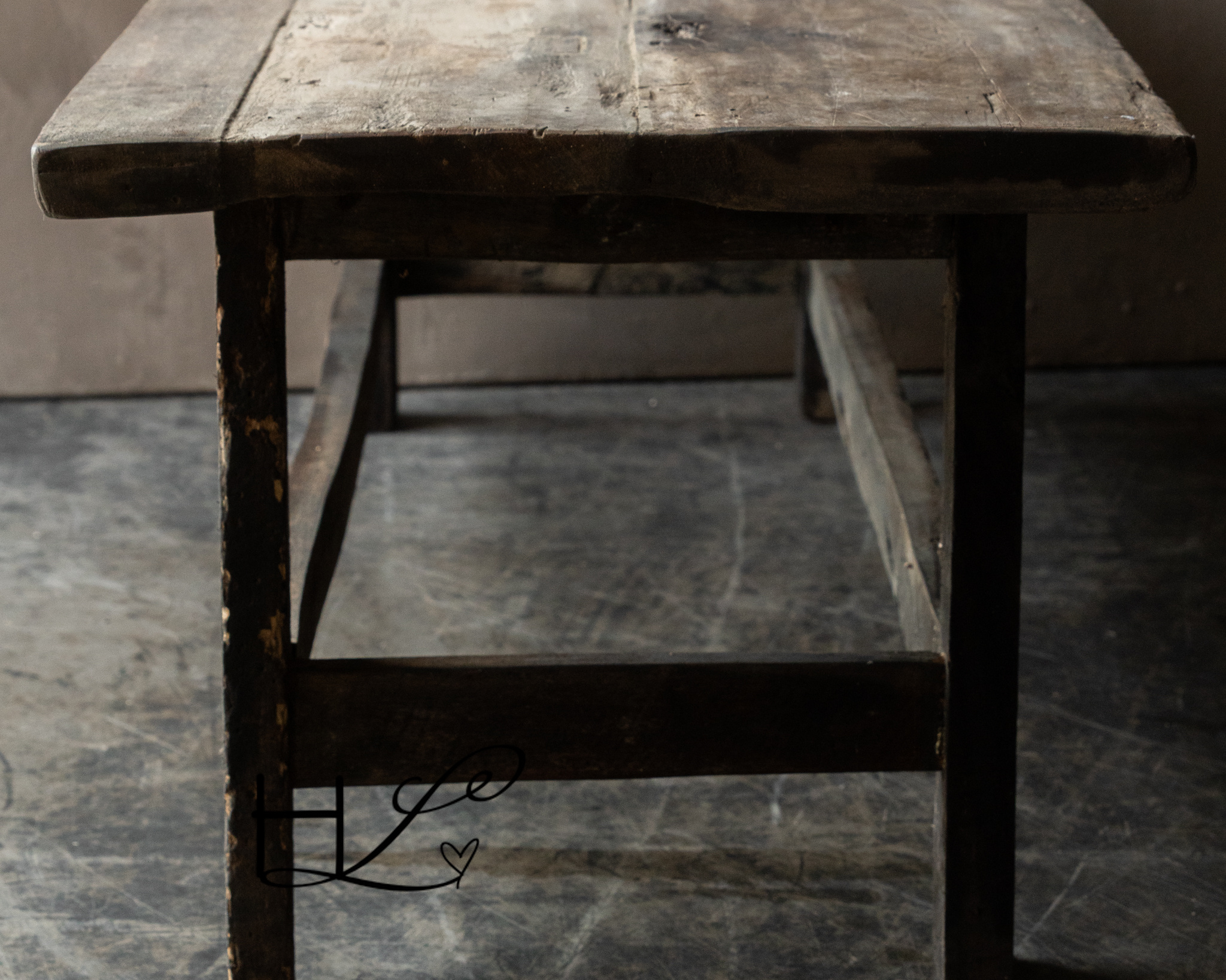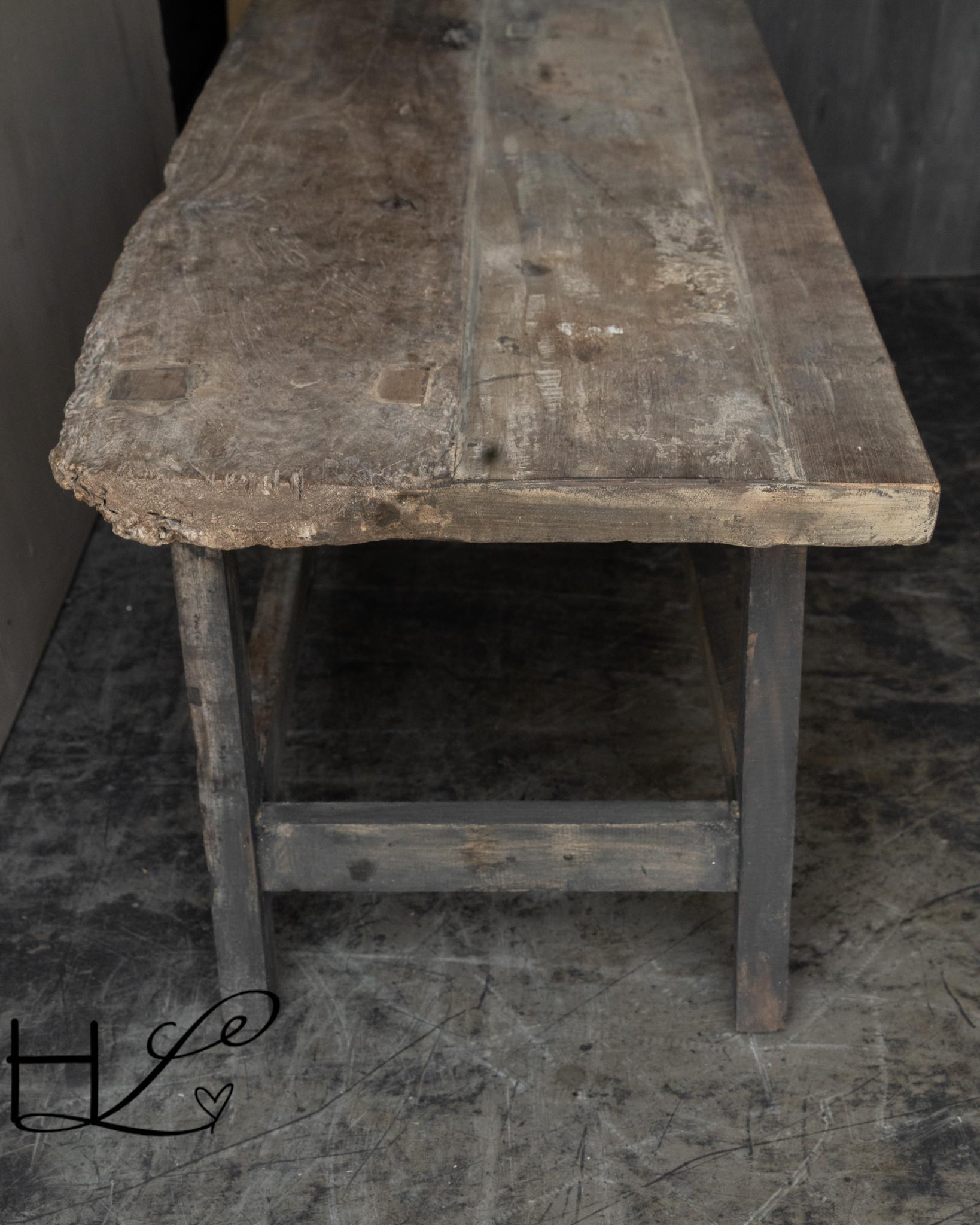 The simple, sturdy base is dark in color and still shows subtle signs of wear, giving the table a robust and pure look. The top has a rough, untreated edge on one side, preserving the wood's natural shape – a unique detail that adds extra character to the table.