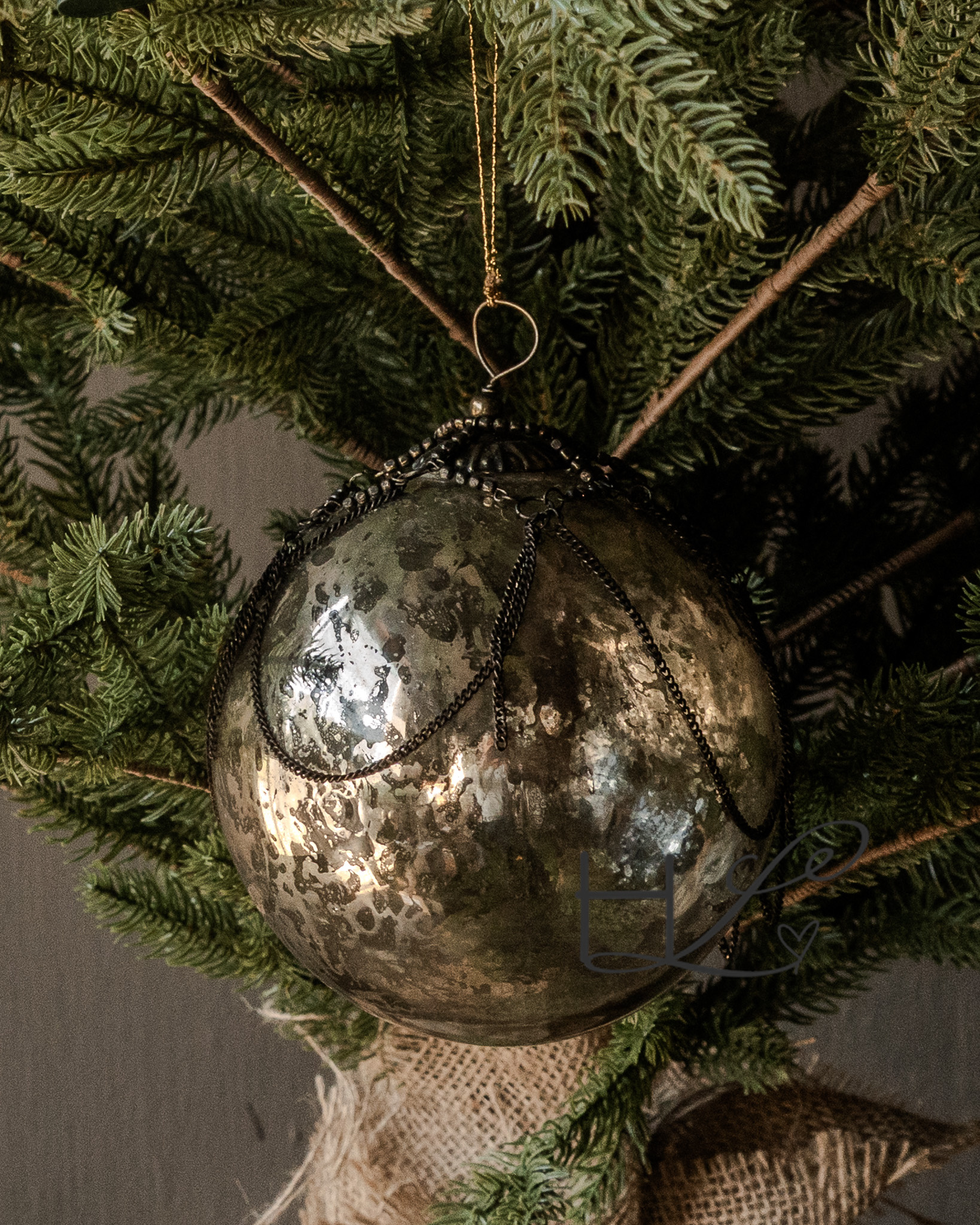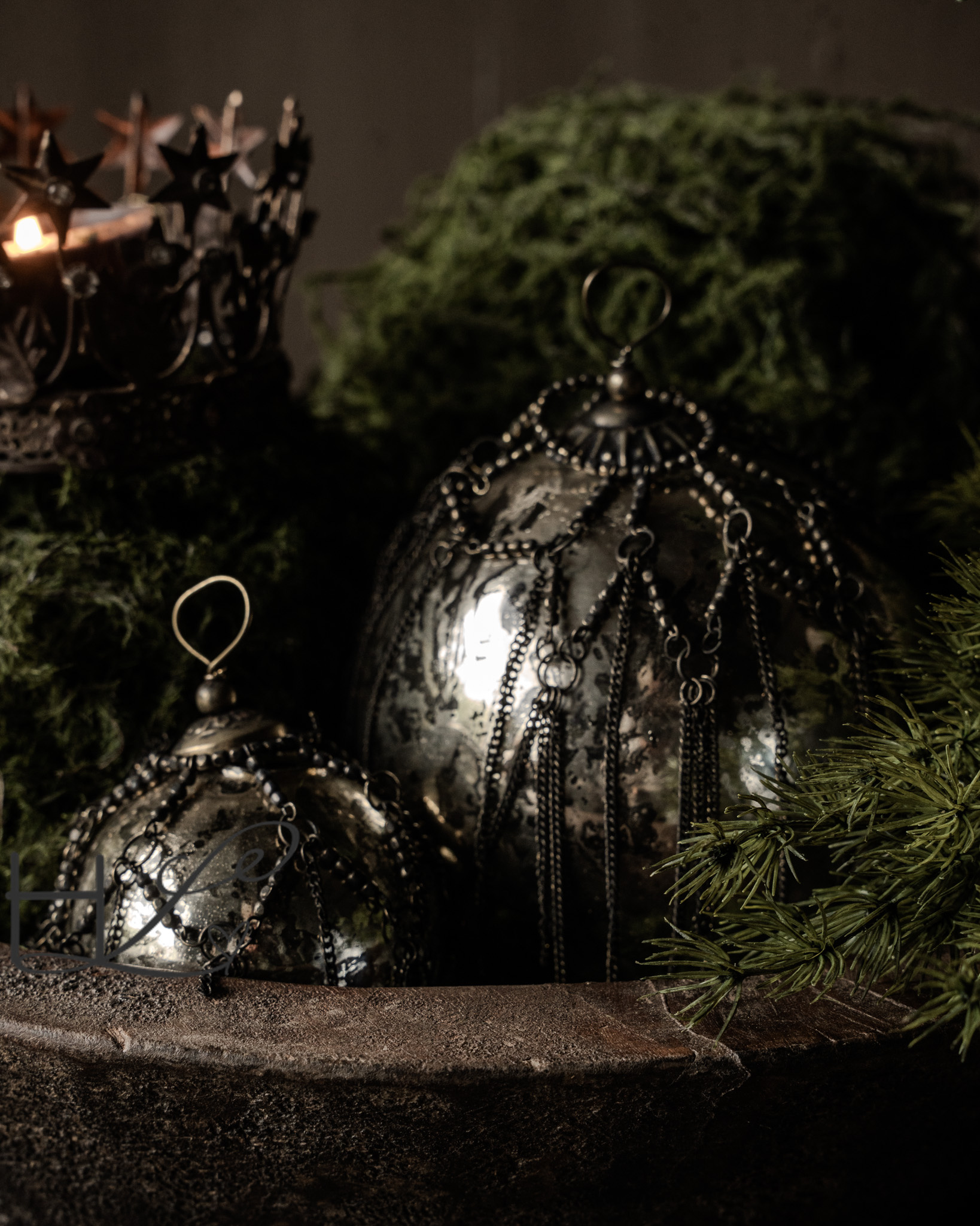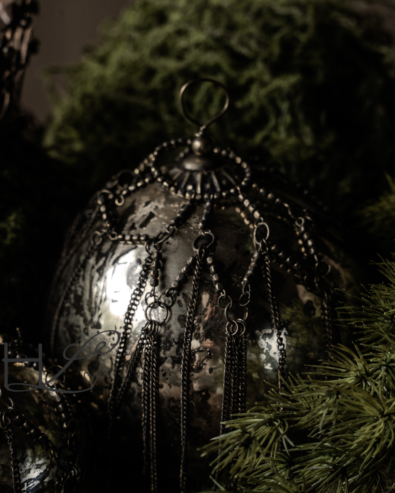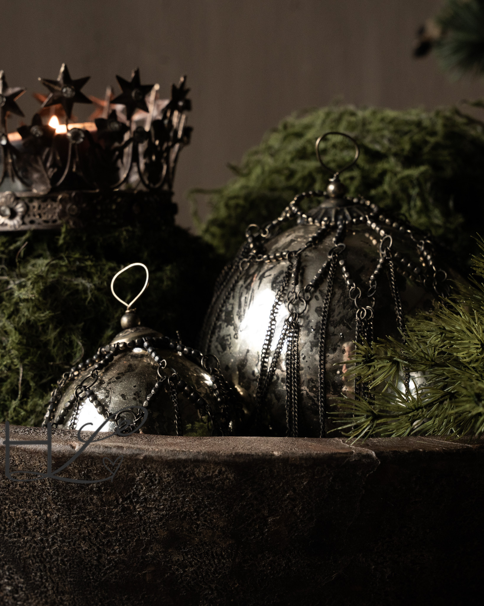 These unique Christmas baubles are crafted from mouth-blown glass in a warm antique gold finish. The subtle mirrored effect and the dark metal chains surrounding them give them a rugged and authentic look, perfectly suited to a warm, understated Christmas style.