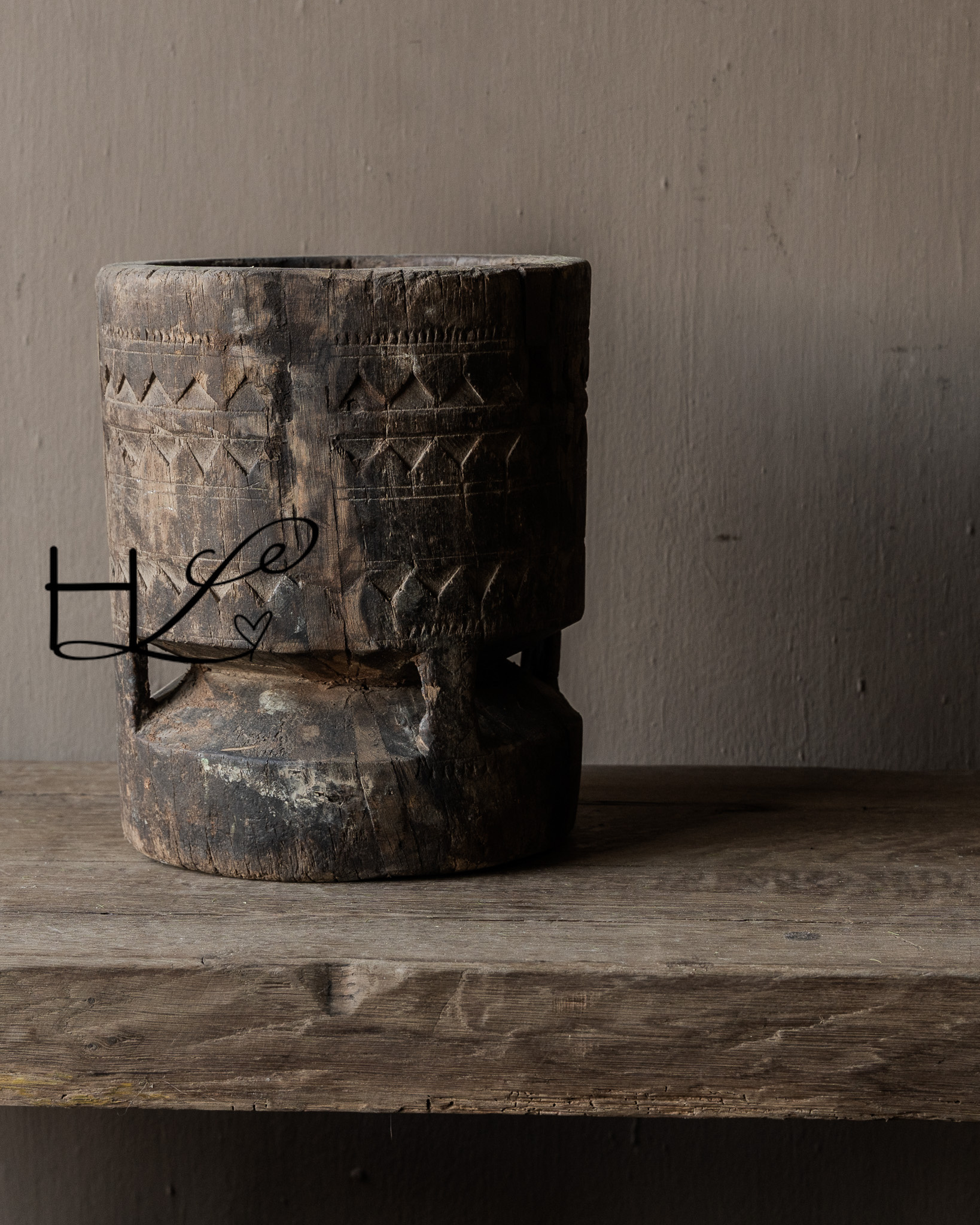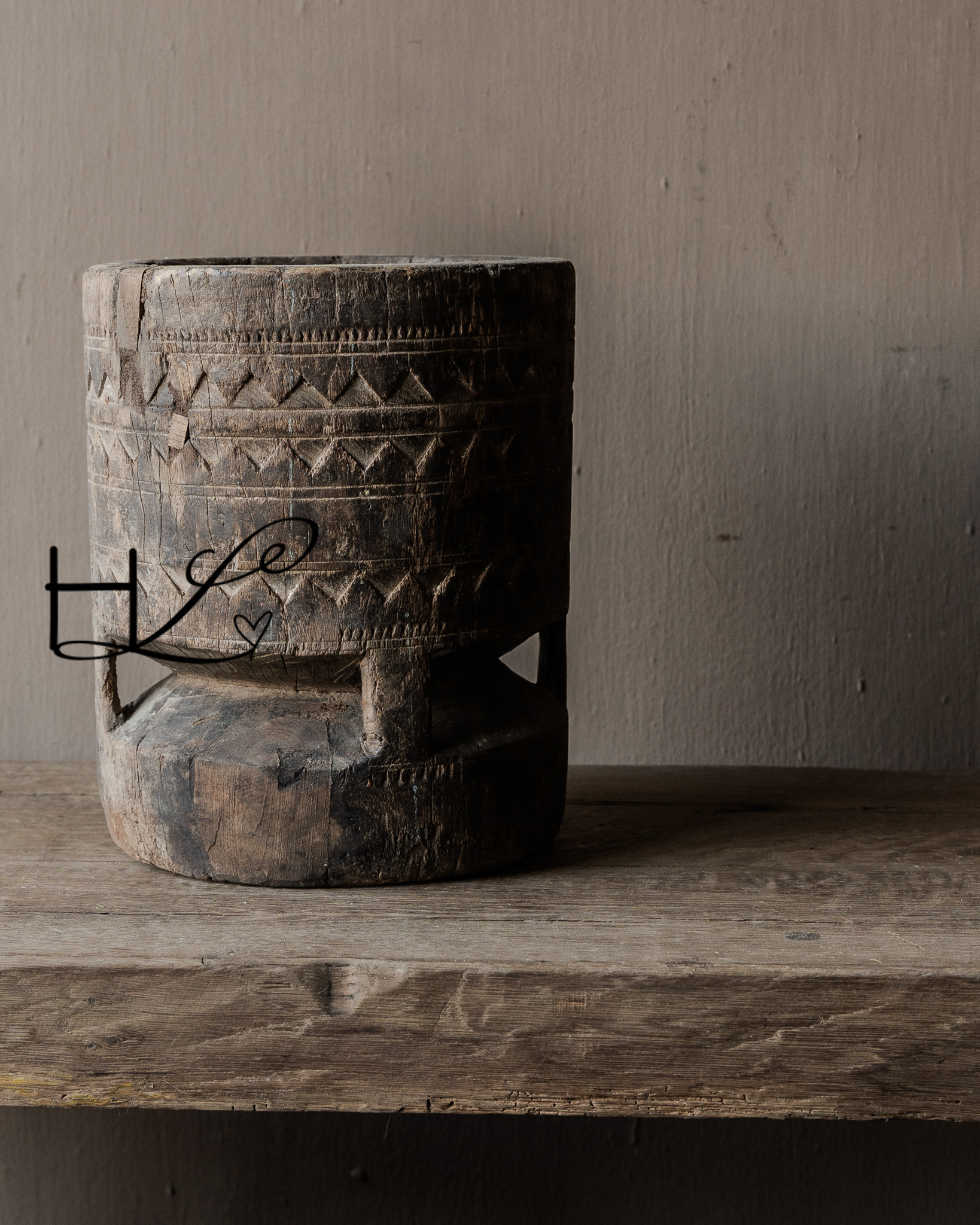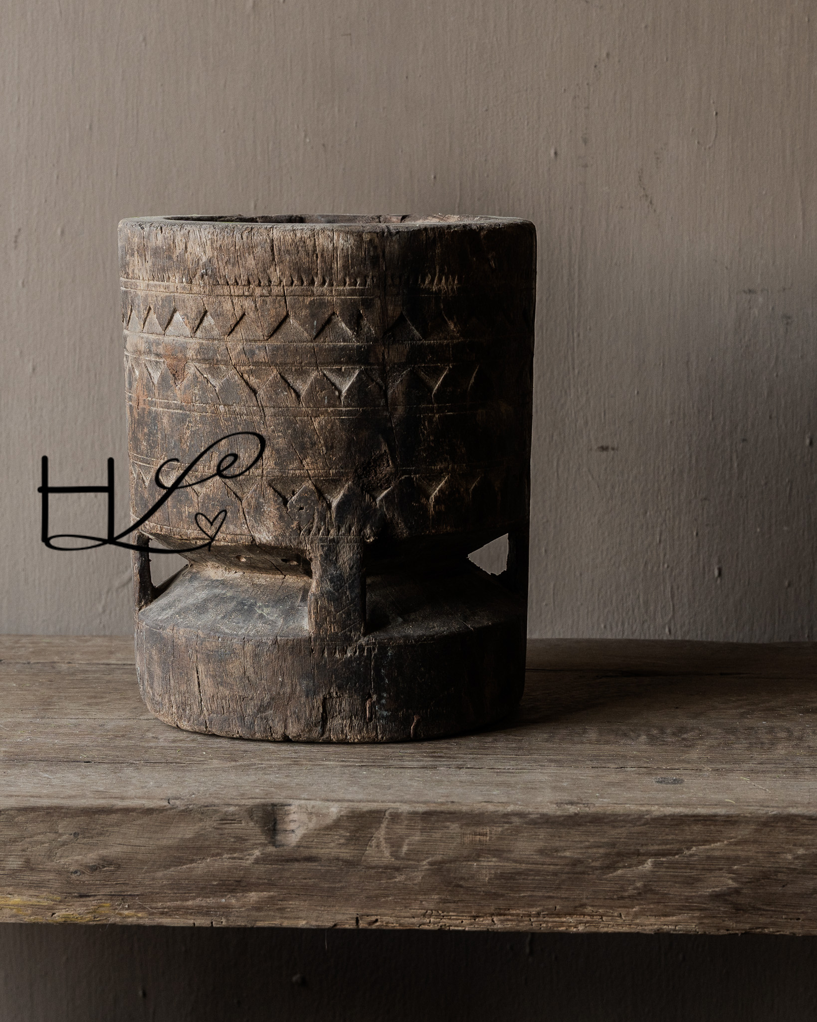 This old wooden mortar is a powerful and pure object with a visibly lived-in past. Handcrafted from solid wood and adorned with hand-carved motifs , this piece tells its own story. The imperfections, wear, and irregularities make each mortar unique and give it that characteristic wabi-sabi look.