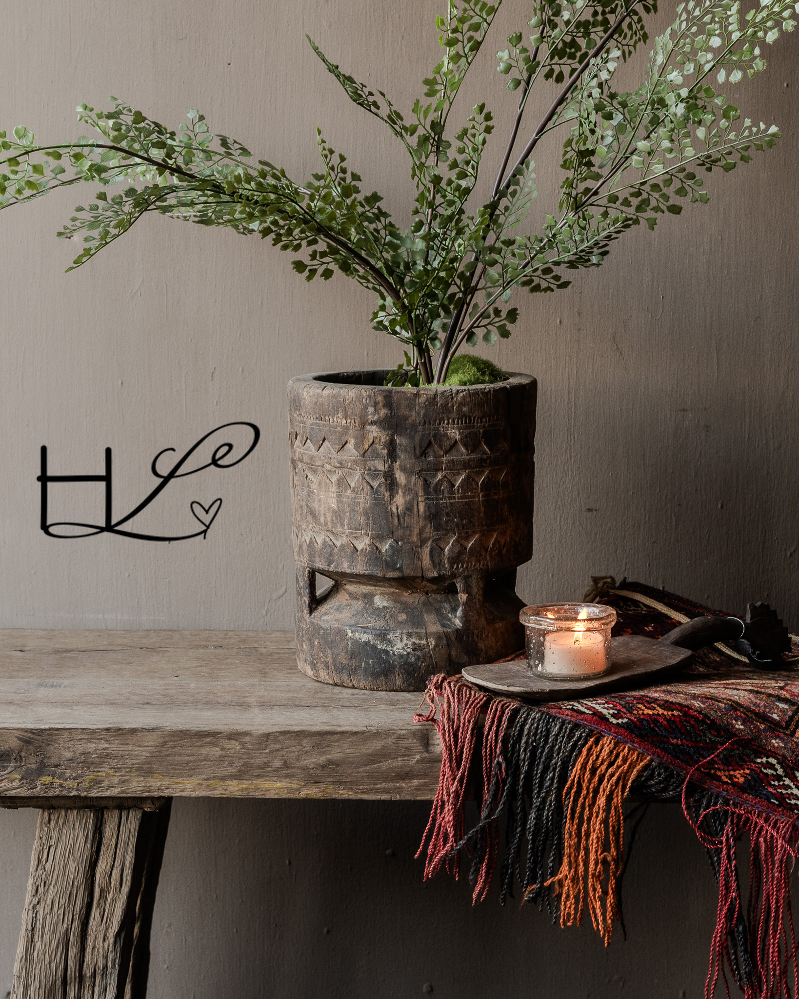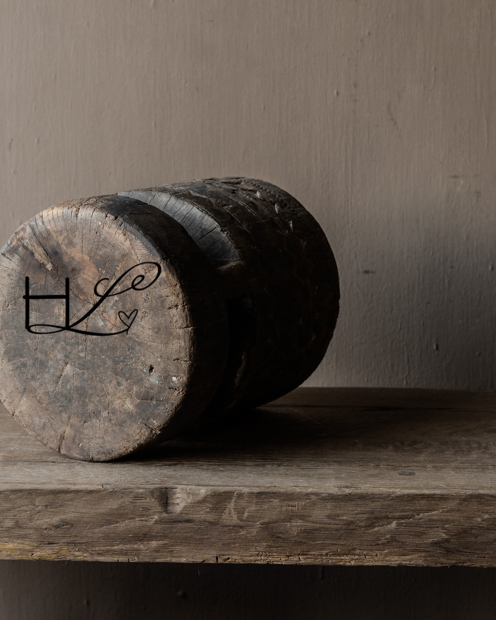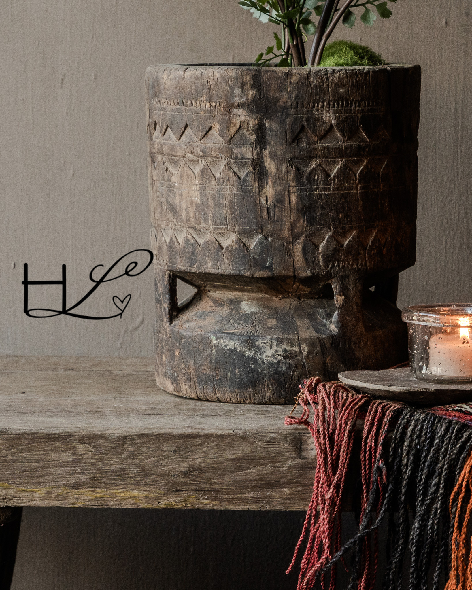 This old wooden mortar is a powerful and pure object with a visibly lived-in past. Handcrafted from solid wood and adorned with hand-carved motifs , this piece tells its own story. The imperfections, wear, and irregularities make each mortar unique and give it that characteristic wabi-sabi look.