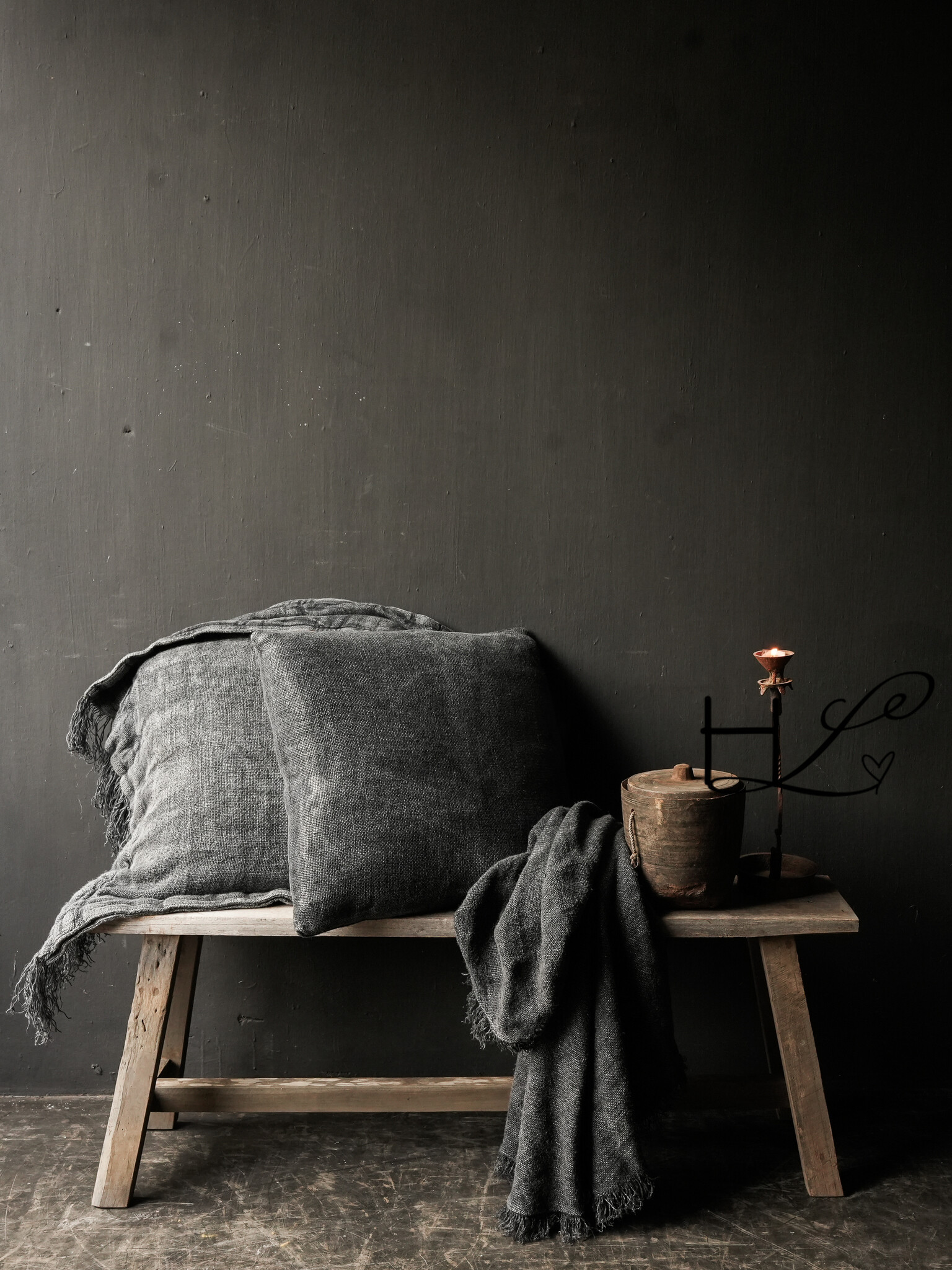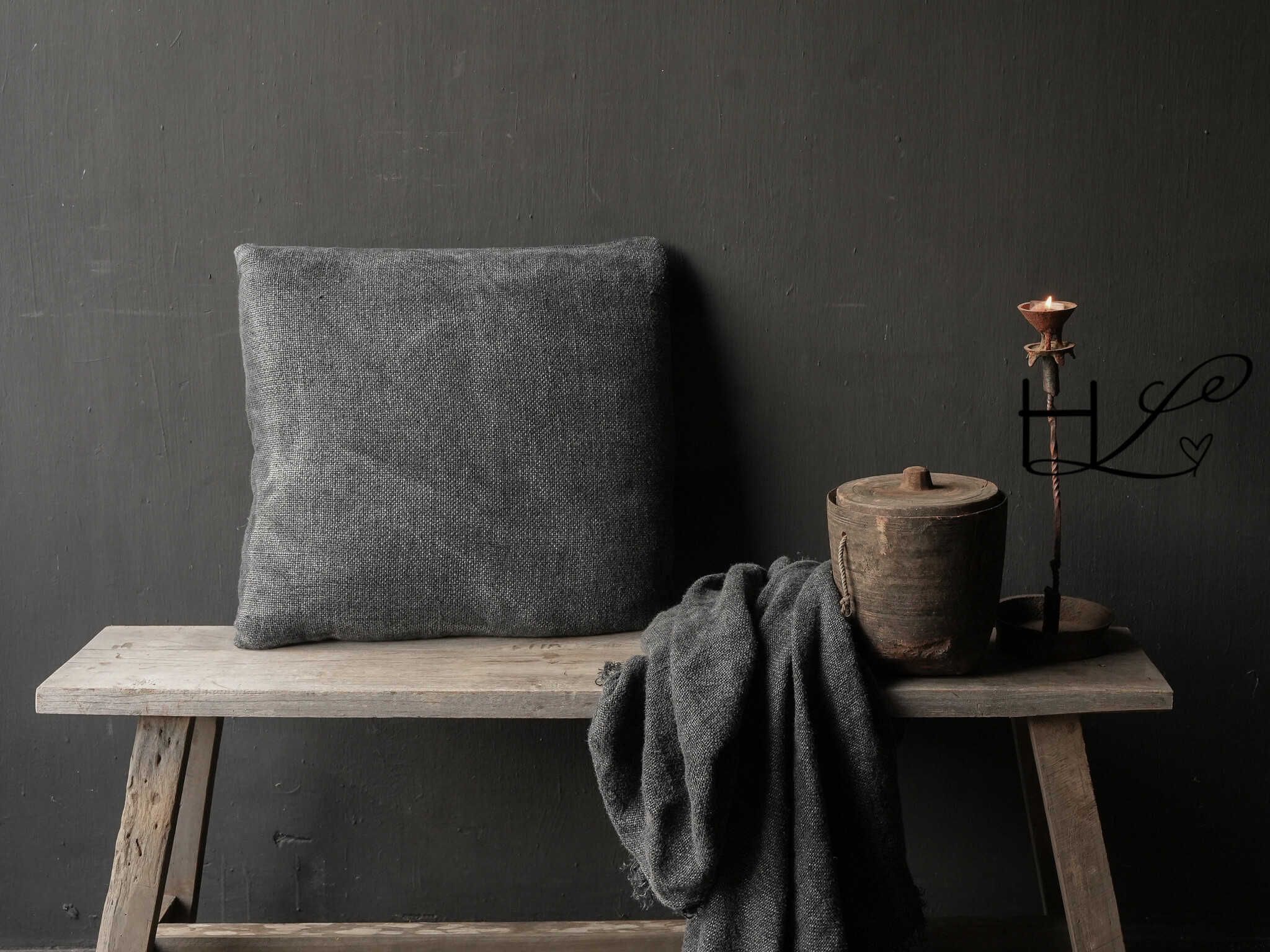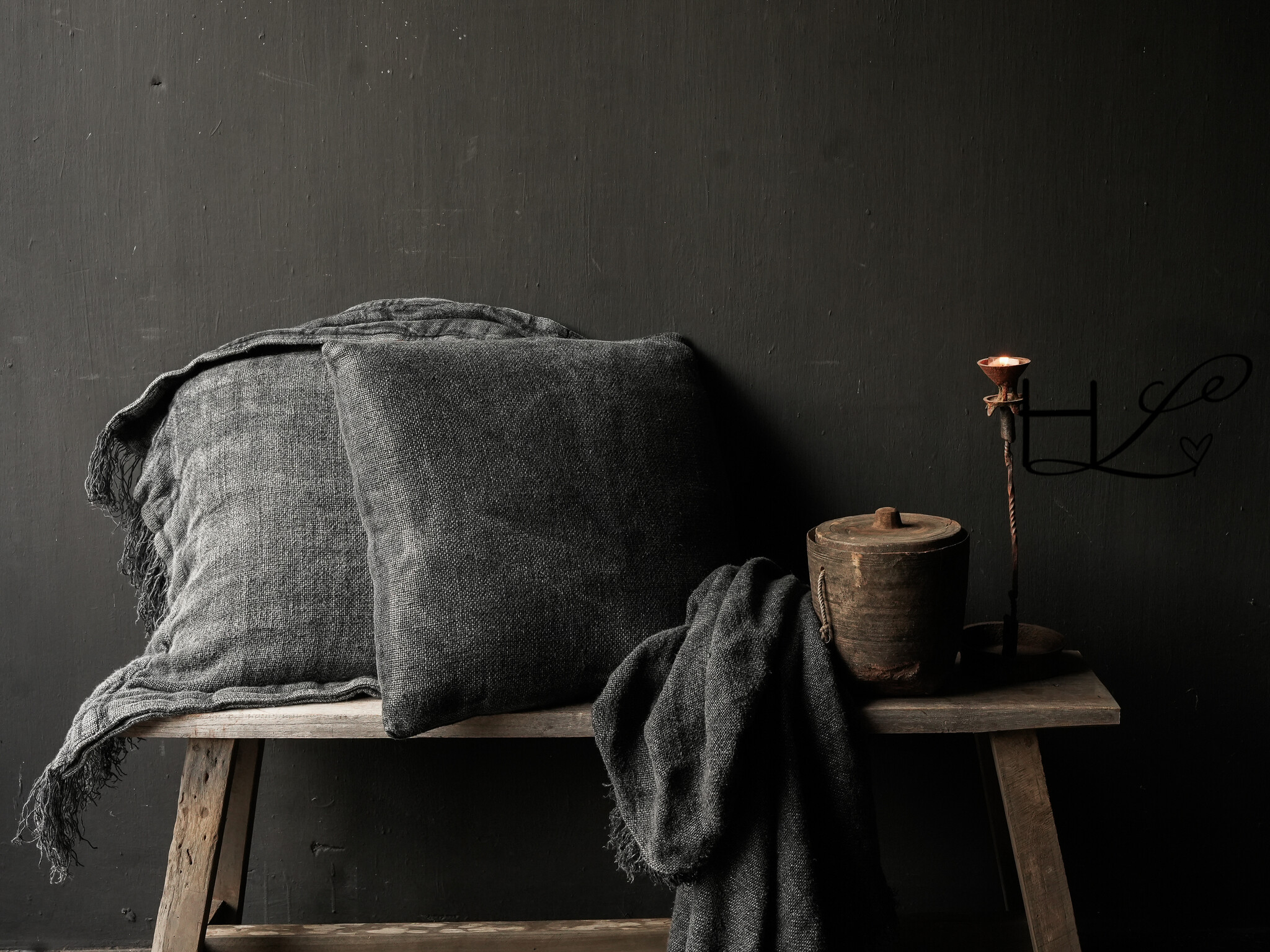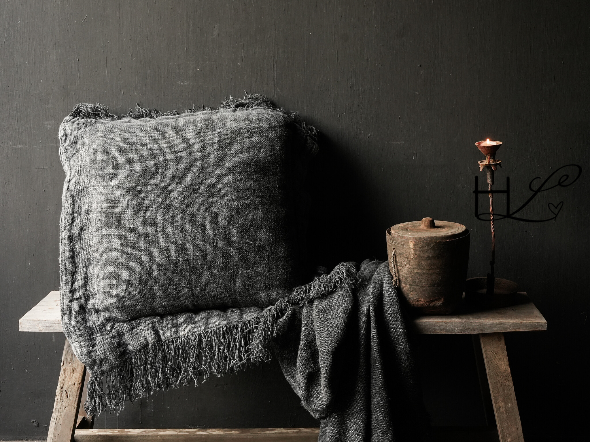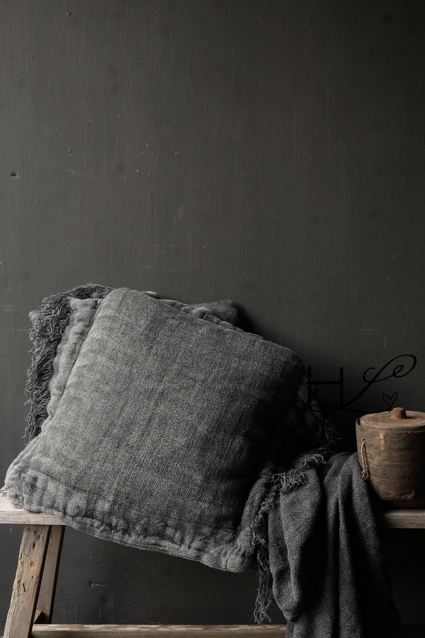 The … cushion is comfortable and very soft. Available in 2 colours in stonewashed grey Rebecca and Esther is the Pure natural. Combine them with each other or with the other cushions or plaids from the Vlasz Collection for a playful effect. The cushion cover has a zipper and there is an inner cushion.