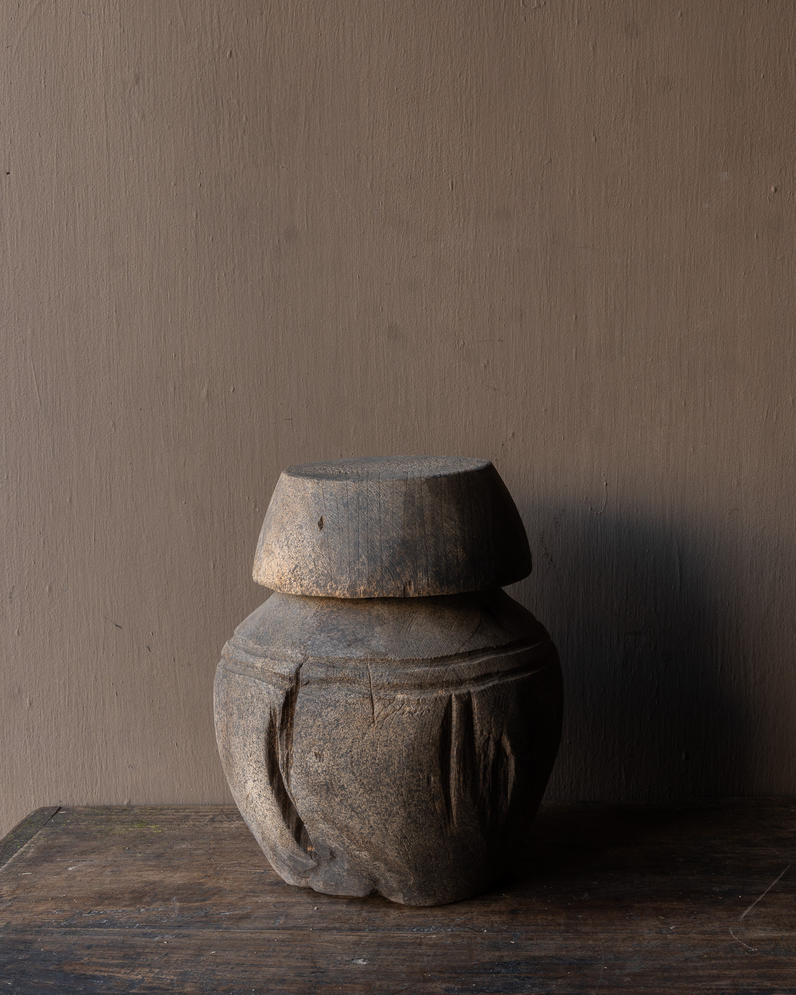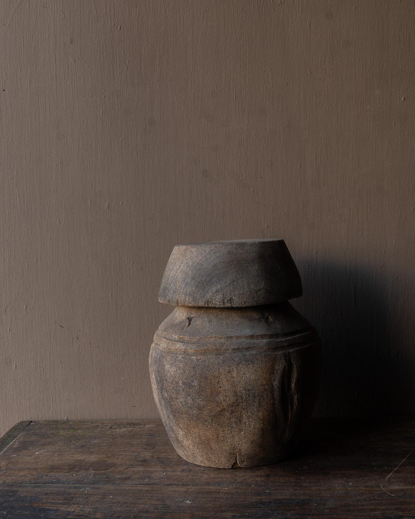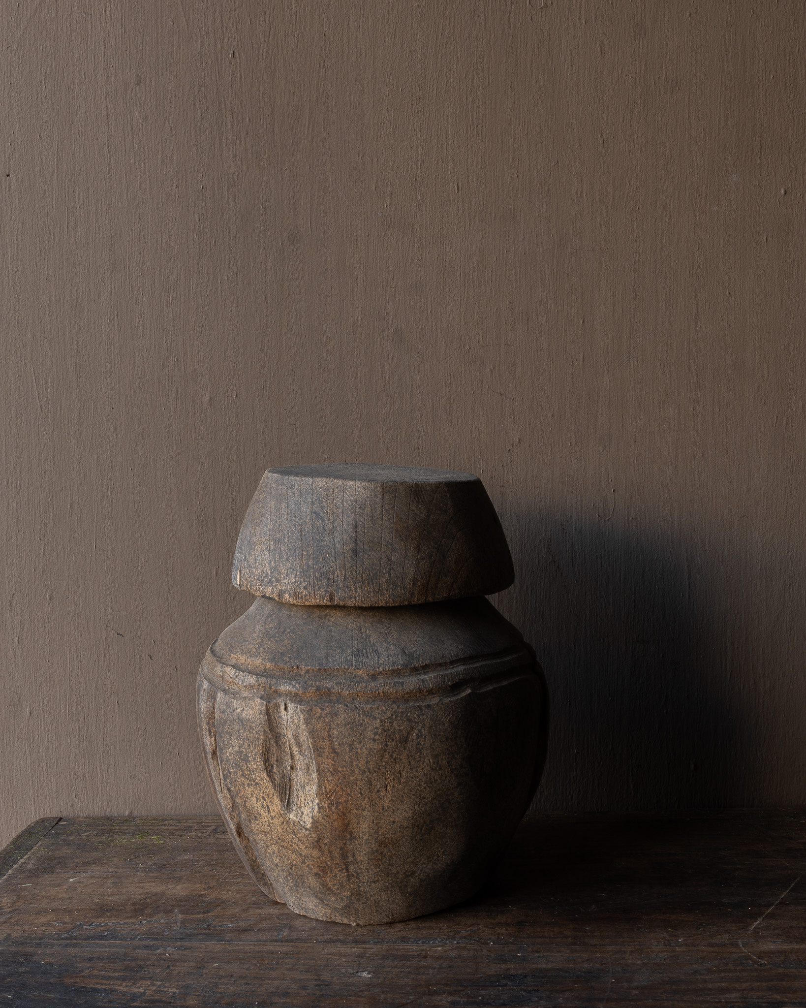 These pots were once used as workpieces or shaped pieces in traditional handicrafts, or as a base on which other pots, pans, or grain bowls rested. The solid wood and subtle lines around the neck give this piece a strong, robust appearance.