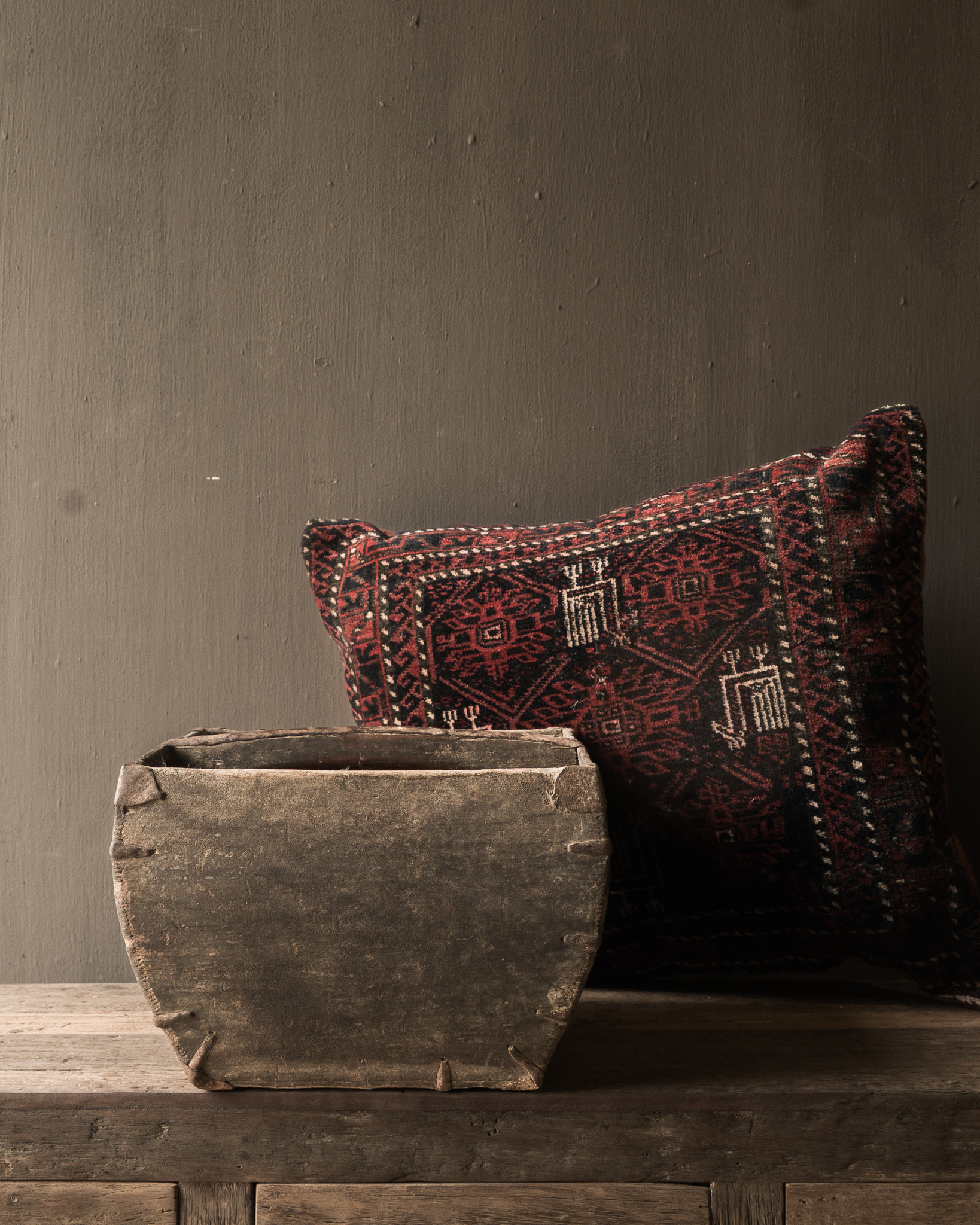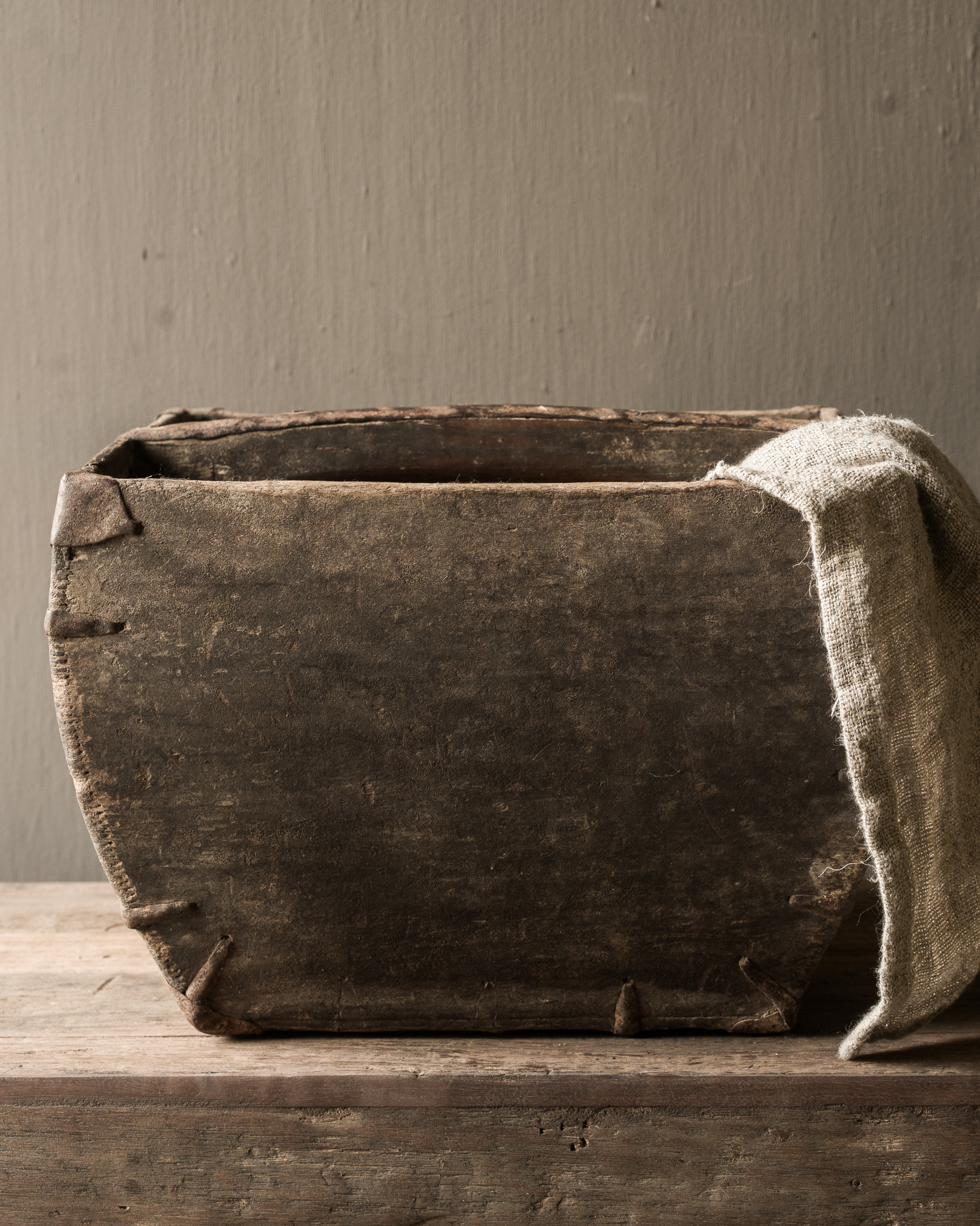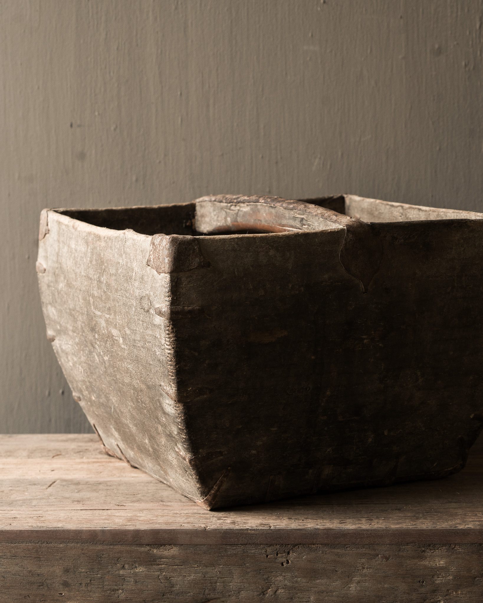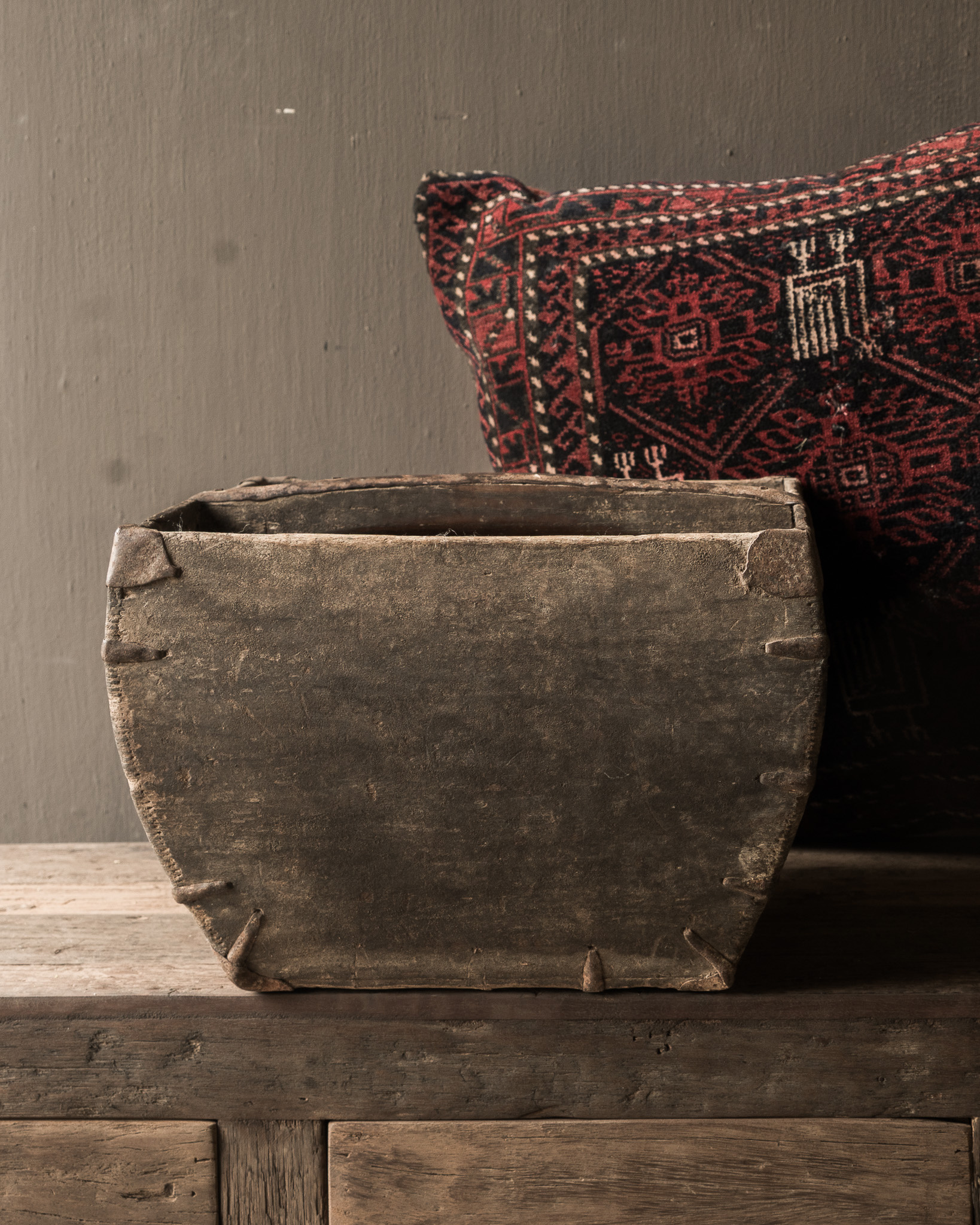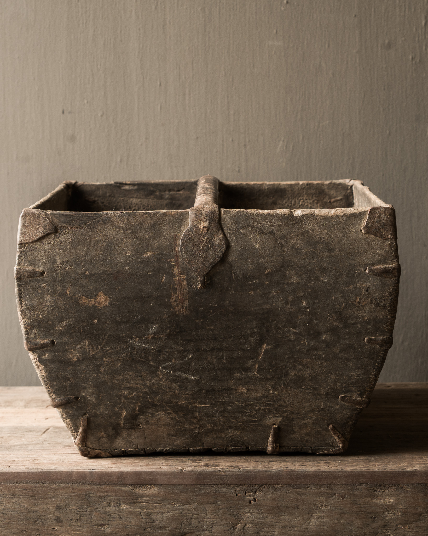 A beautiful old wooden utensil with a weathered appearance and a weathered patina. This authentic container was originally used in India for storing or sowing rice and grains. The container is handmade and still clearly shows the signs of time and use, making each piece unique.