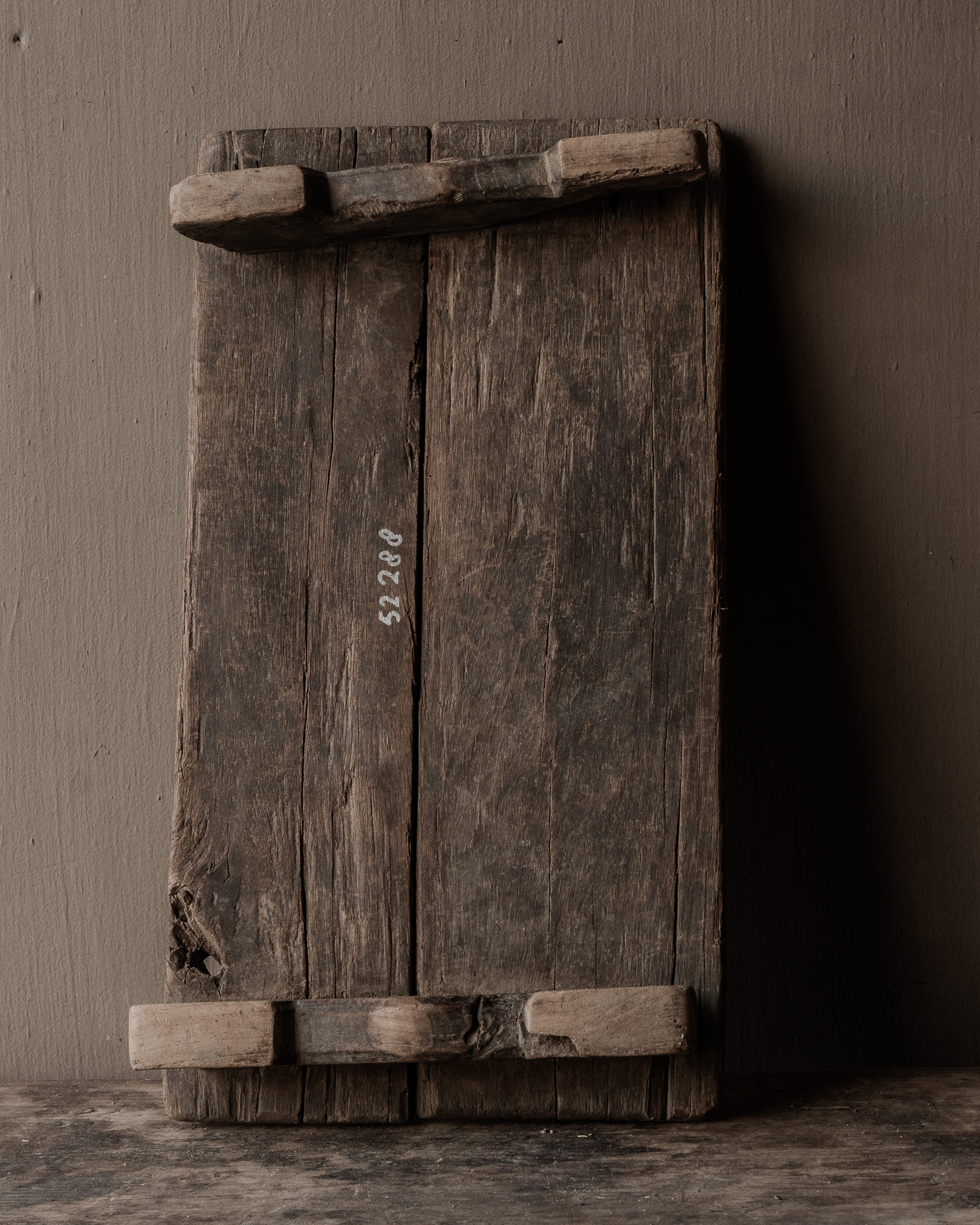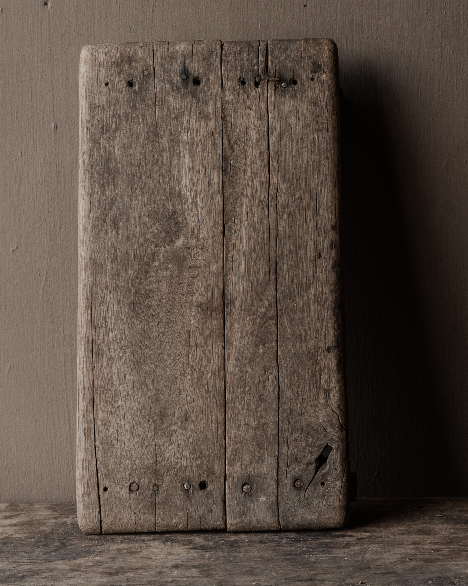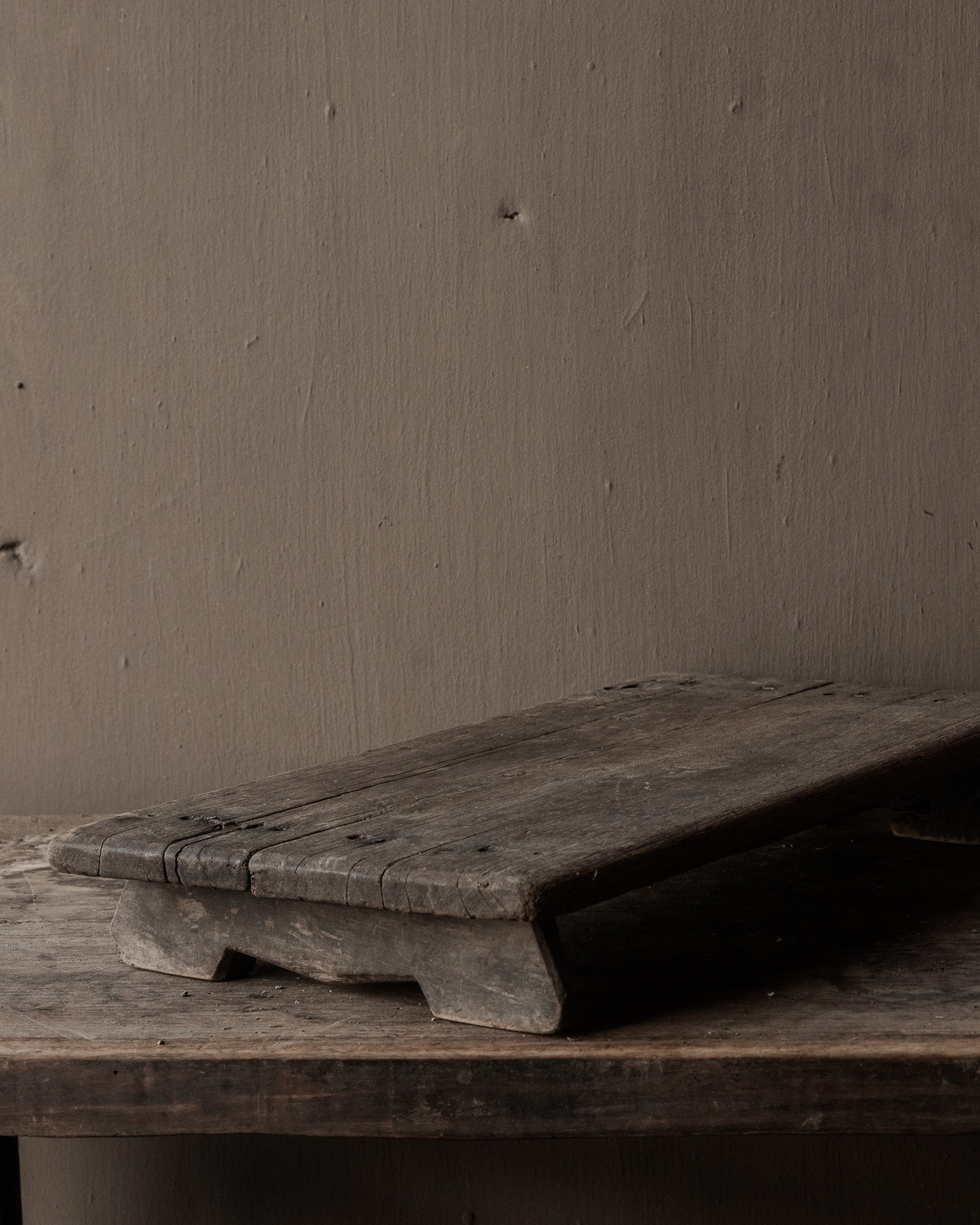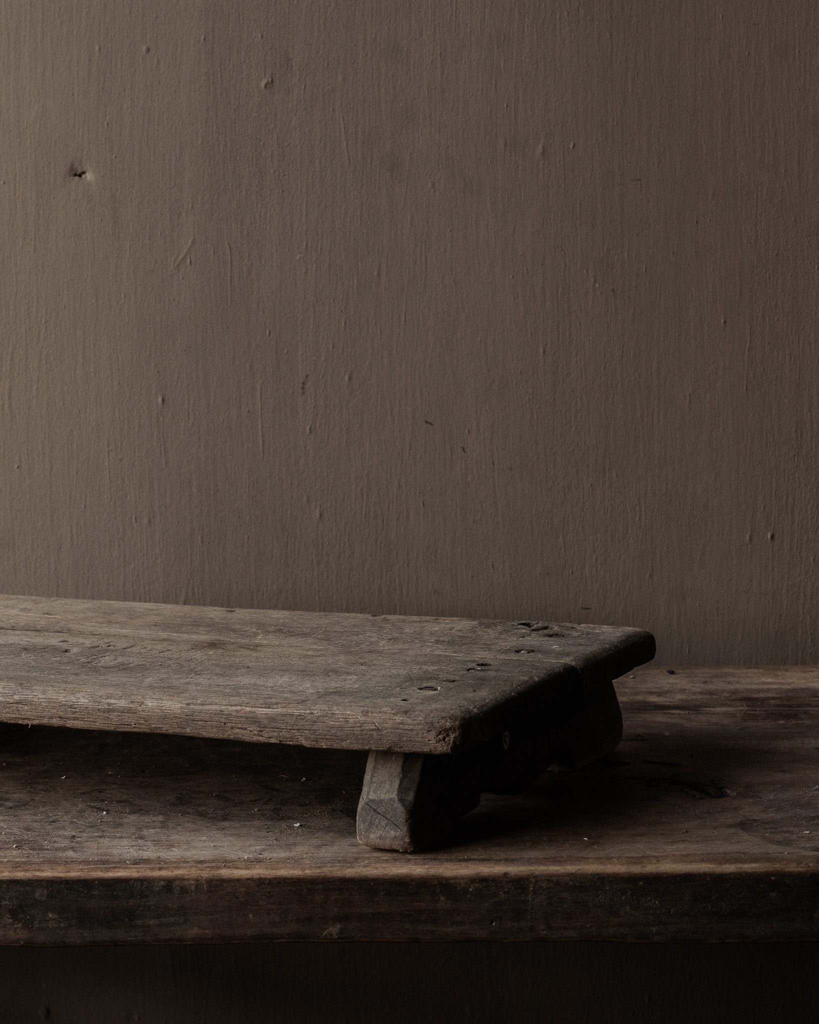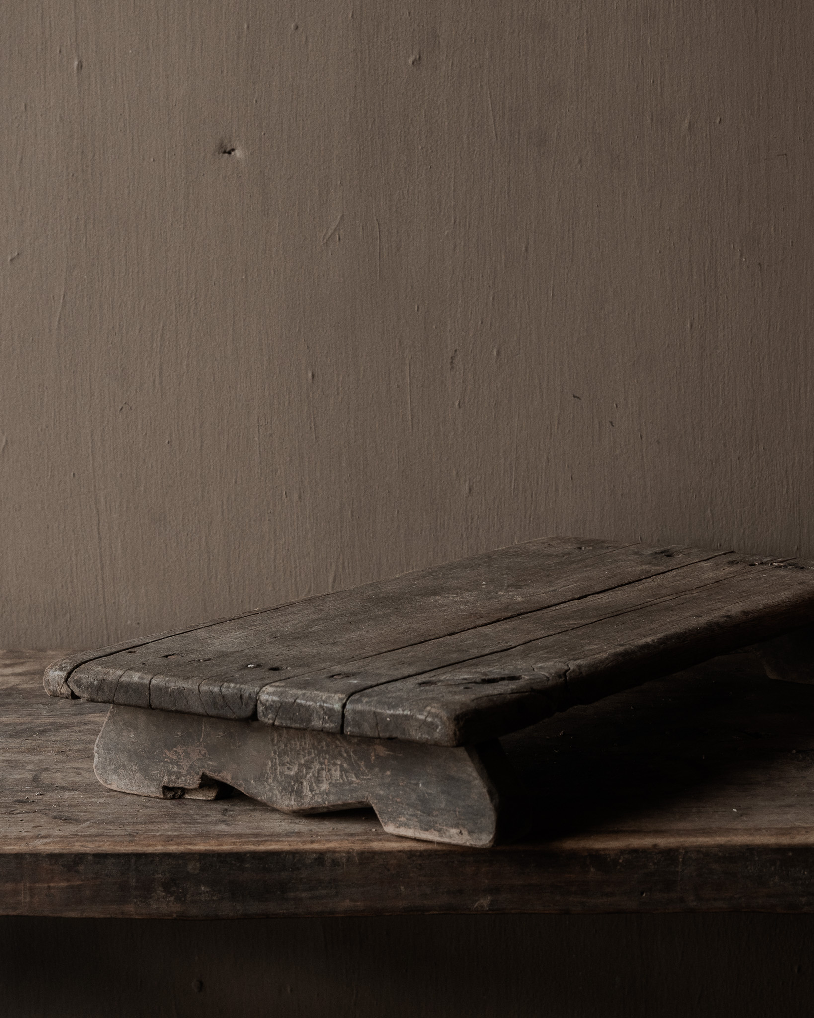 Pure, robust, and authentic: this low , antique wooden worktop from India is a beautifully weathered home object with a simple, rustic look. Originally, this worktop was used as a low work table in the home—a sturdy surface for preparing food, sorting grains, or supporting heavy pots and bowls.