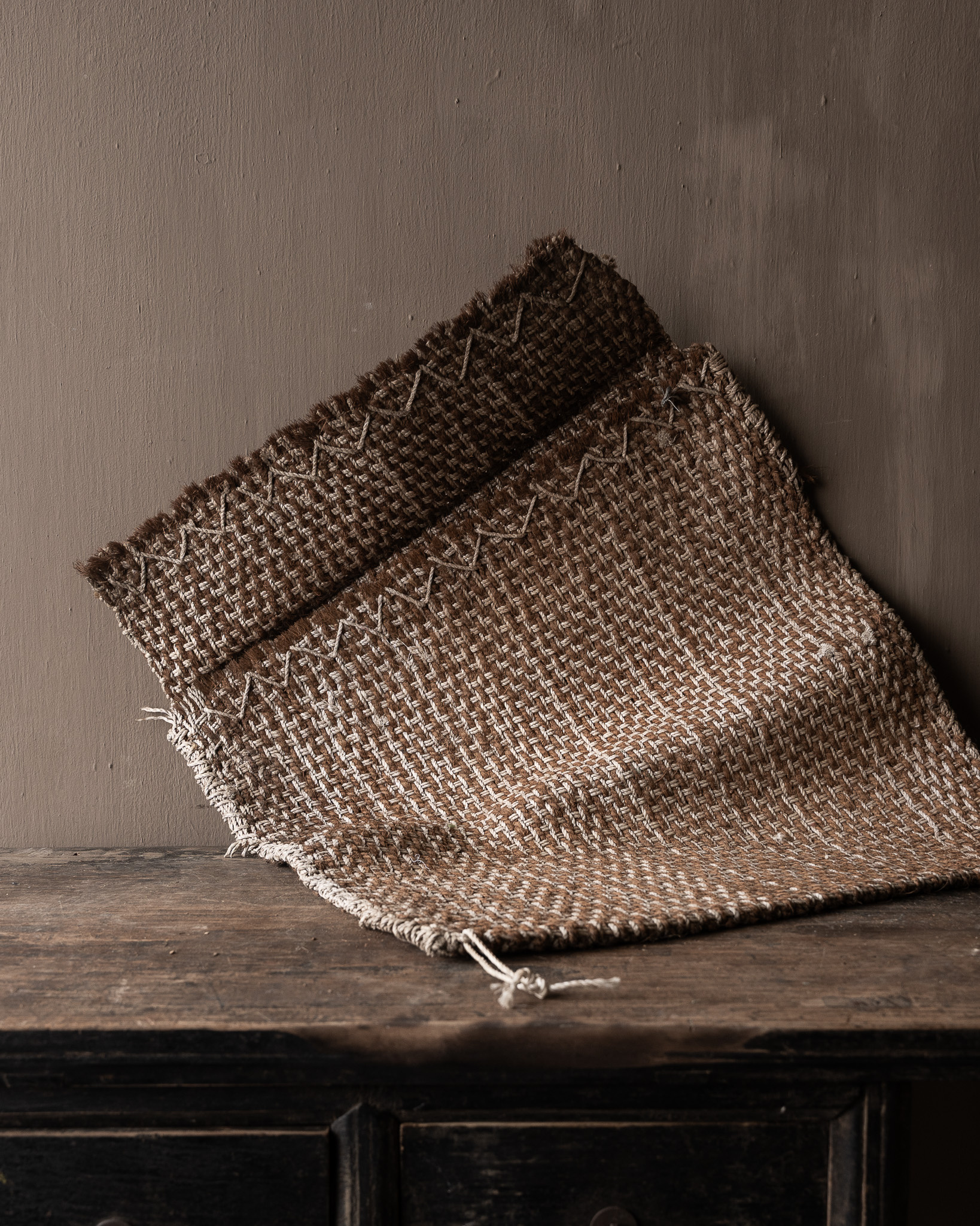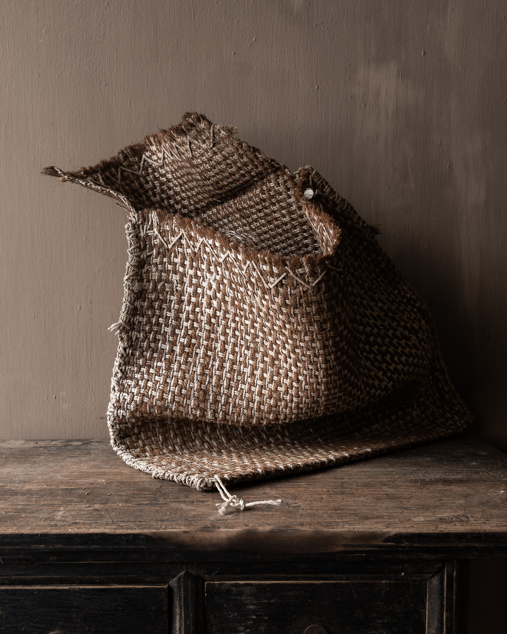 This beautiful, weathered olive bag is a unique and atmospheric piece from Southern Europe. Handwoven from sturdy natural fibers and featuring distinctive stitching and patina.