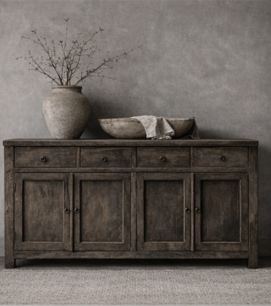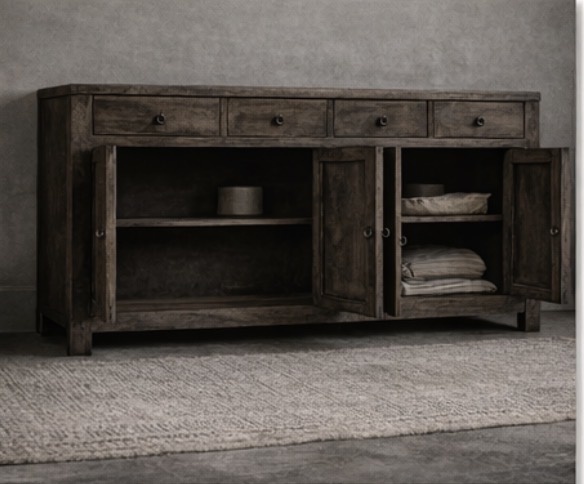 The combination of drawers and cupboard doors makes this sideboard practical to use and ideal for storing tableware, linens, or other home accessories. The simple design and understated details give the piece of furniture a timeless look that fits effortlessly into a country, wabi-sabi, or industrial interior.