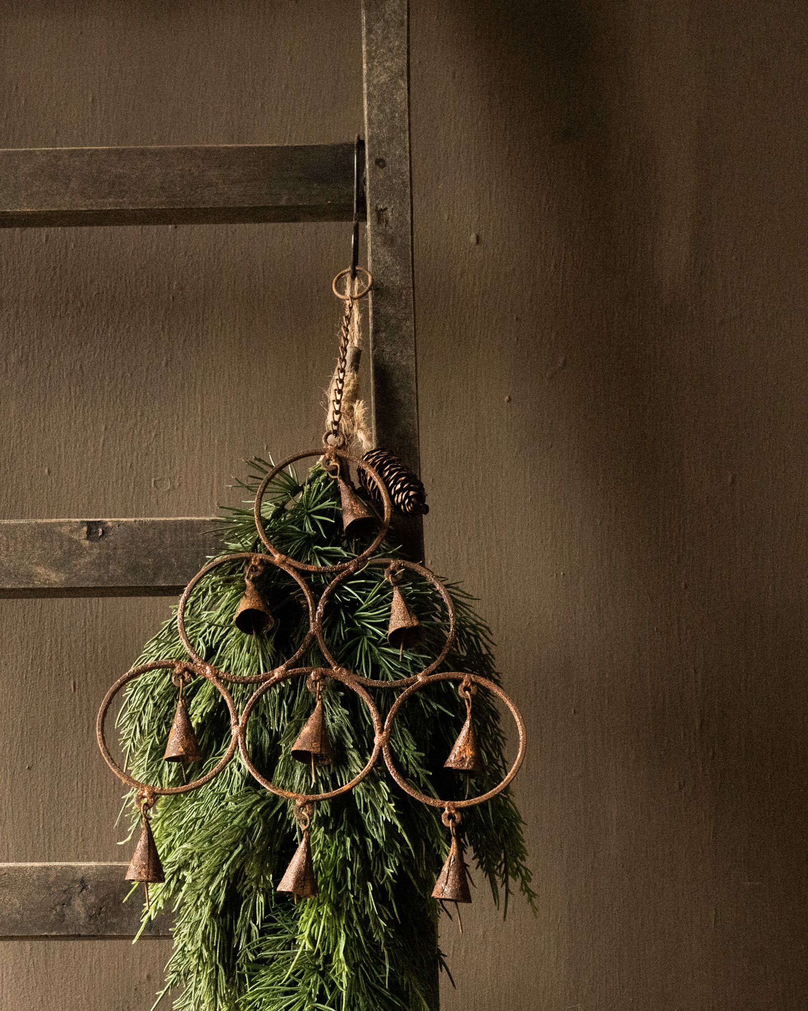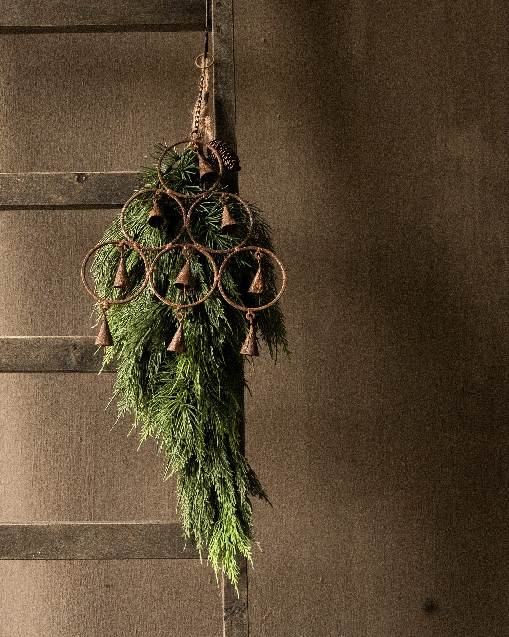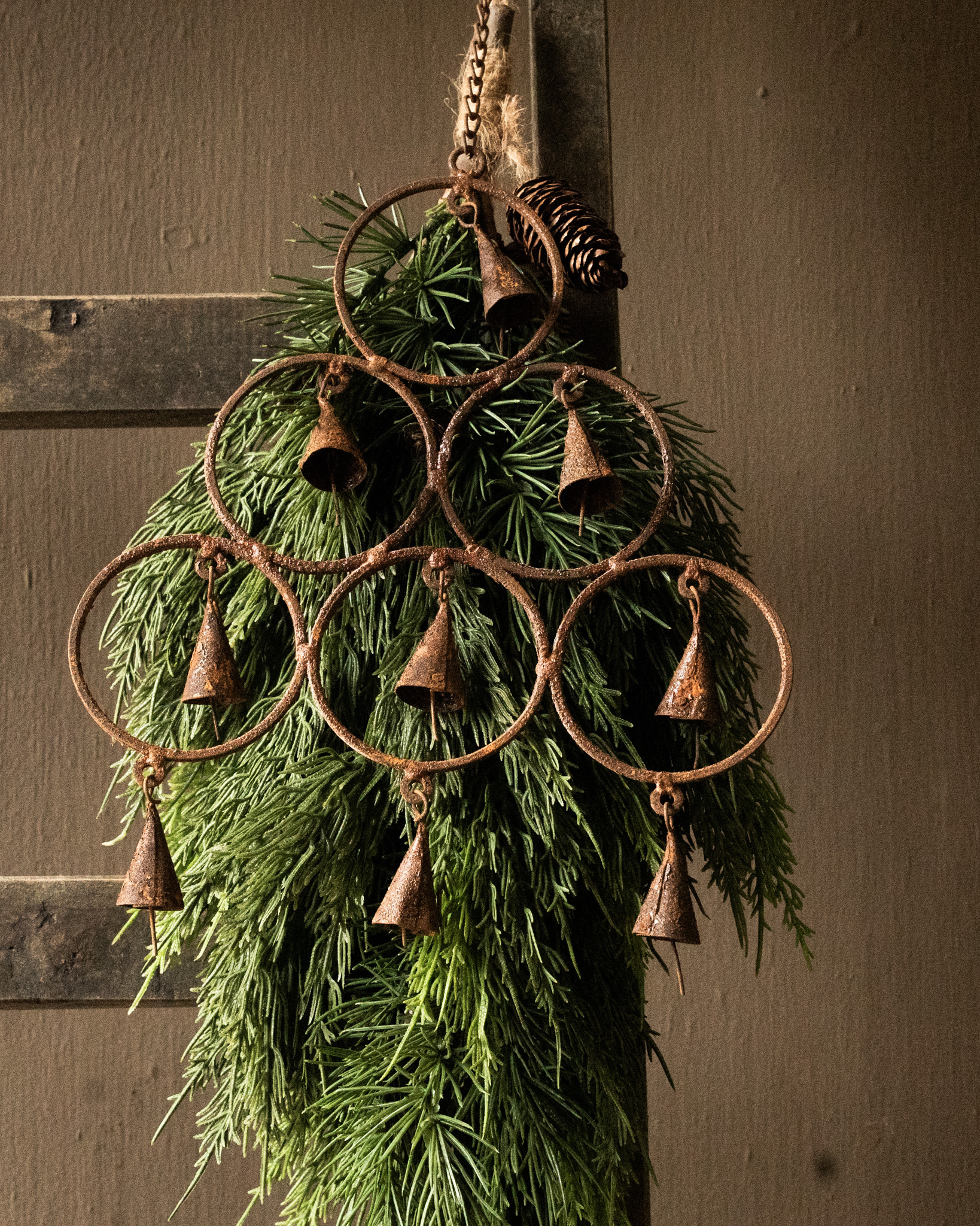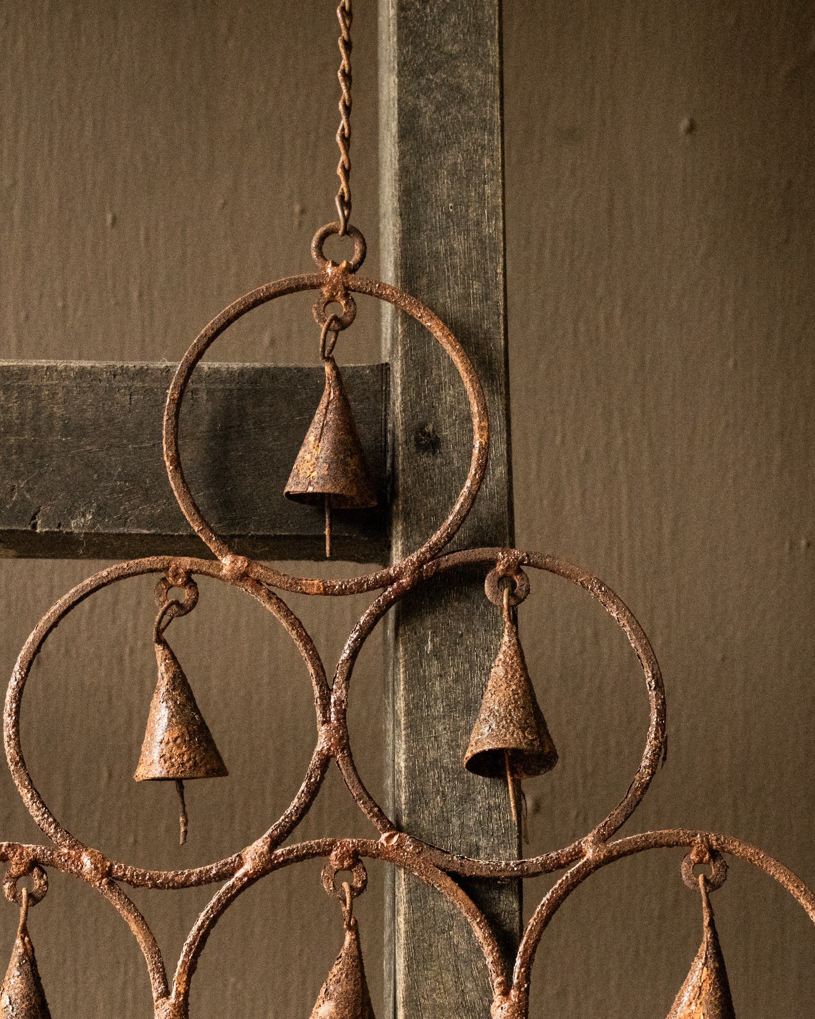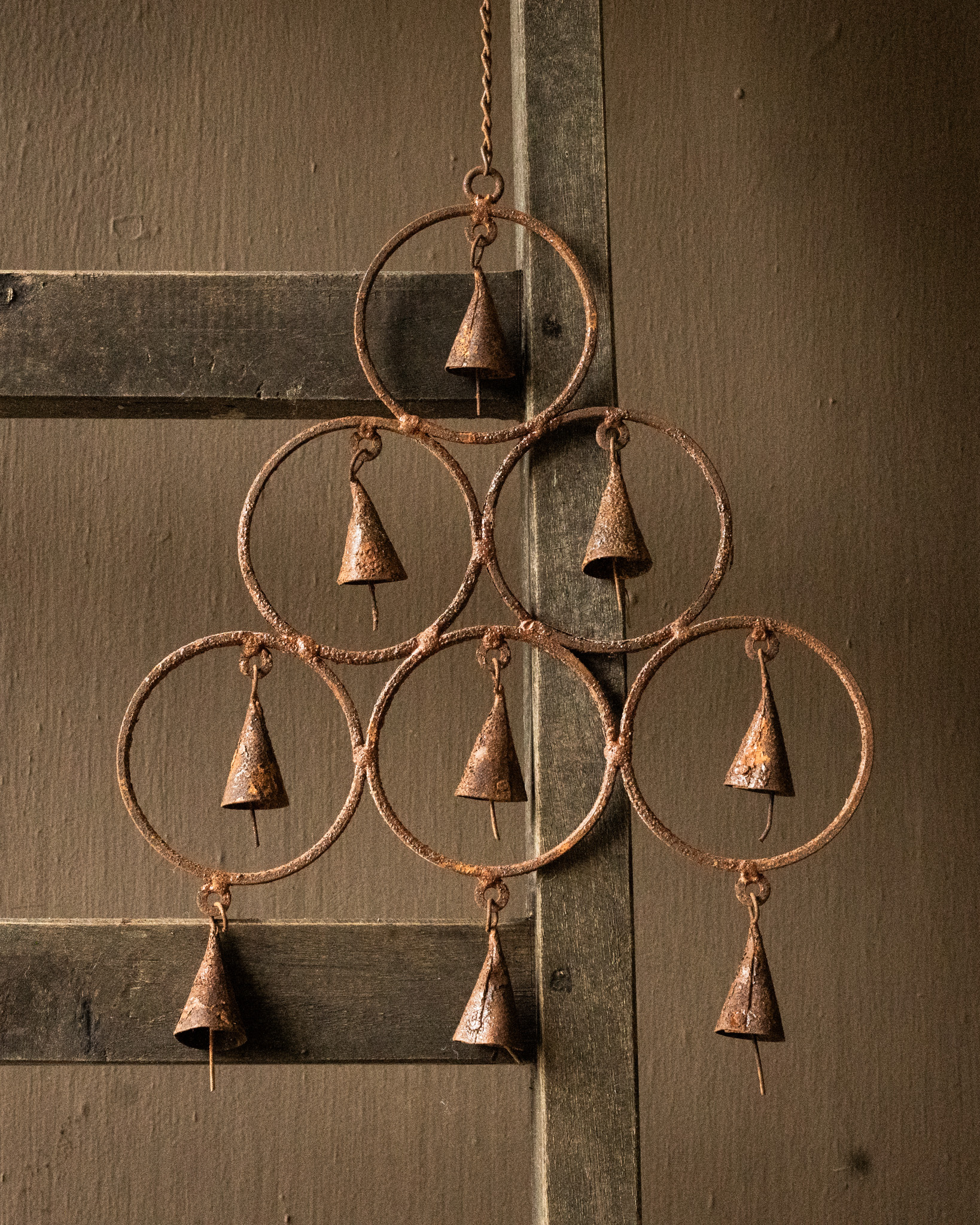 Atmospheric pendant made of rusty iron with small bells — a sturdy and decorative accent with a weathered, authentic look.