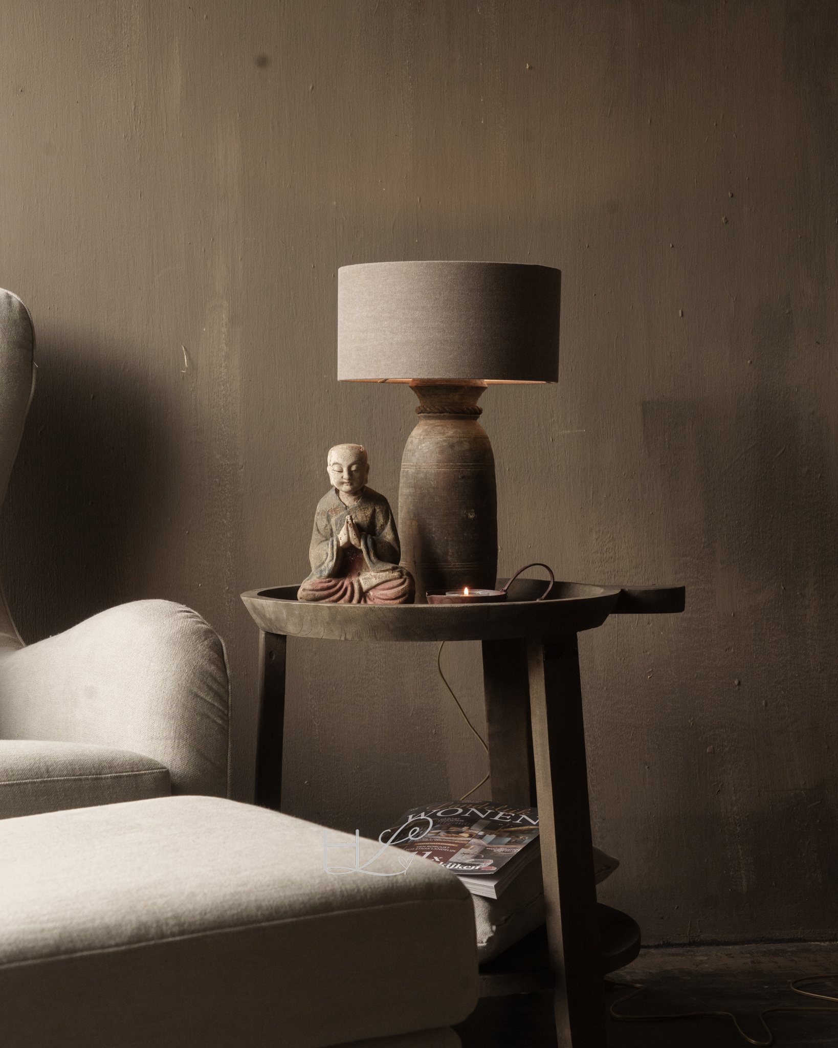 Place it next to the sofa with a nice candle, cup of coffee or magazine