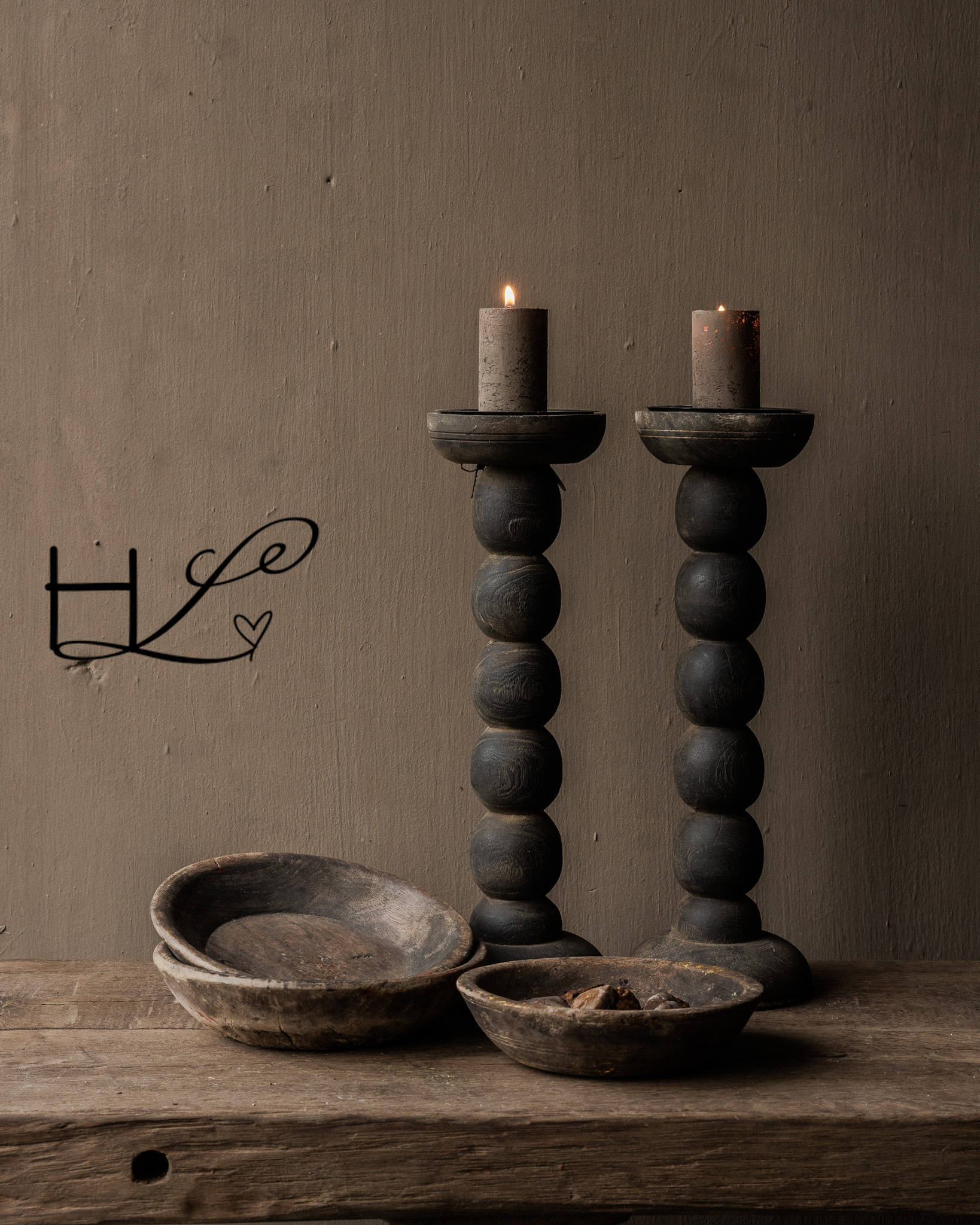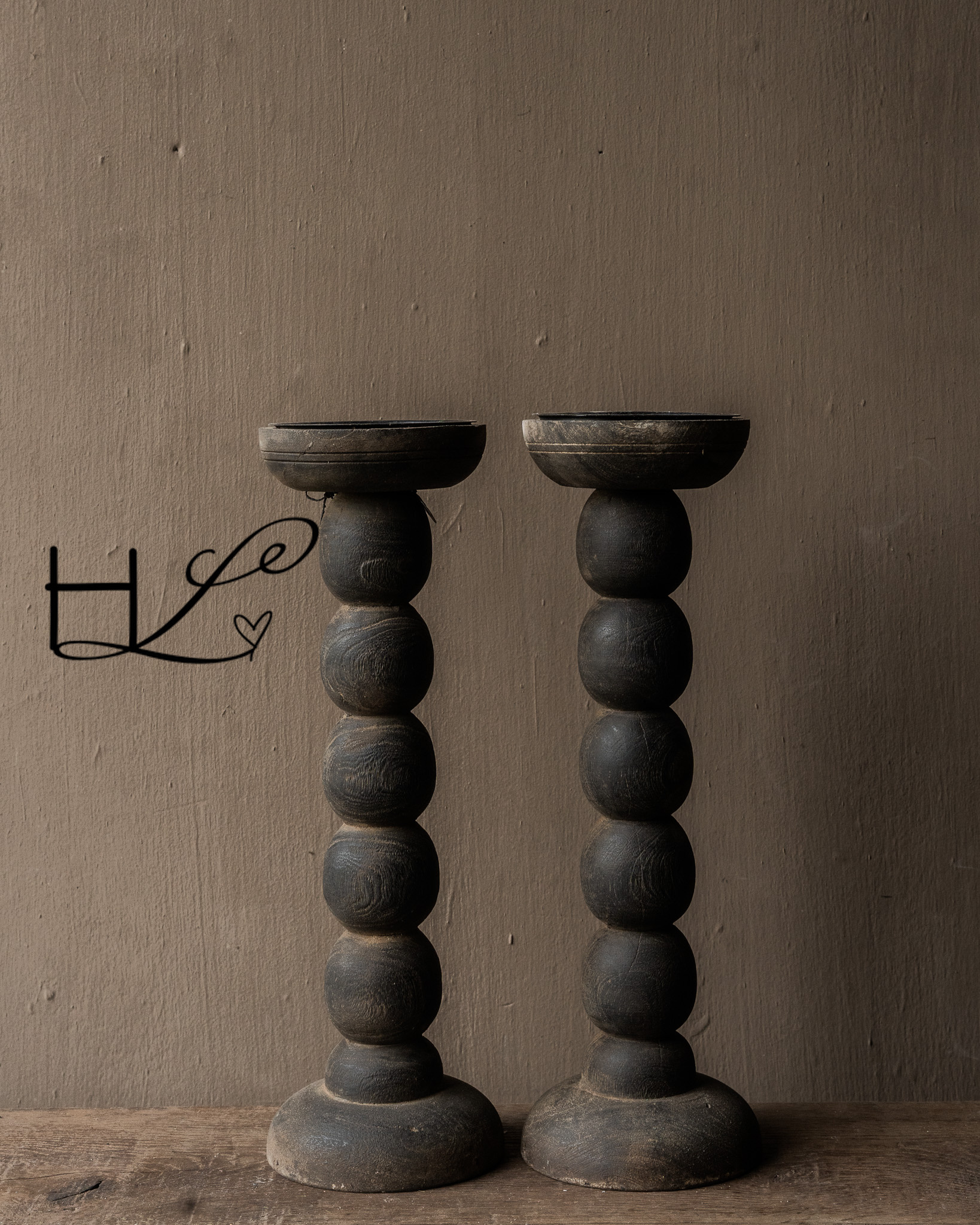 This robust wooden candlestick exudes character and a sense of lived-in character. With its soft curves, dark patina, and visible signs of wear, each piece tells its own story. The weathered wood and handcrafted finish create a warm, understated look that fits perfectly into a rustic, wabi-sabi interior.