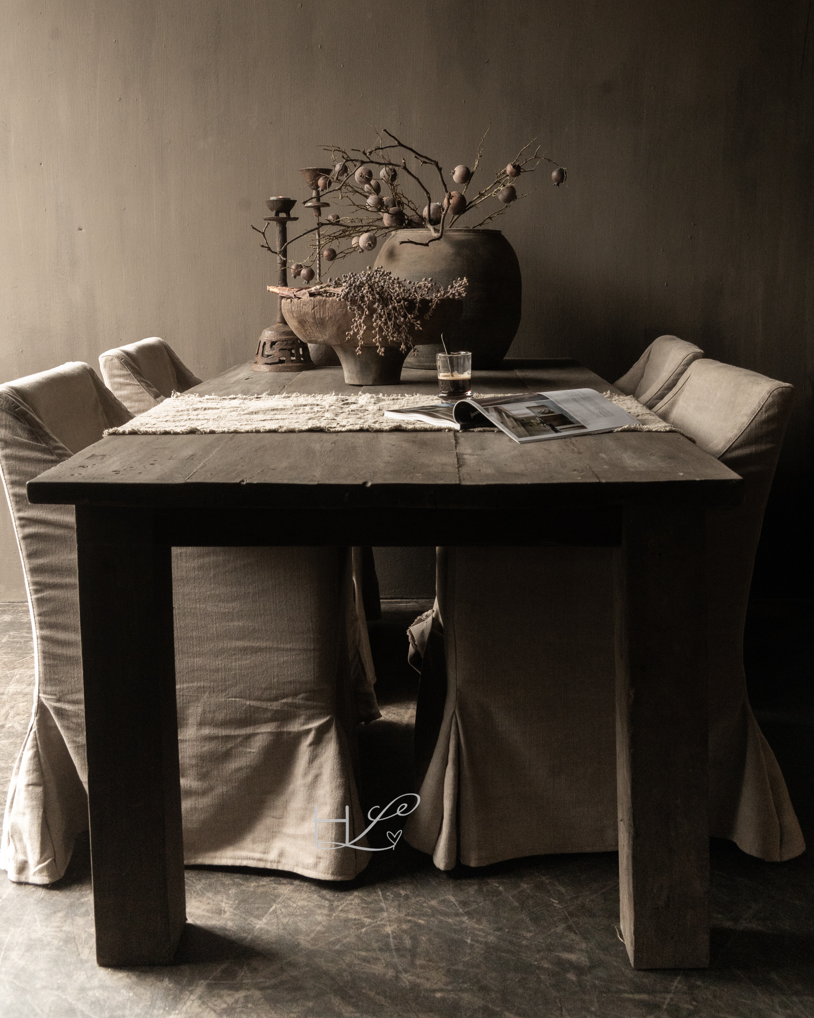 Rugged, weathered, and full of character – this robust dining table from the Old Farm collection by Aura Peeperkorn is crafted from reclaimed, weathered wood with a deep, warm, grayish hue. Each piece is unique and bears the marks of a rich past. The table exudes a rustic simplicity, with a pure look that fits perfectly into a minimalist, stylish interior.