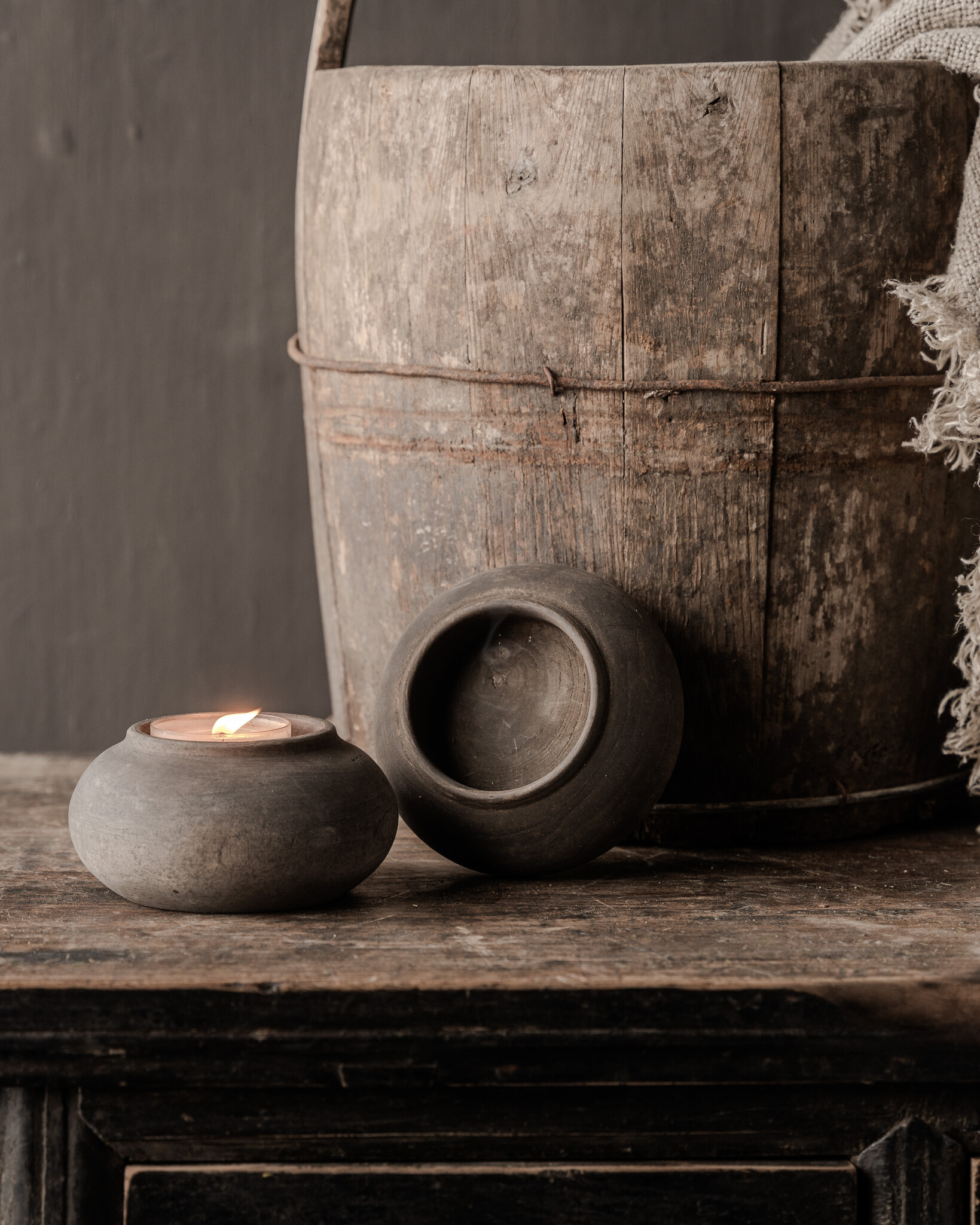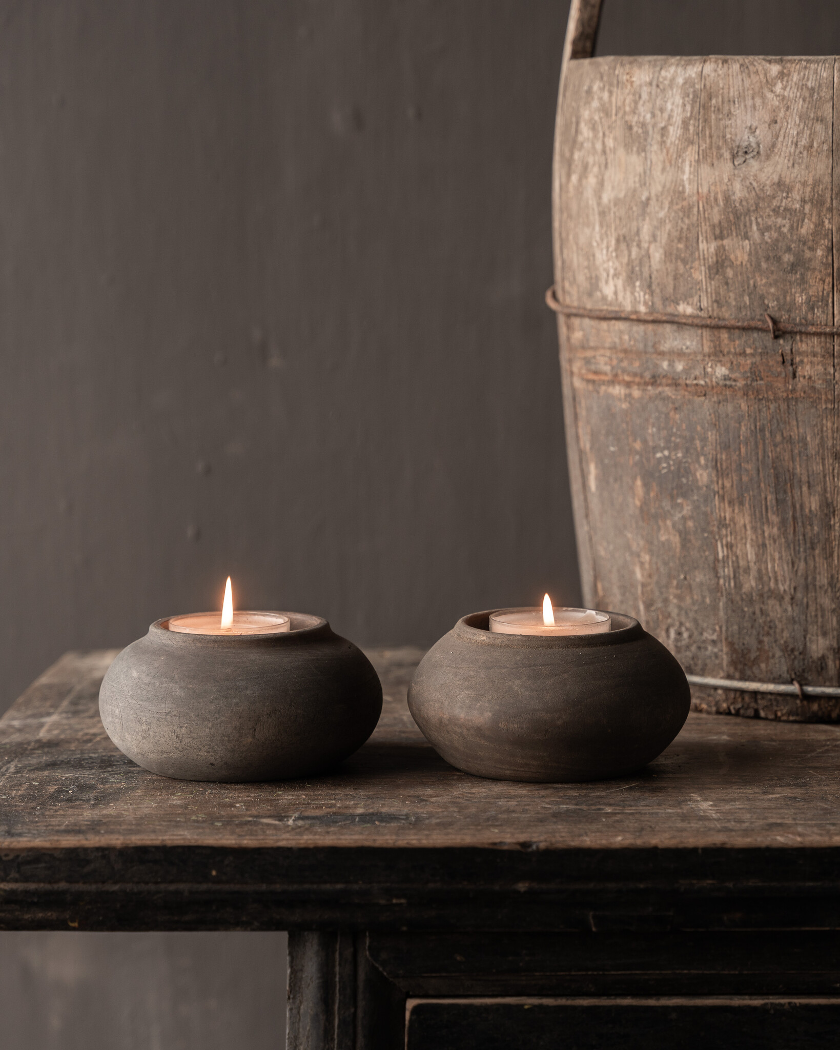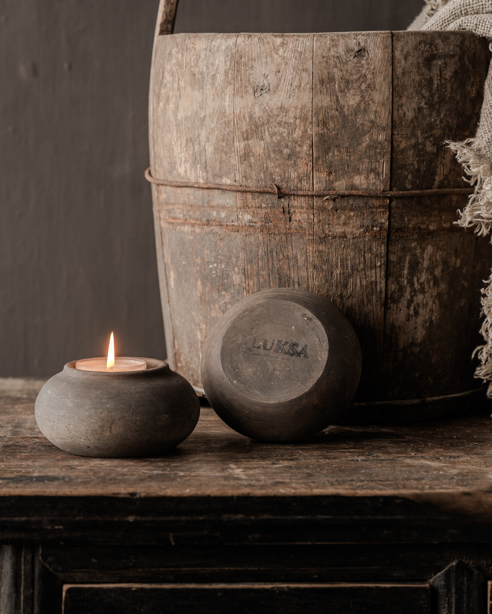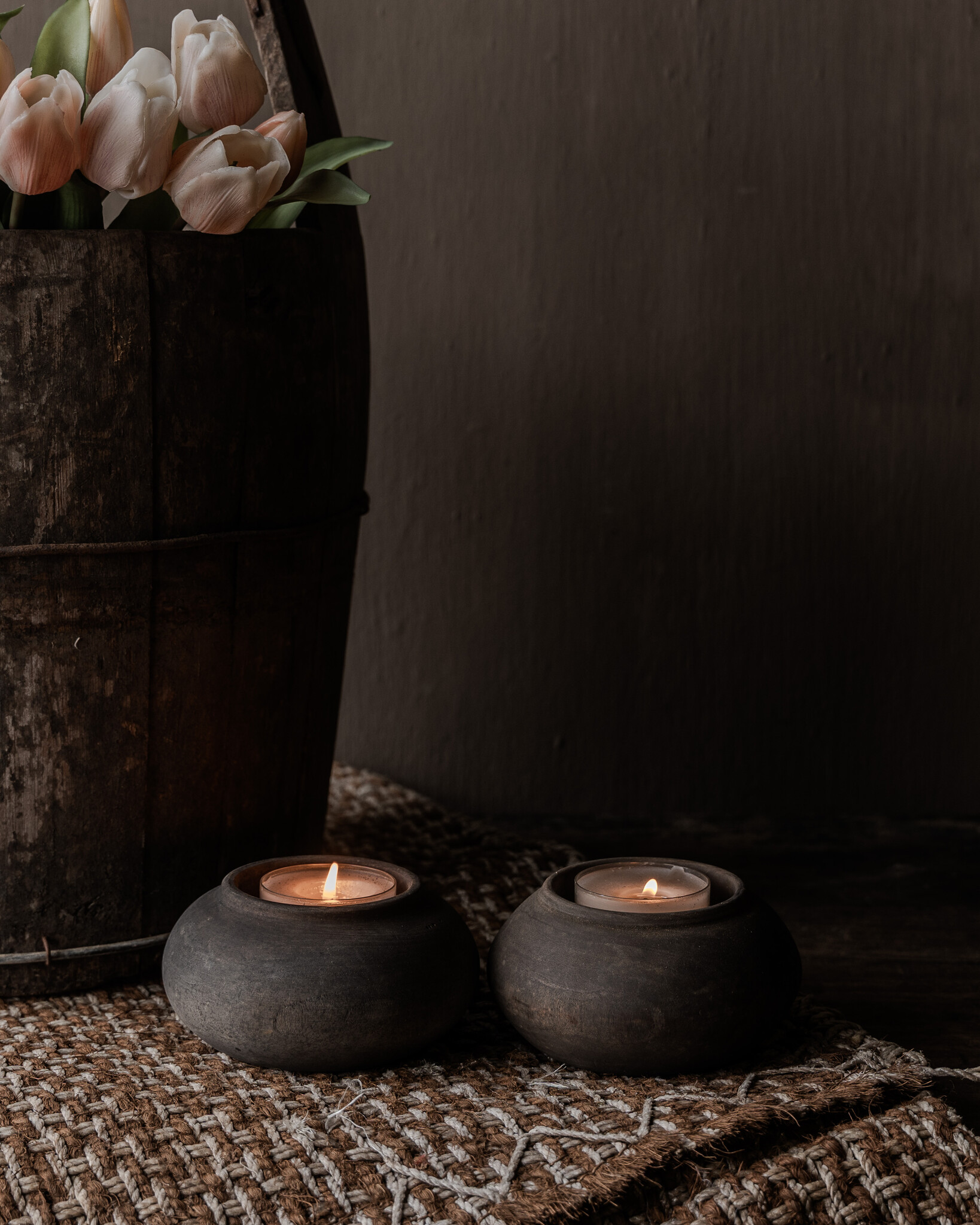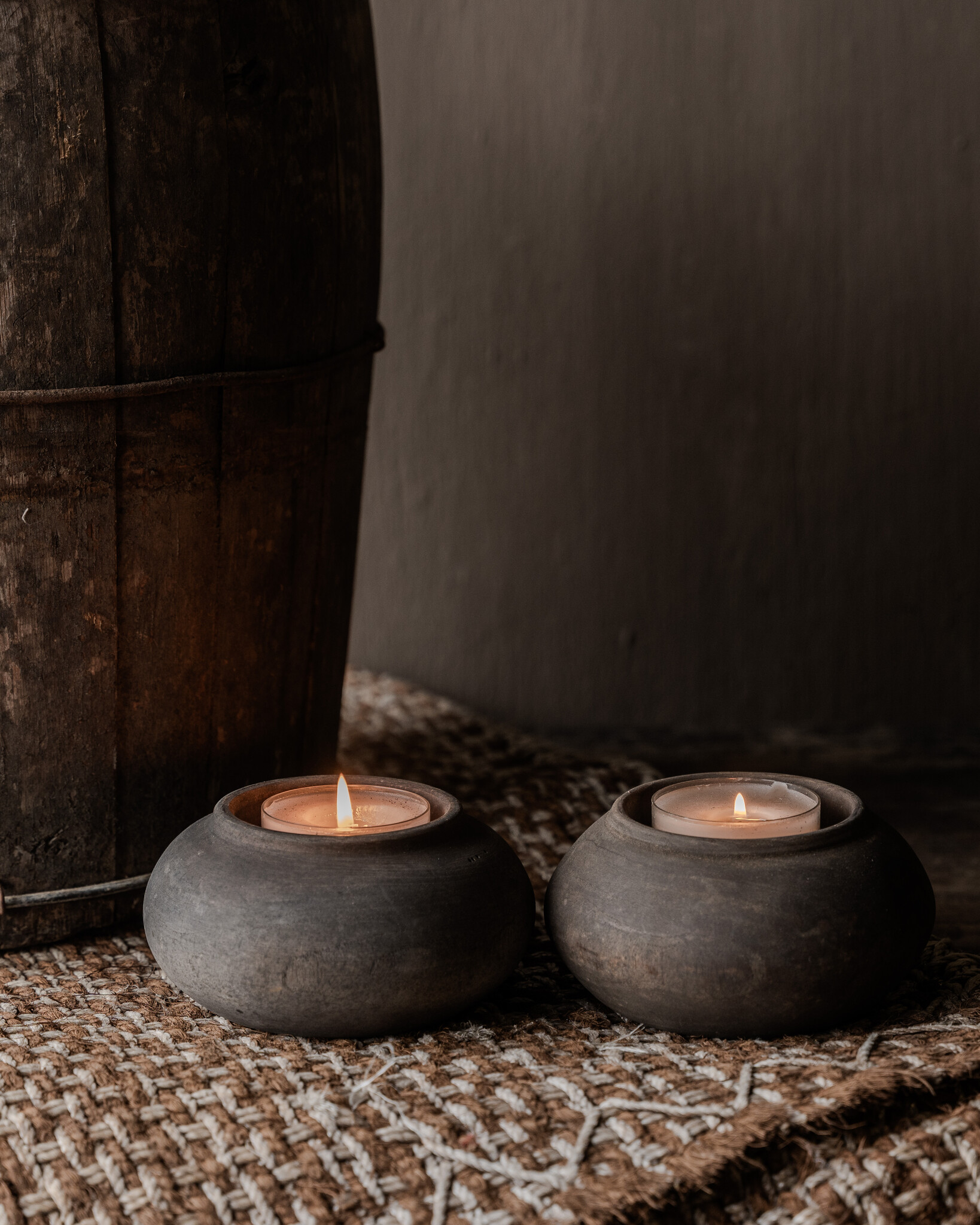 This handmade tea light holder is crafted from robust, dark earthenware with a matte, natural finish. The rounded, slightly organic shape and the raw feel of the material create a warm, serene atmosphere – perfect for a simple, rustic interior.