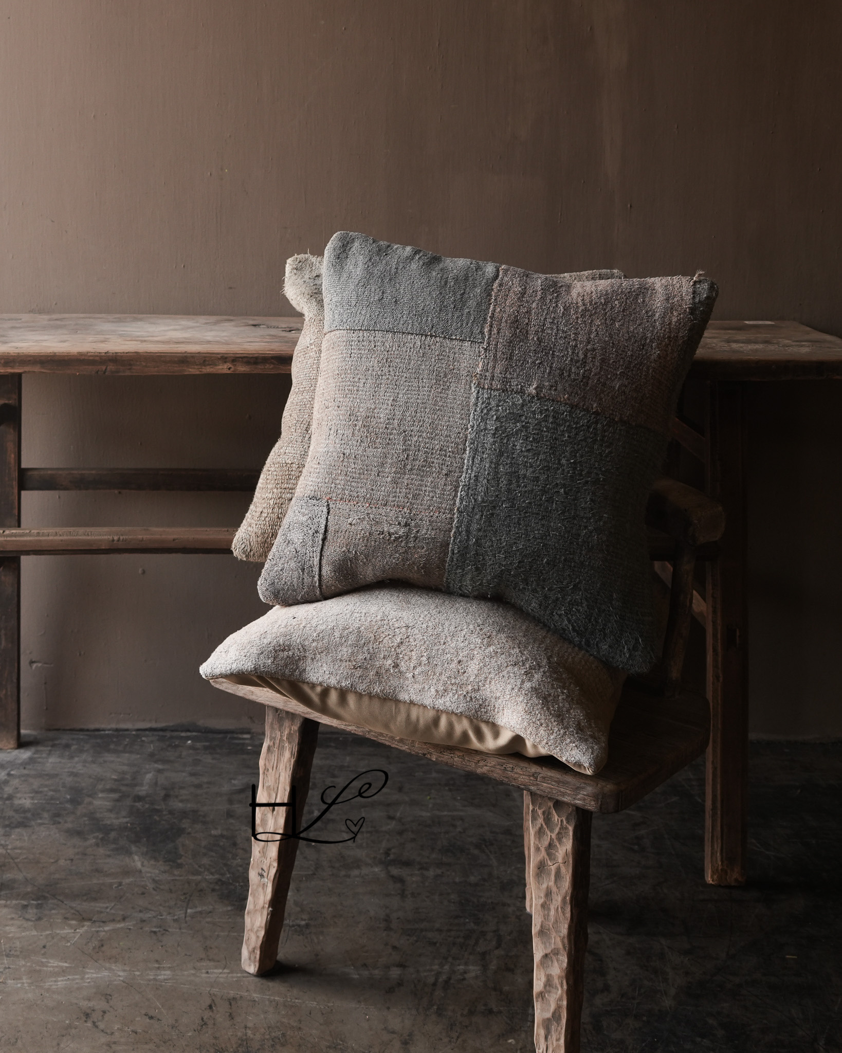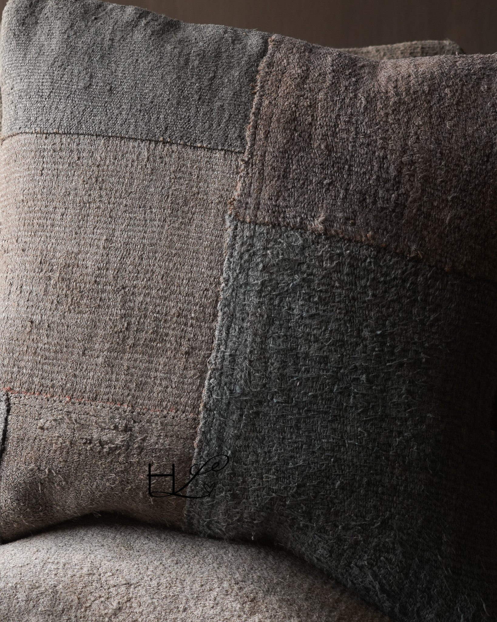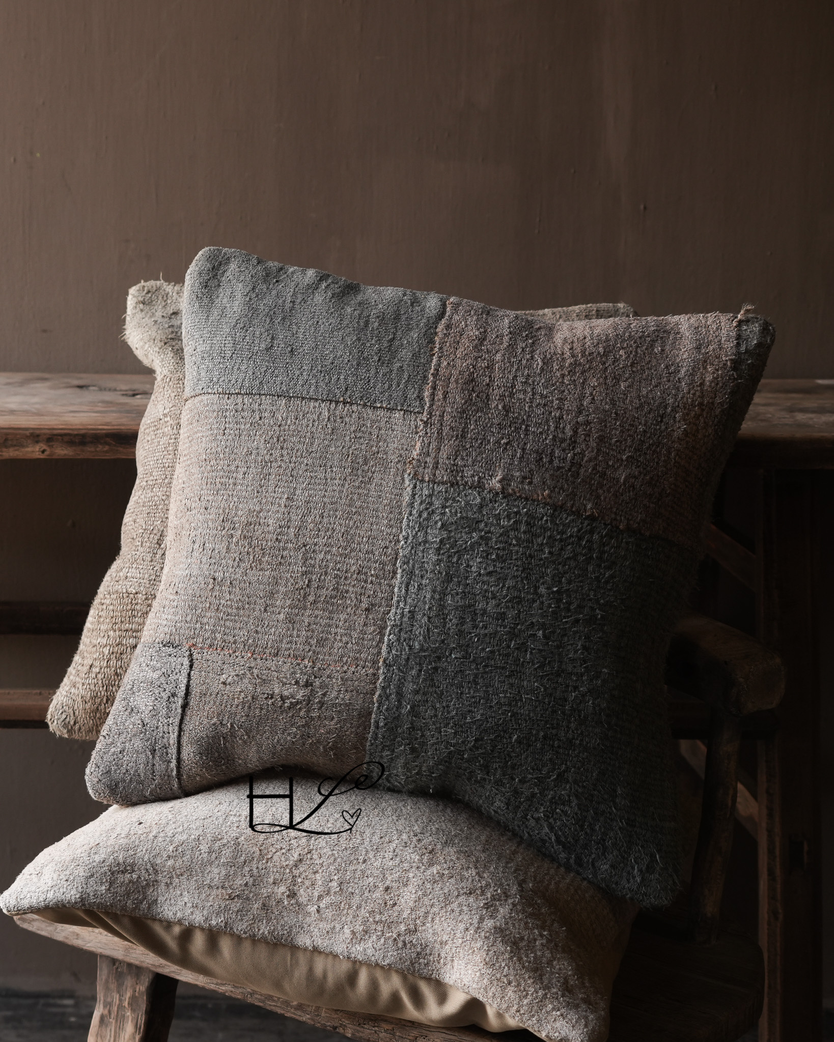 The cushion is made from various pieces of old hemp fabric, creating a beautiful patchwork effect . The coarse weave and slight imperfections make each cushion unique and create a natural look that fits perfectly in a rugged, understated, and rustic interior .