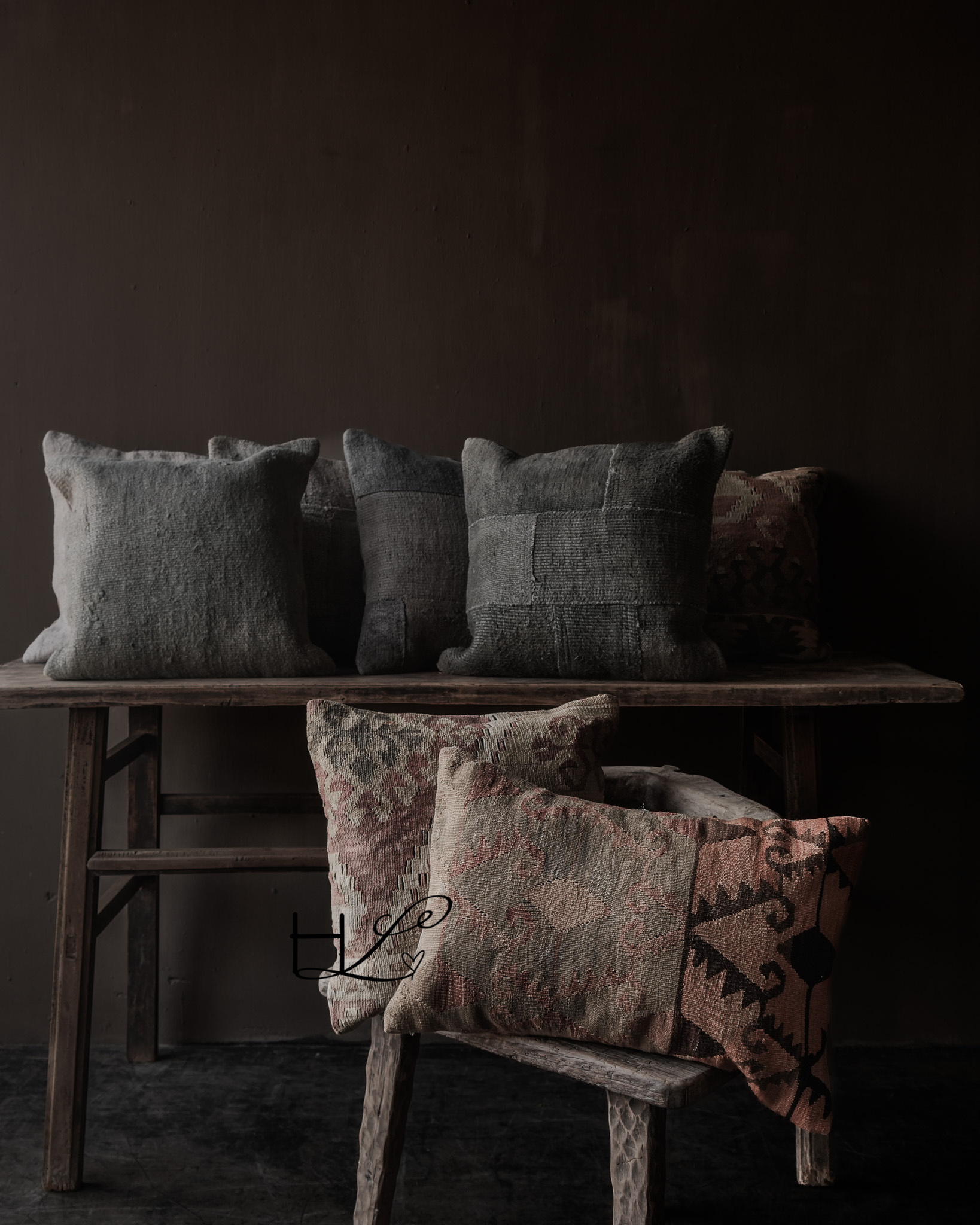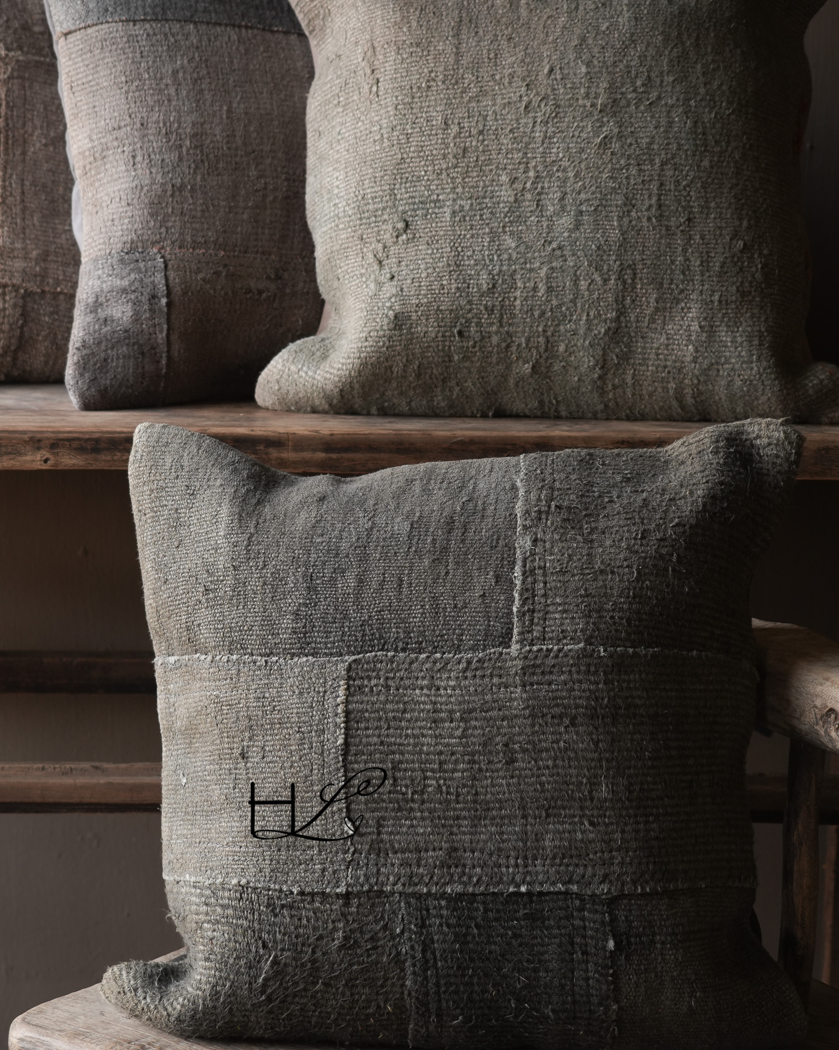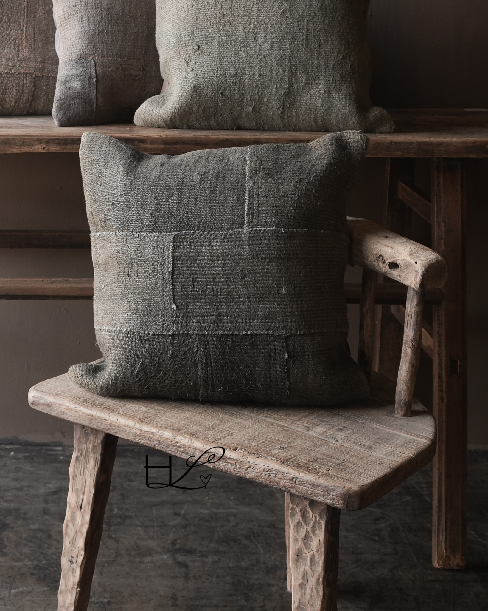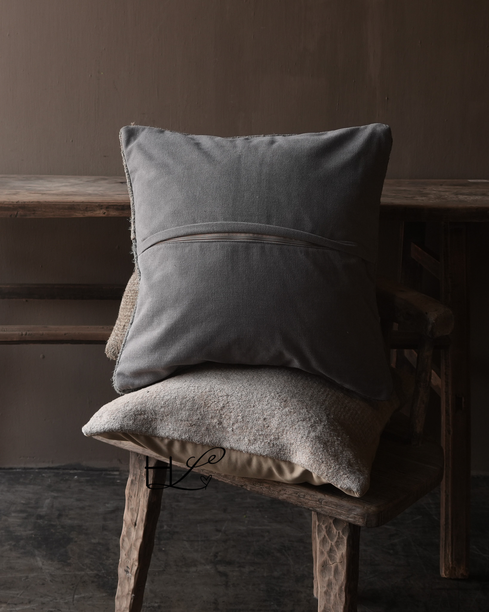 Bring warmth and character into your home with this beautiful, handmade cushion crafted from vintage textiles. Each cushion is unique, crafted from a coarsely woven, distressed material with subtle imperfections and visible traces of its past. The natural hues and robust texture are perfect for a wabi-sabi, country, or bohemian interior. They look stunning on a sofa, armchair, or as a charming accent on a bed. Combine multiple cushions for a playful and authentic look.