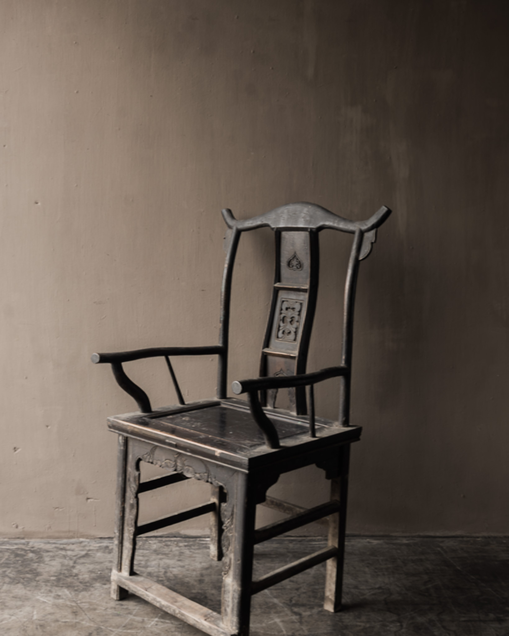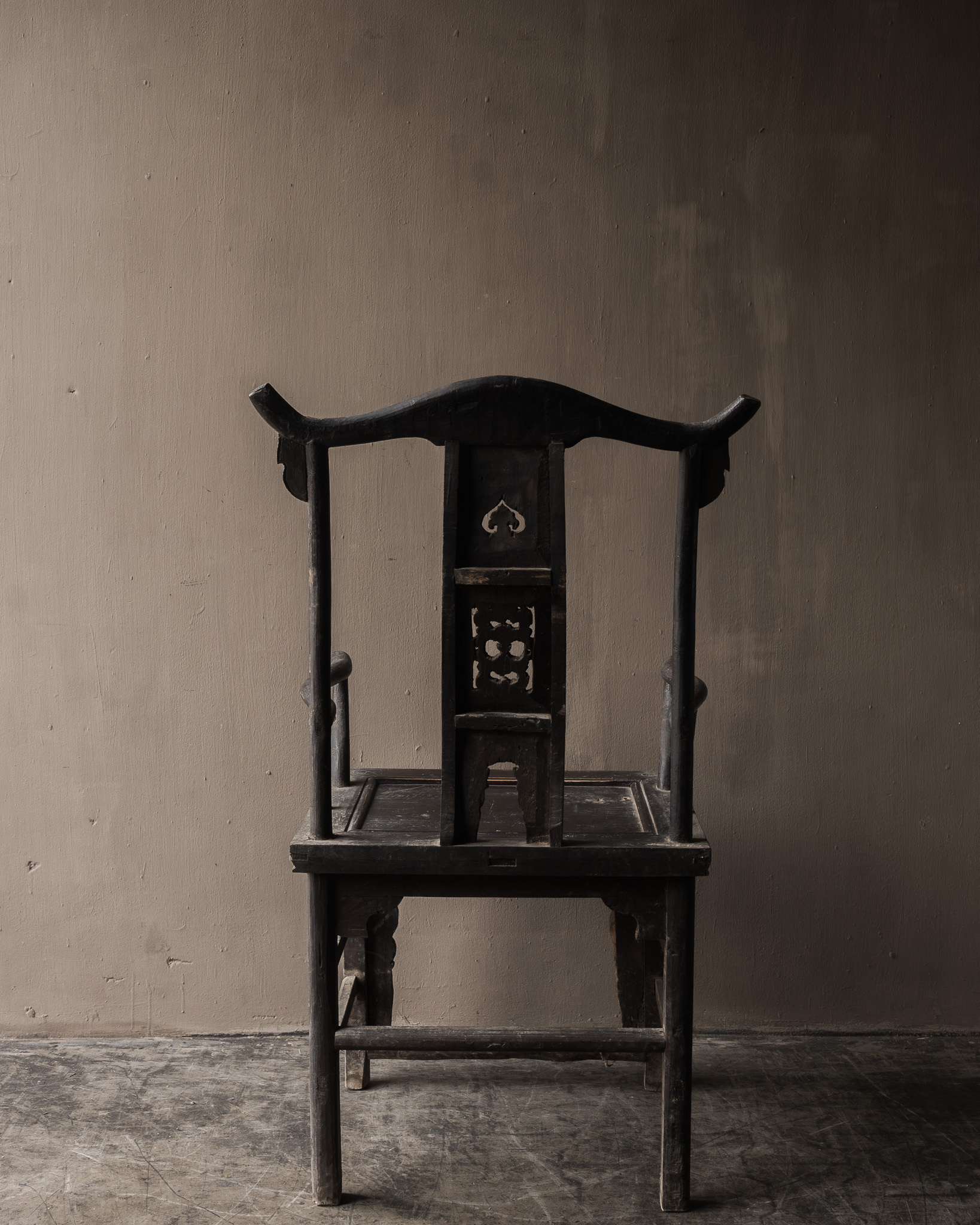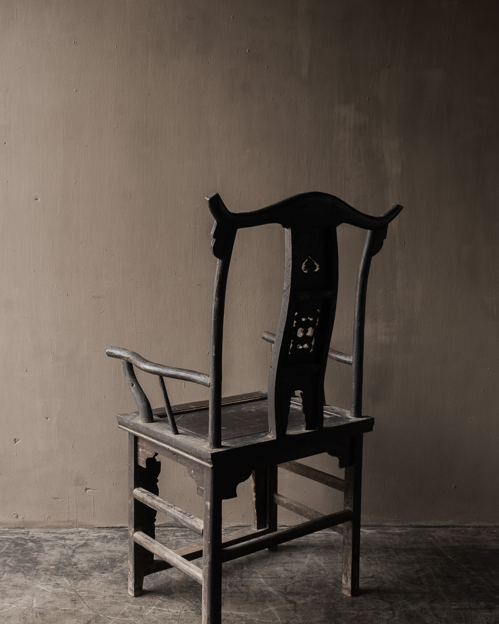 A unique, authentic Indian chair with a beautiful, weathered appearance. This handmade chair is rich in character, with refined carving details in the backrest and a beautifully shaped frame. The dark patina and visible signs of wear tell a story of many years of history.