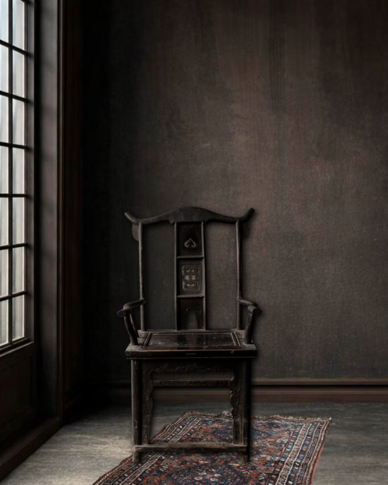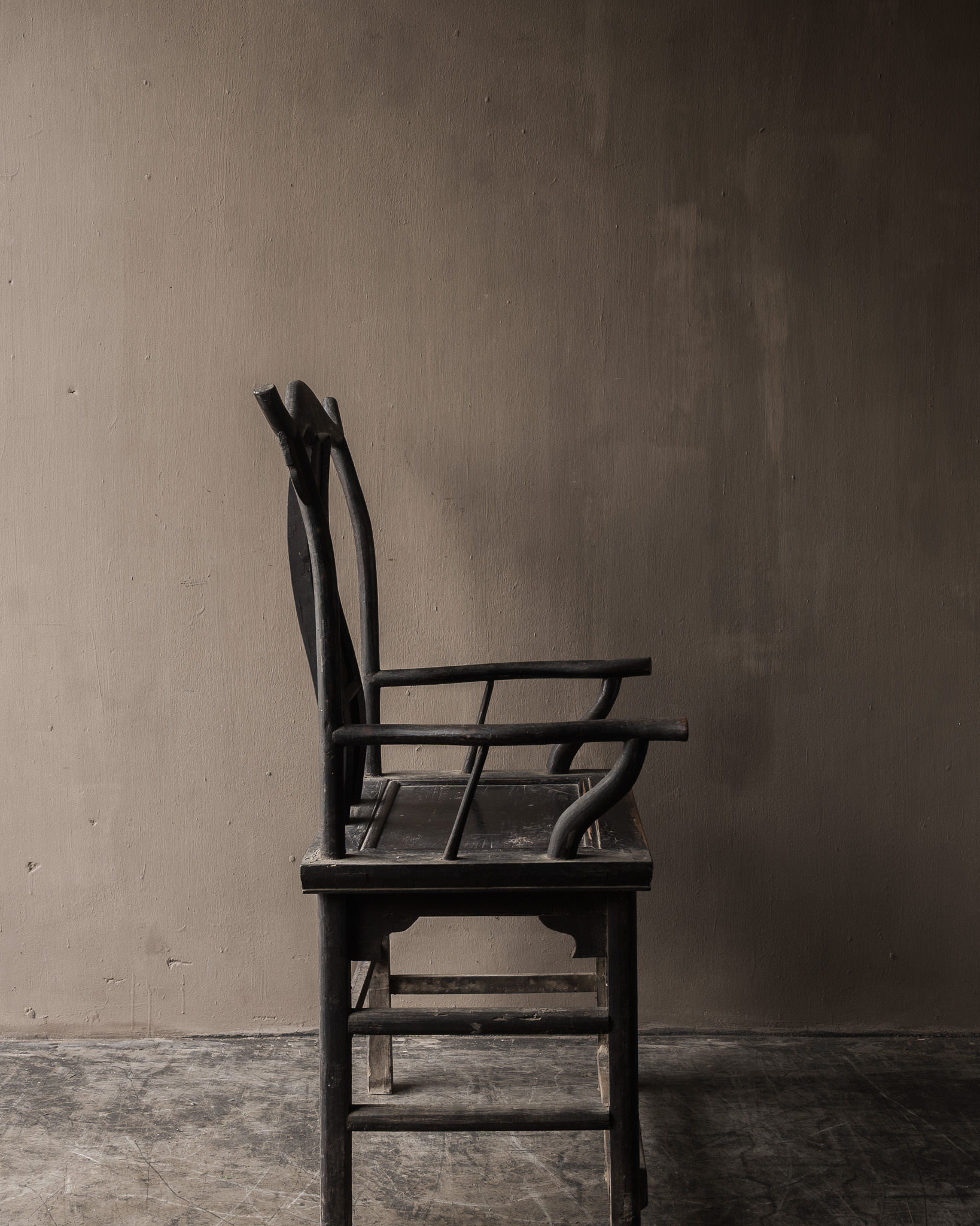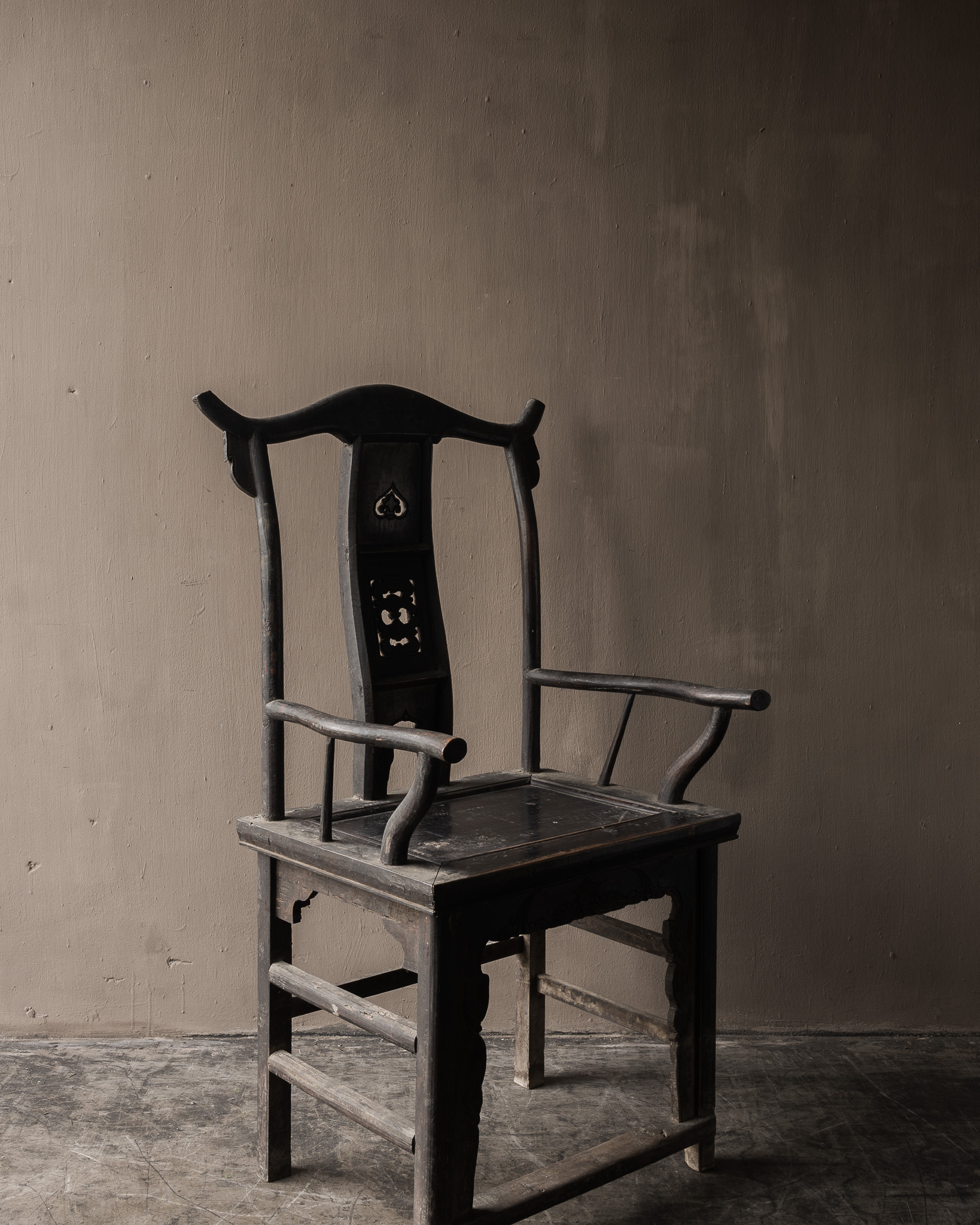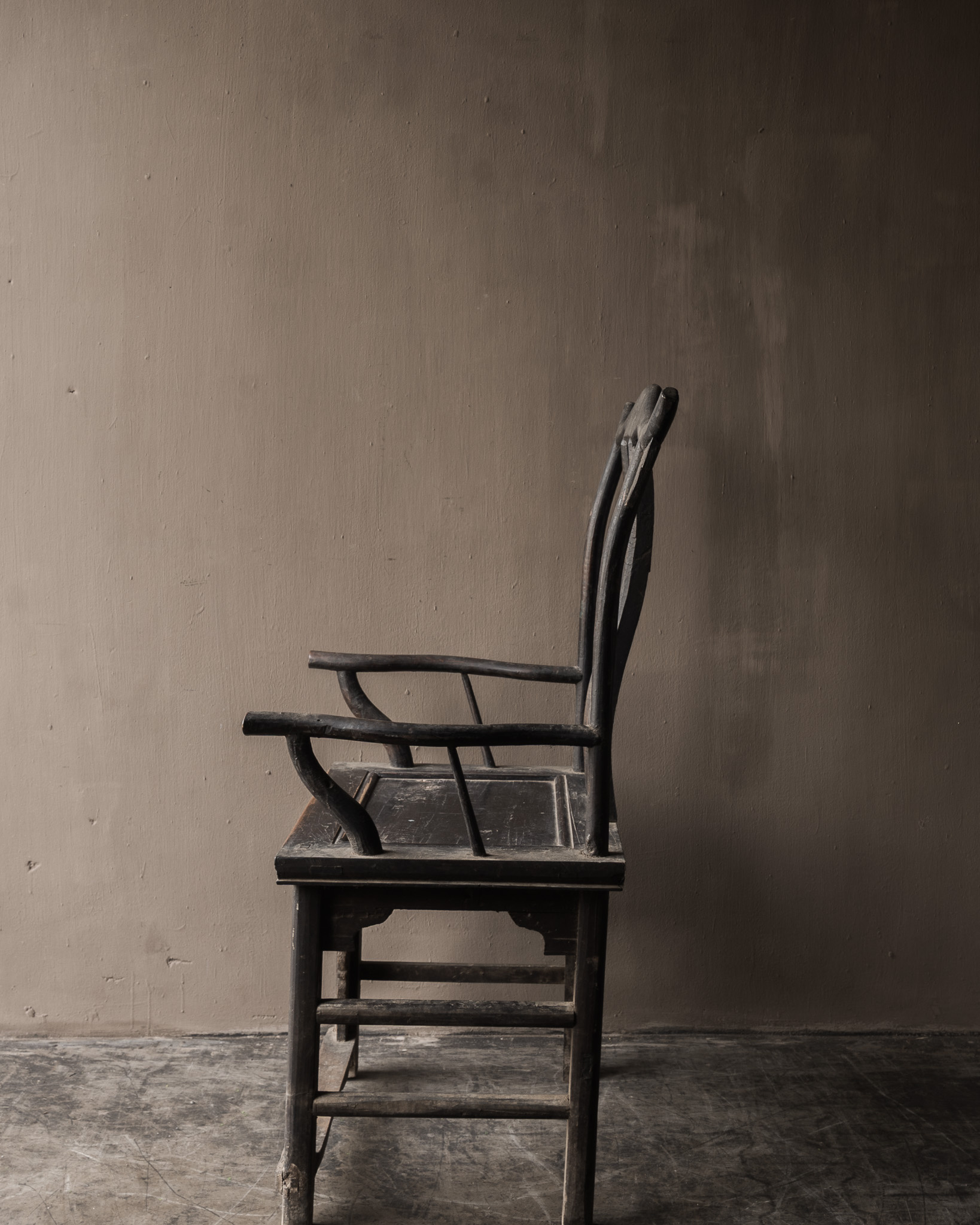 A unique, authentic Indian chair with a beautiful, weathered appearance. This handmade chair is rich in character, with refined carving details in the backrest and a beautifully shaped frame. The dark patina and visible signs of wear tell a story of many years of history.