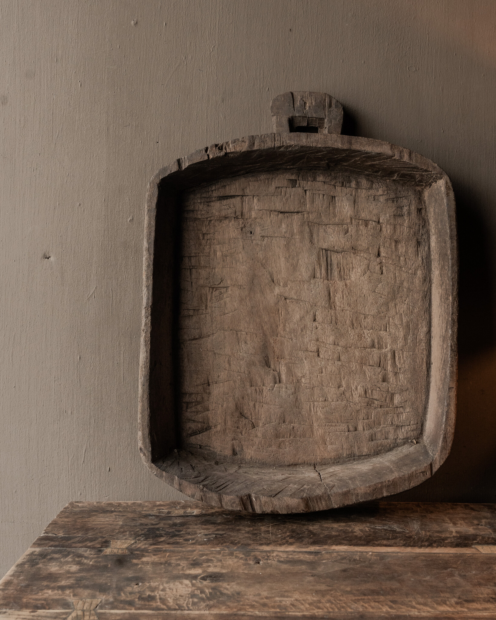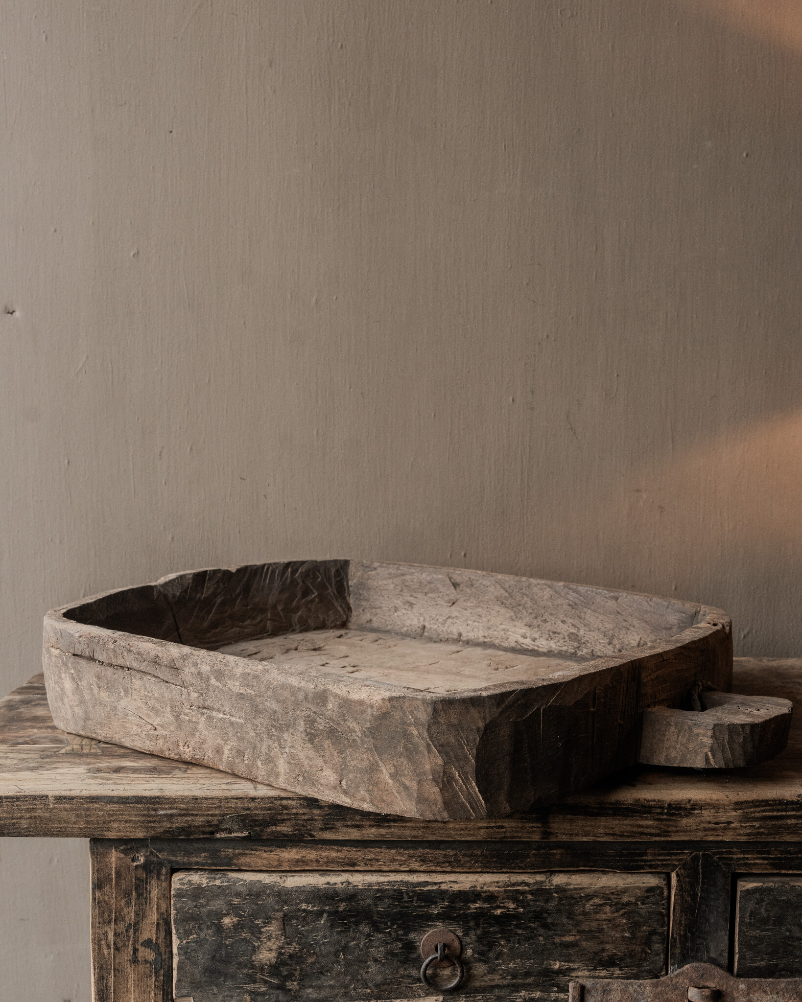 The trough is rectangular and features a handle, giving it an authentic, handcrafted character. The sturdy walls and solid wood give the trough a heavy, solid feel. Each piece is unique; no two troughs are exactly alike.